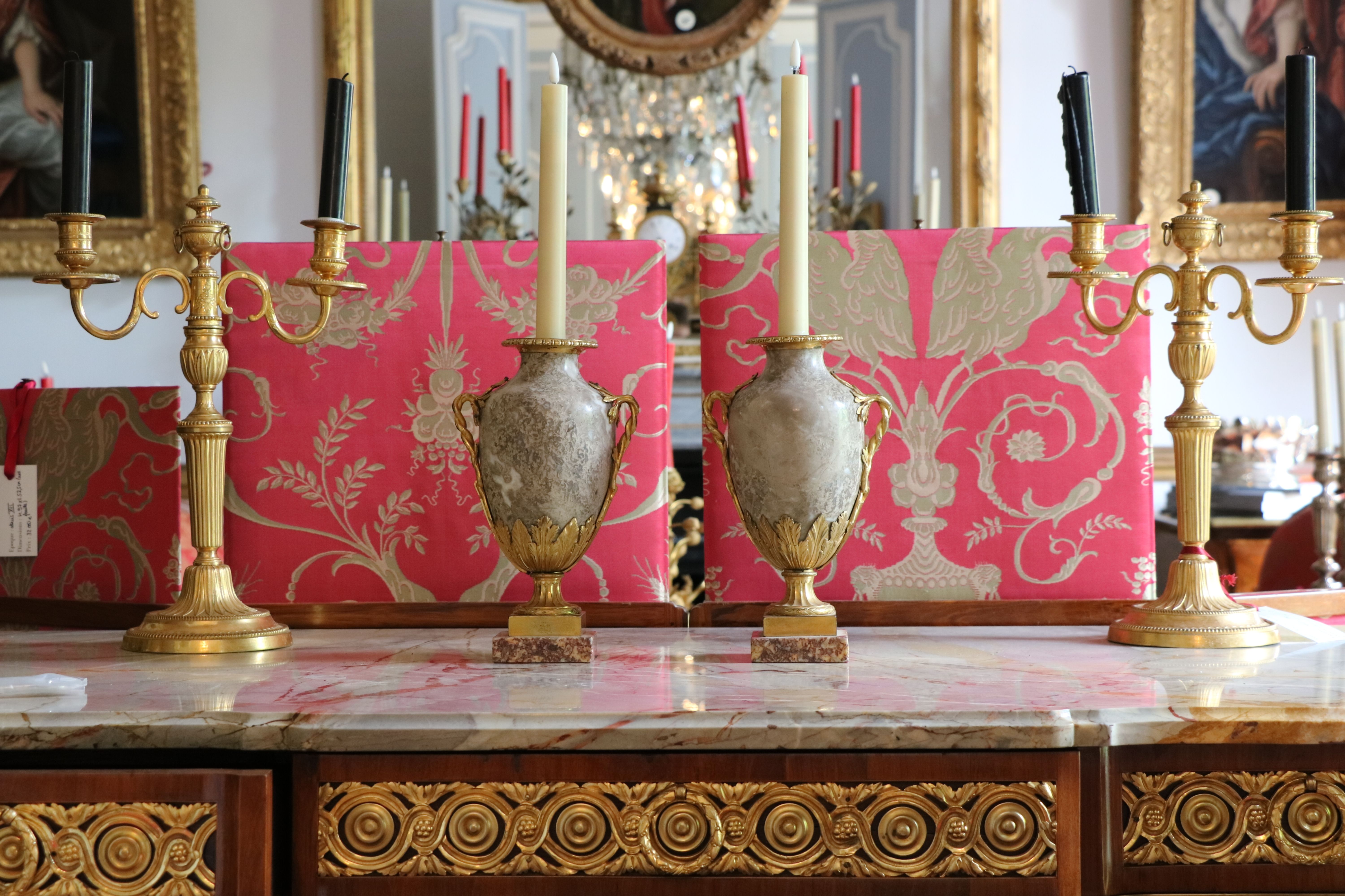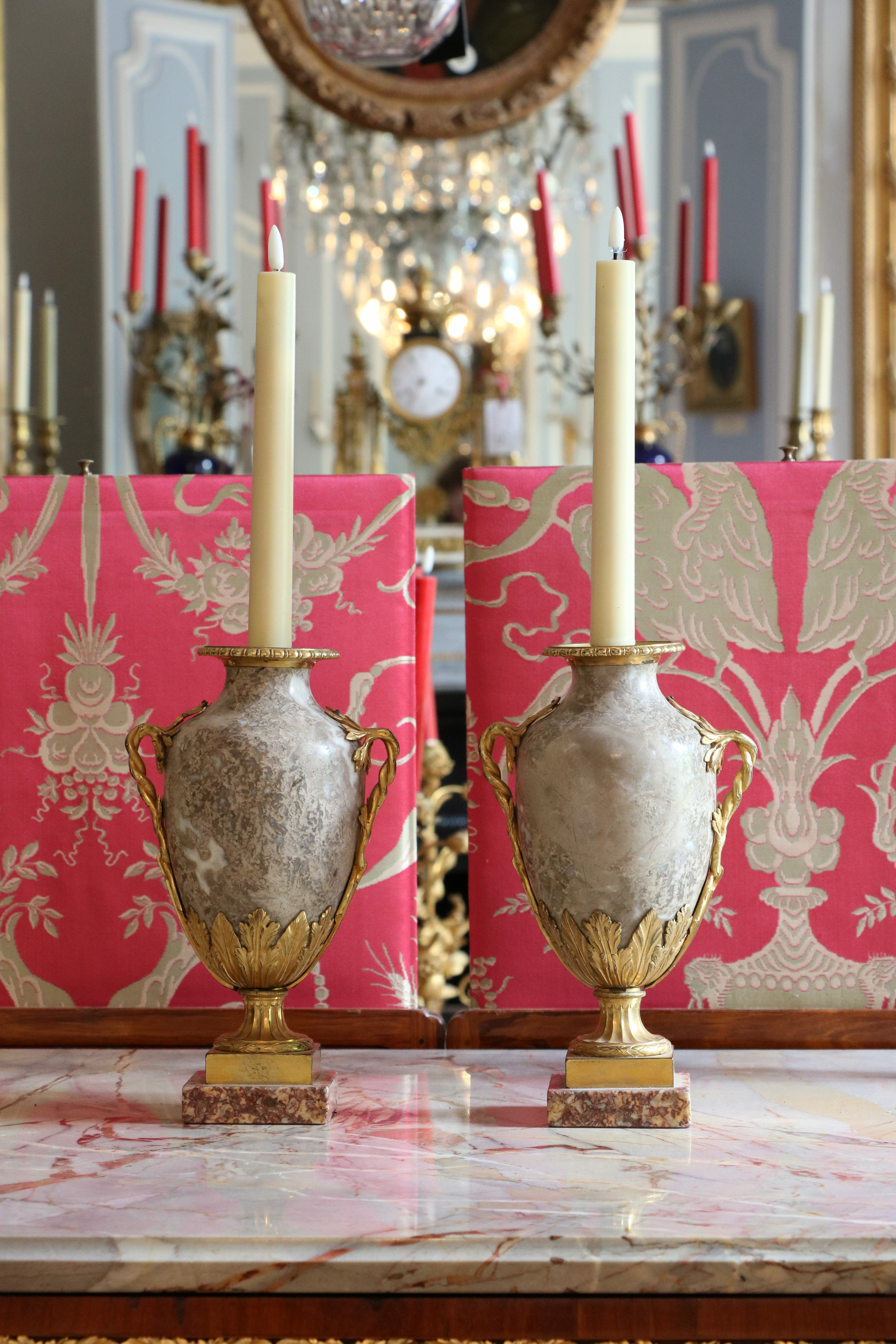 Paire de vases d'époque Louis XVI, en marbre Napoléon grand mélange, avec monture en bronze doré. L'anse en forme de branches entrelacées de feuilles de laurier épouse la forme pansue du vase à ses attaches. Des feuilles d'acanthe englobent son pied trompette, orné de guirlandes de laurier. Une bobèche dorée repose sur l'embouchure, et donne ainsi au vase la fonction de bougeoir. Le vase repose sur un socle carré en marbre brocatelle d’Espagne. Epoque Louis XVI Etat d’usage H. 25 cm