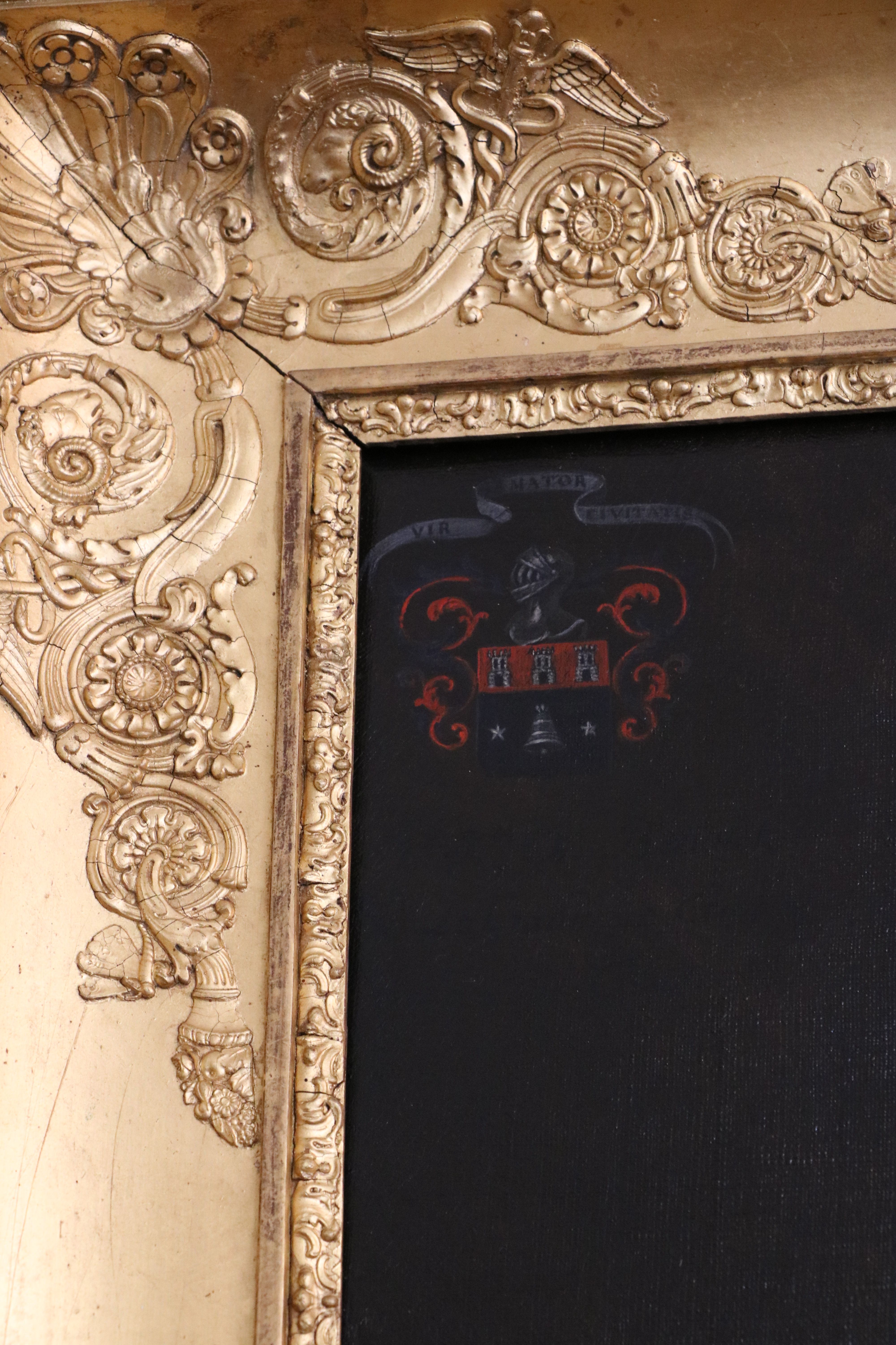 Portrait de Monsieur Etienne Jacques Christophe Benoist de la Grandière. Étienne-Jacques-Christophe Benoist de La Grandière, écuyer, né le 24 juillet 1733 à Tours et décède à Tours le 18 décembre 1805, est un juriste français, maire de la ville de Tours de 1780 à 1790, dont il est le dernier sous l'Ancien Régime. Huile sur toile. Etat d'usage H.83 x 67 cm Cadre en stuc, doré à l’or. 91 cm x 106 cm.