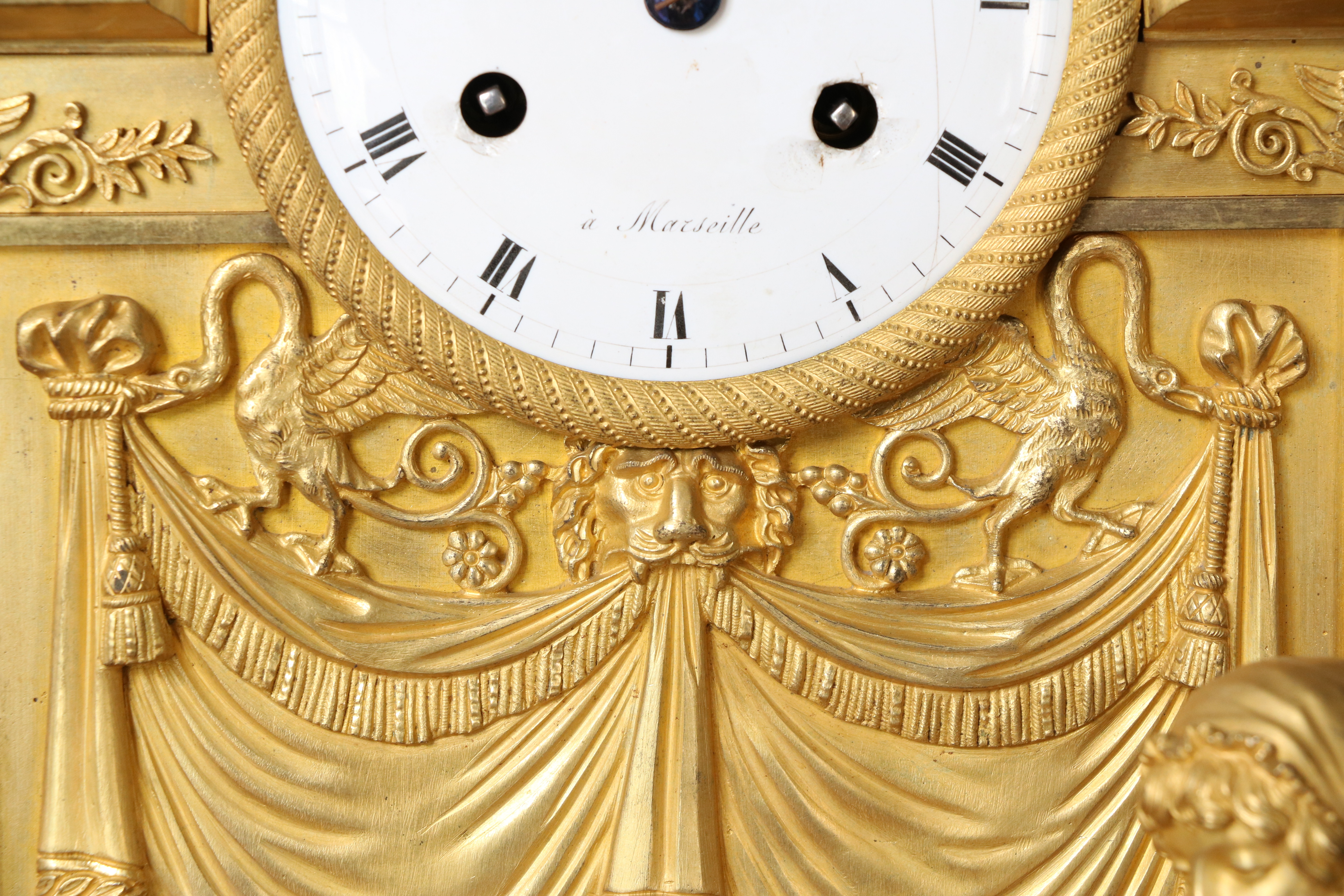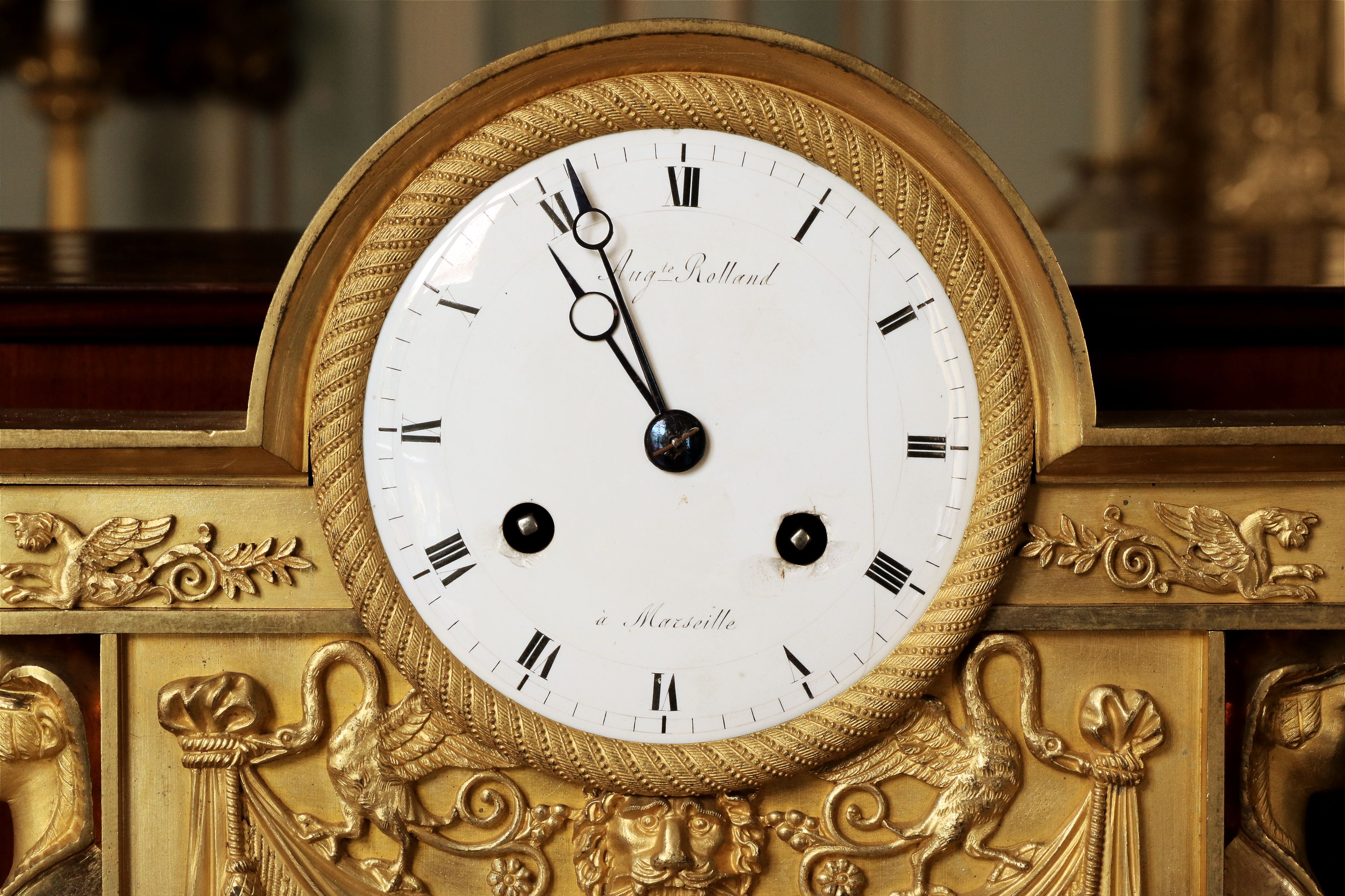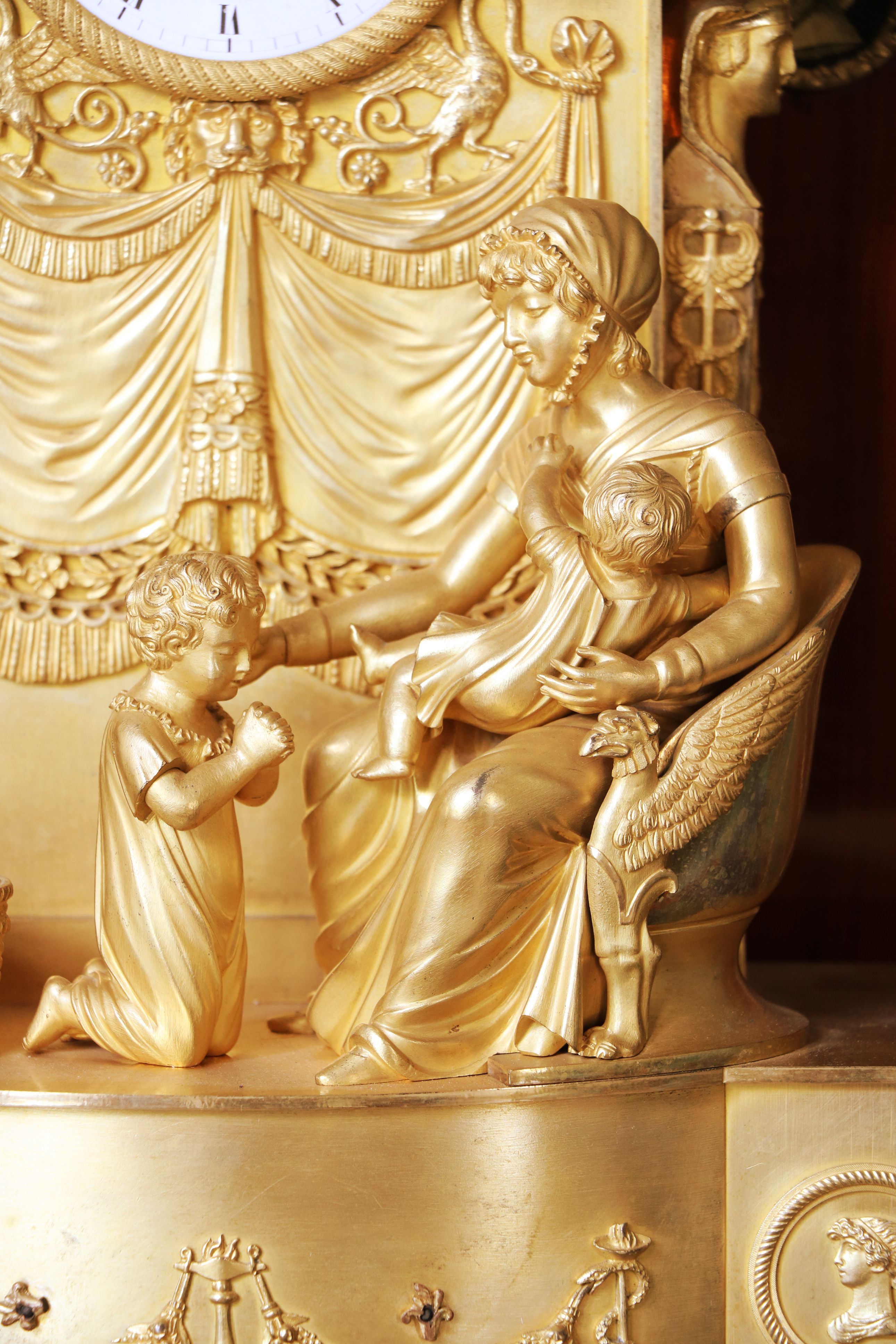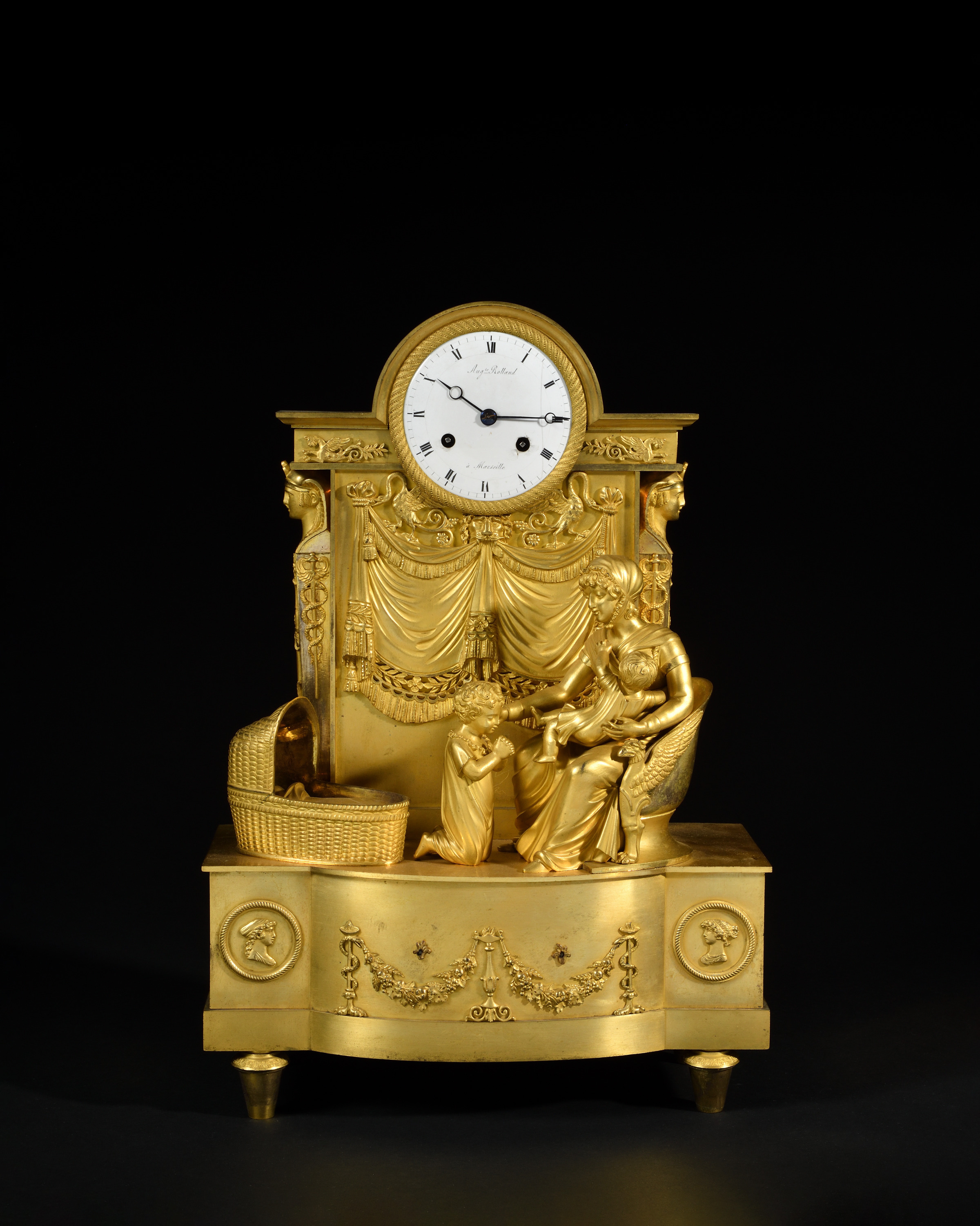 Pendule à la Naissance du duc de Bordeaux, en bronze doré, l’Enfant du miracle dans les bras de la duchesse de Berry accompagnée de sa fille Louise. Le cadran est signé d’Auguste Rolland à Marseille. Époque Restauration. H : 39,5 cm, L : 30 cm, P : 15 cm