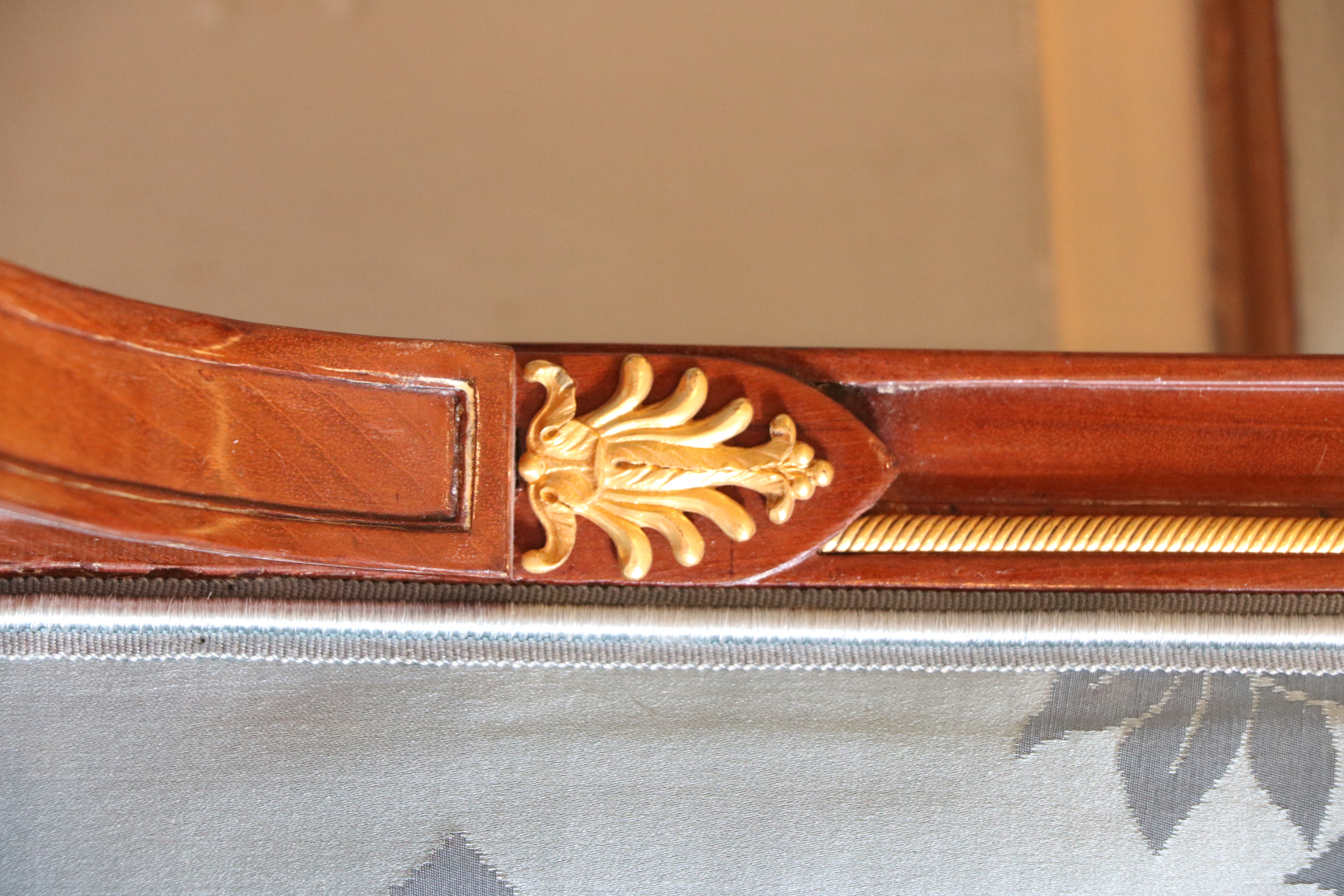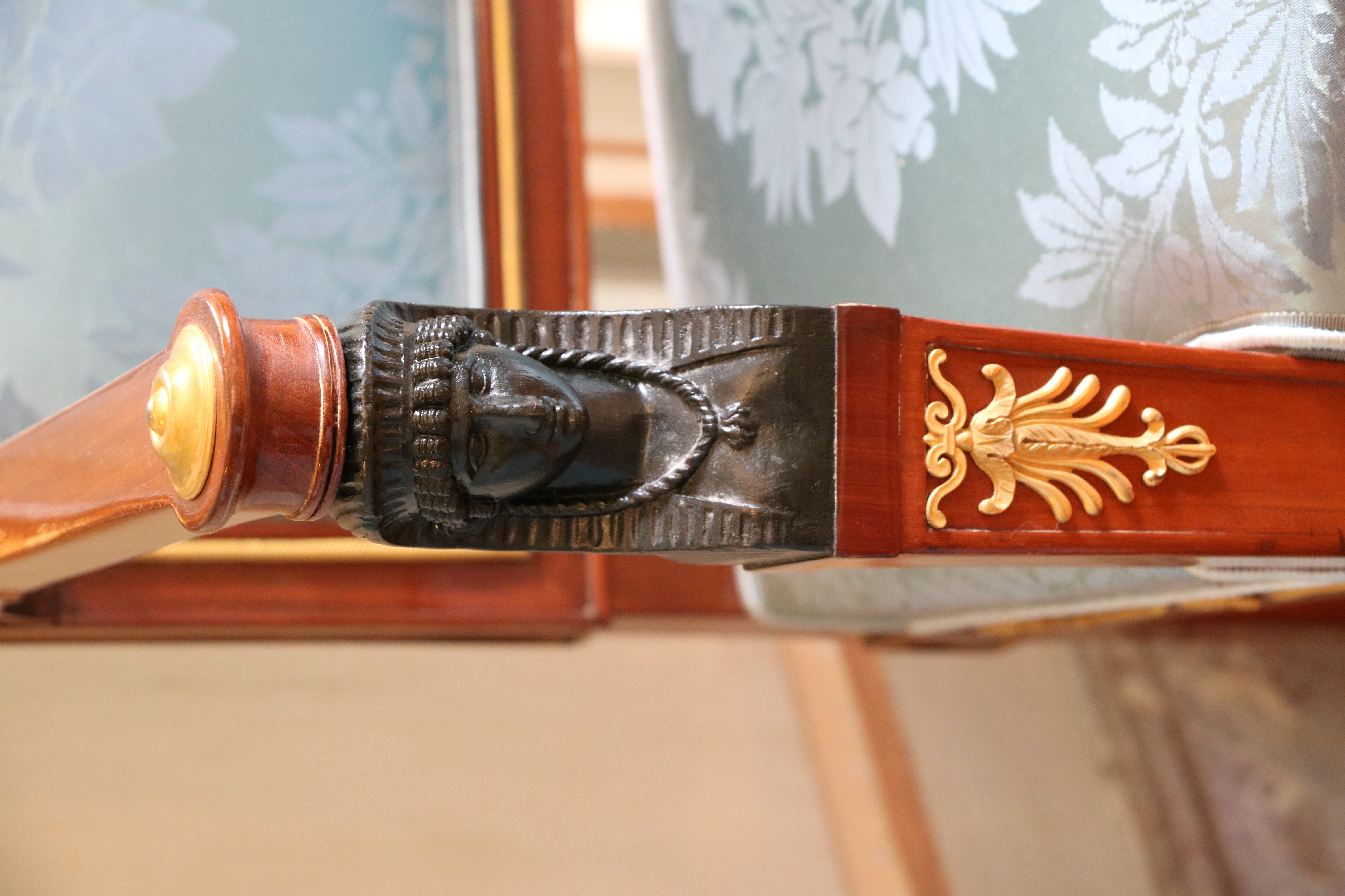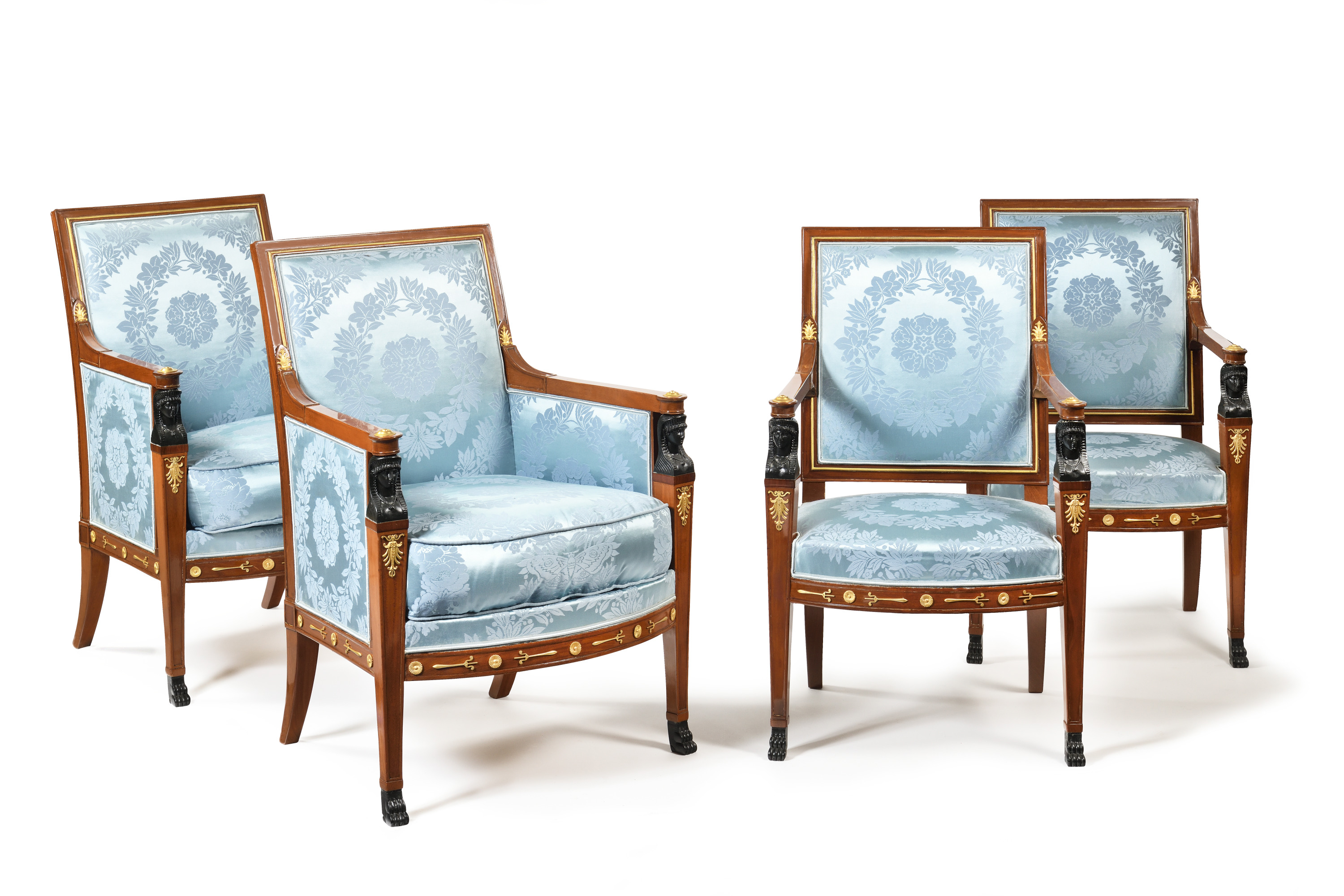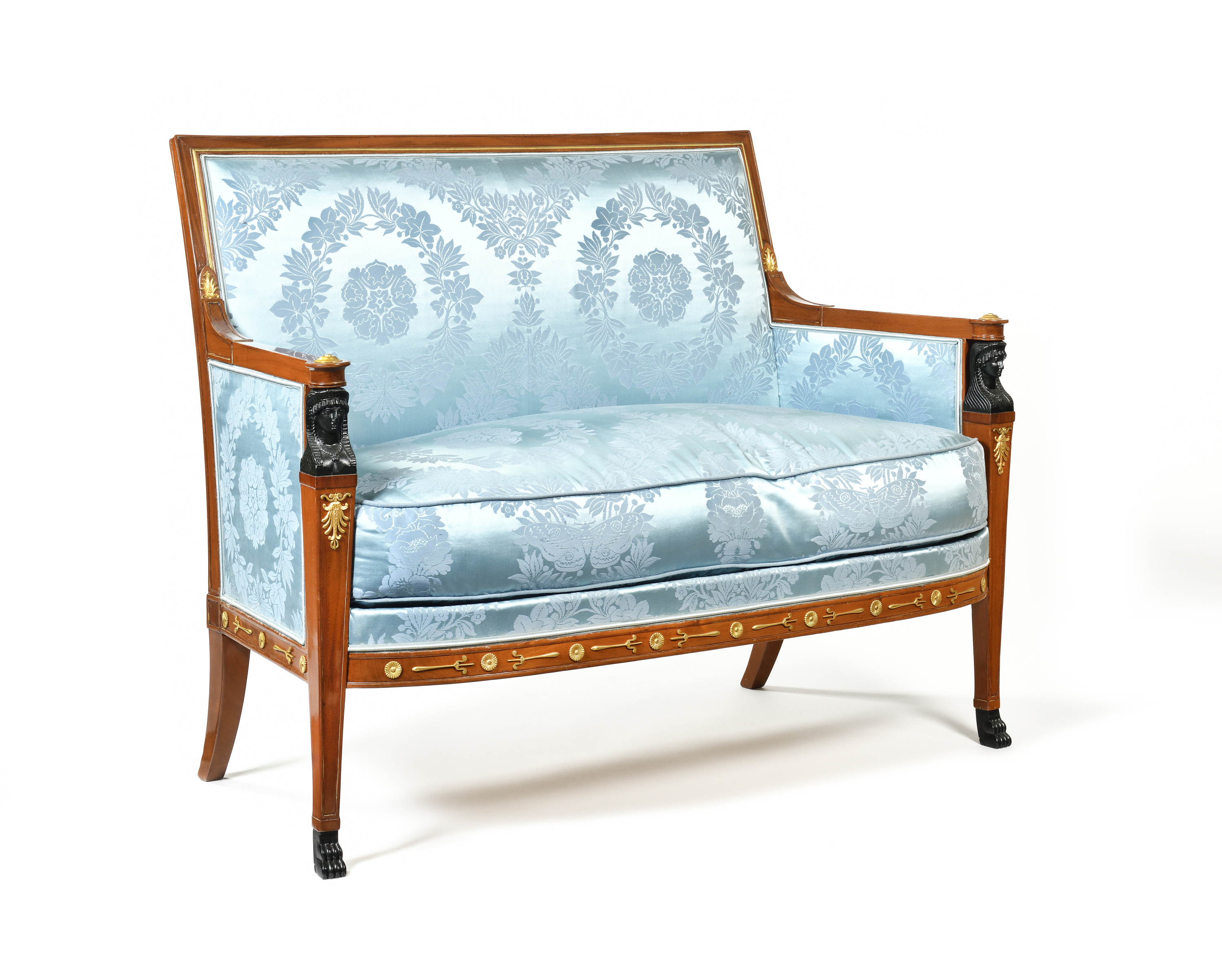 Suite de deux bergères, deux fauteuils et un canapé en acajou mouluré, bois patiné et bronze doré, à dossier plat rectangulaire, les supports d’accotoir à bustes d’égyptiennes soutenues par des montants en gaine terminés par des pieds en griffe. Estampille de Jean-Baptiste Bernard Demay, menuisier reçu maître en 1784. Etat d'usage Fin du XVIIIe siècle. Bergère, H : 93 cm, L : 66 cm Fauteuil, H : 93 cm, L : 57 cm Canapé, H : 94 cm, L : 119 cm