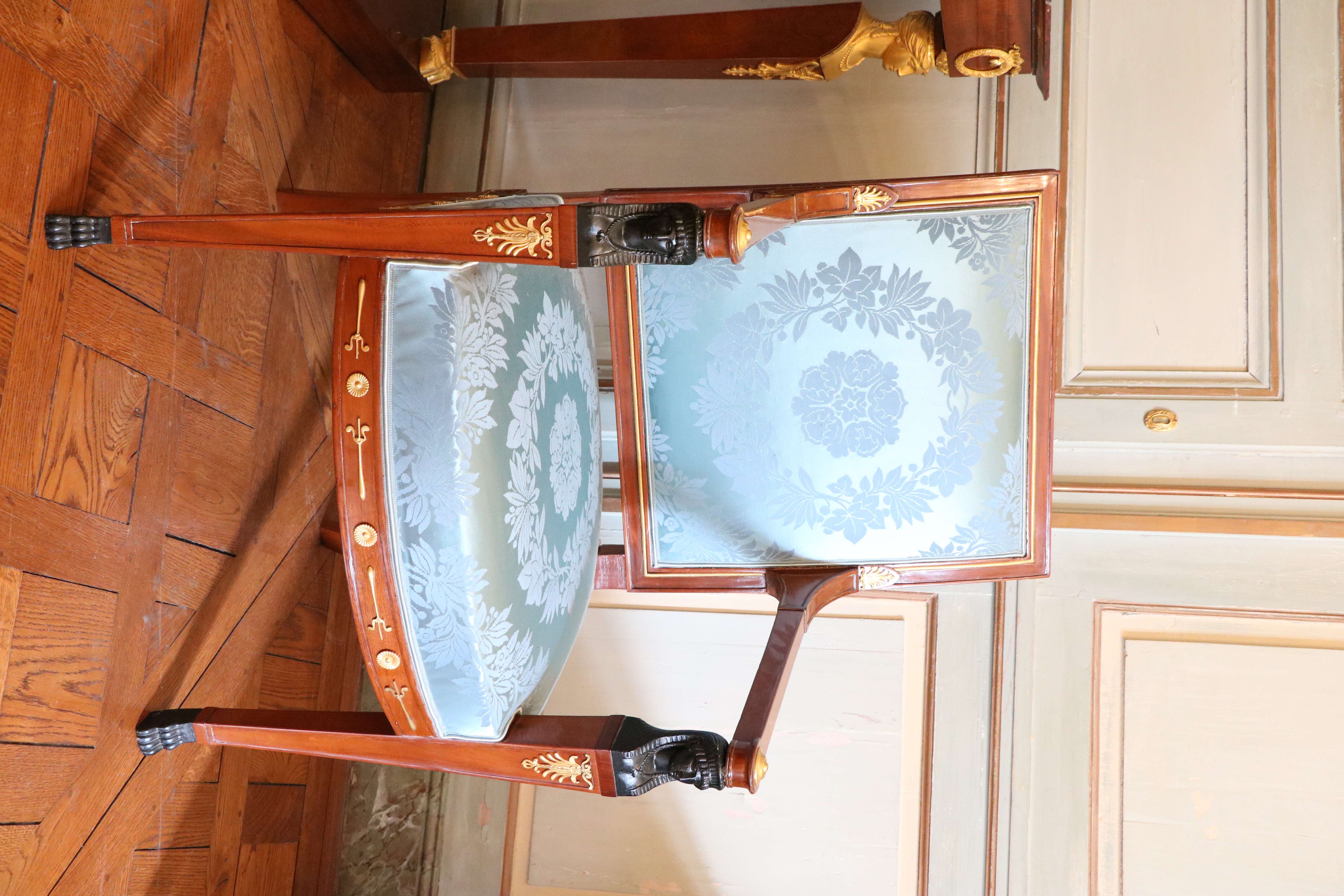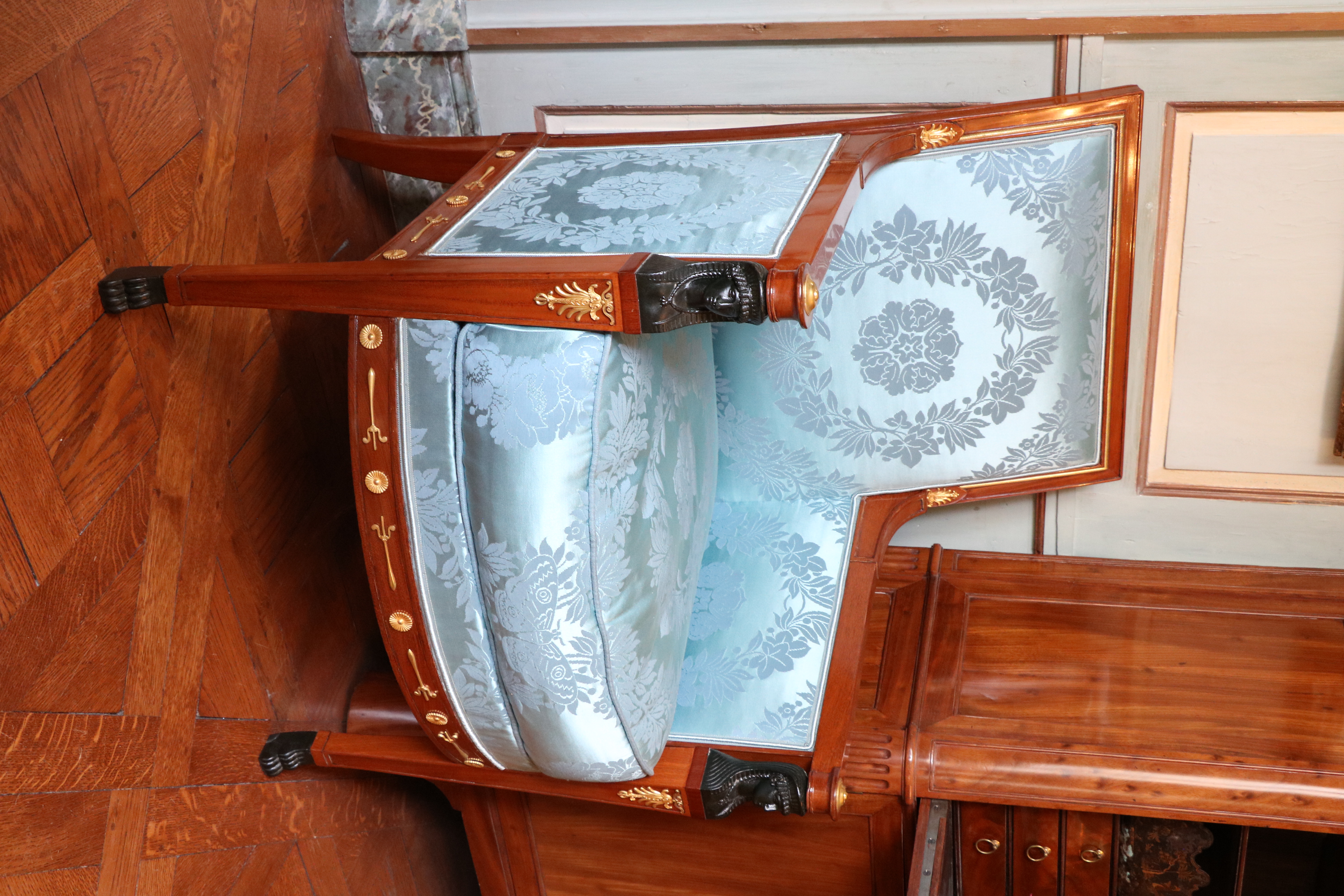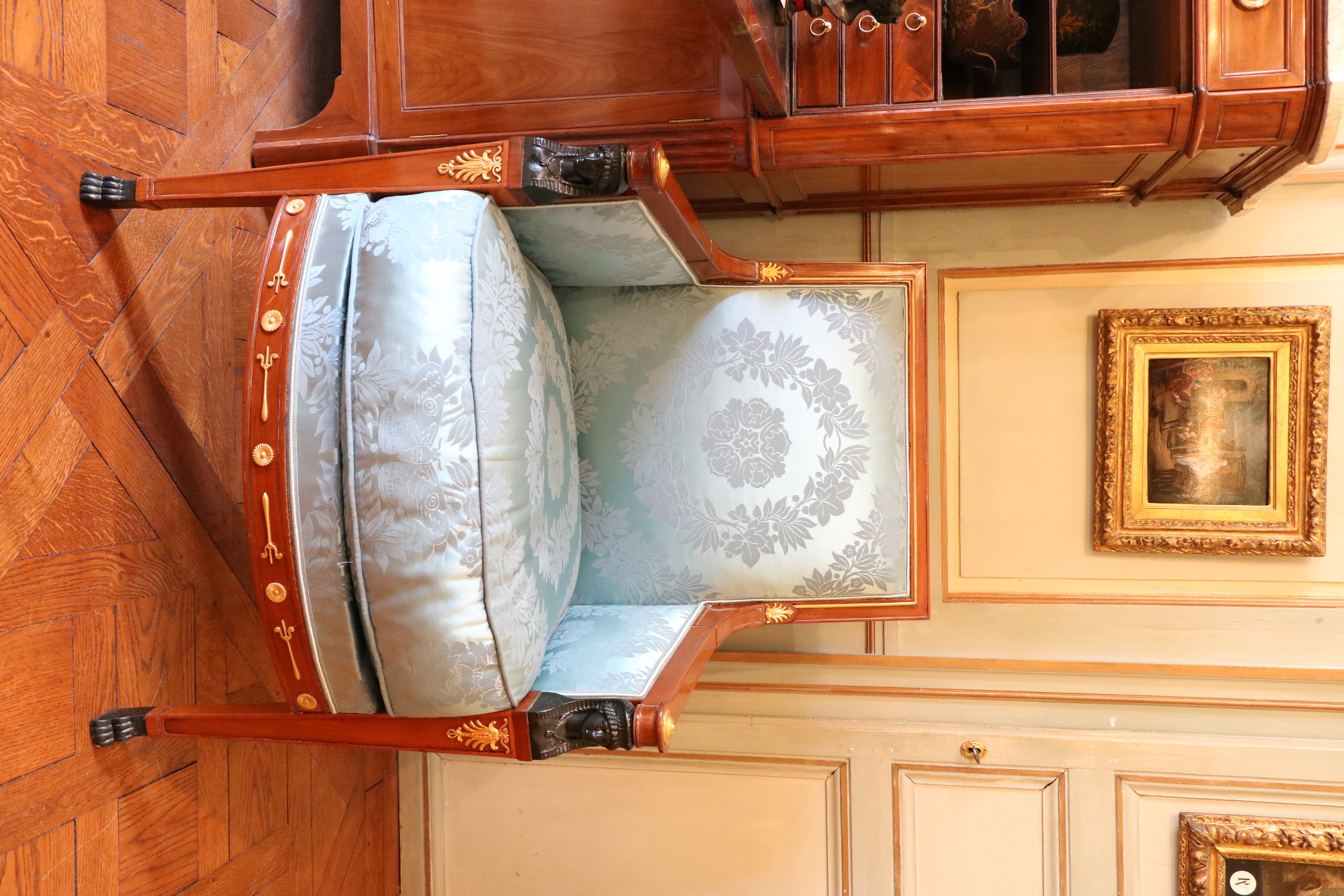 Jean-Baptiste Bernard DEMAY, né le 6 novembre 1758 à Paris (paroisse Notre Dame de la Bonne Nouvelle) et mort le 15 mars 1848 dans la capitale, était un ébéniste et menuisier en sièges français réputé pour la qualité artistique de sa production. Reçu maître ébéniste en 1784, il exerça à Paris. Son atelier a réalisé une très belle production de sièges et quelques très beaux meubles sobres en acajou. Fournisseur de la Cour, notamment pour la Reine Marie-Antoinette, on lui doit des sièges aux dossiers en éventail ou en forme de montgolfière, motif à la mode depuis l’envol des premières montgolfières en 1783 Provenance: -Ancienne Collection Mancel-Coti Une bergère et un fauteuil en acajou estampillés de Jean-Baptiste Demay, également ornés de bustes d’égyptiennes en bois patiné, ont été vendus à Paris, Christie’s, le 7 novembre 2002, lot 411.
