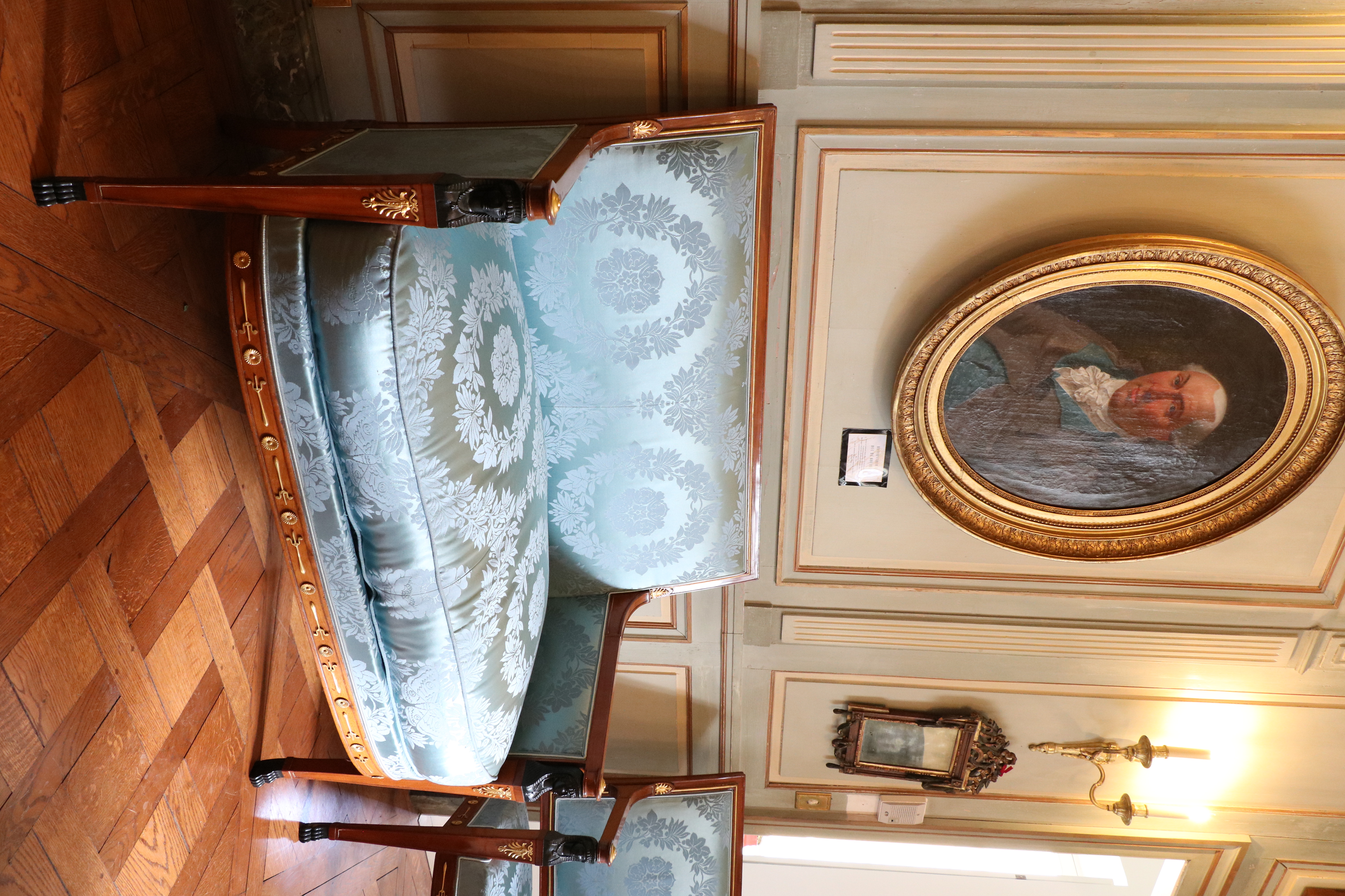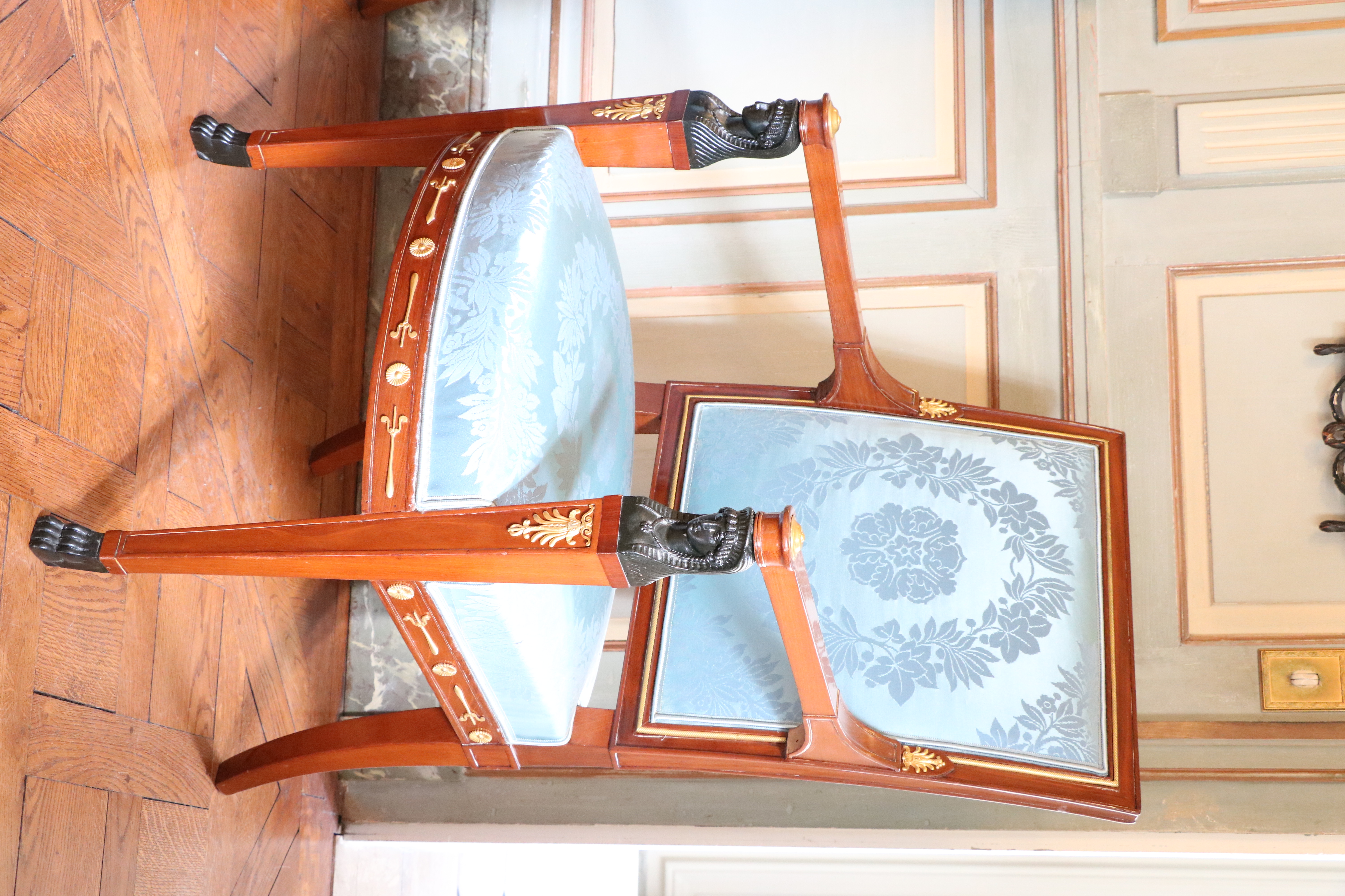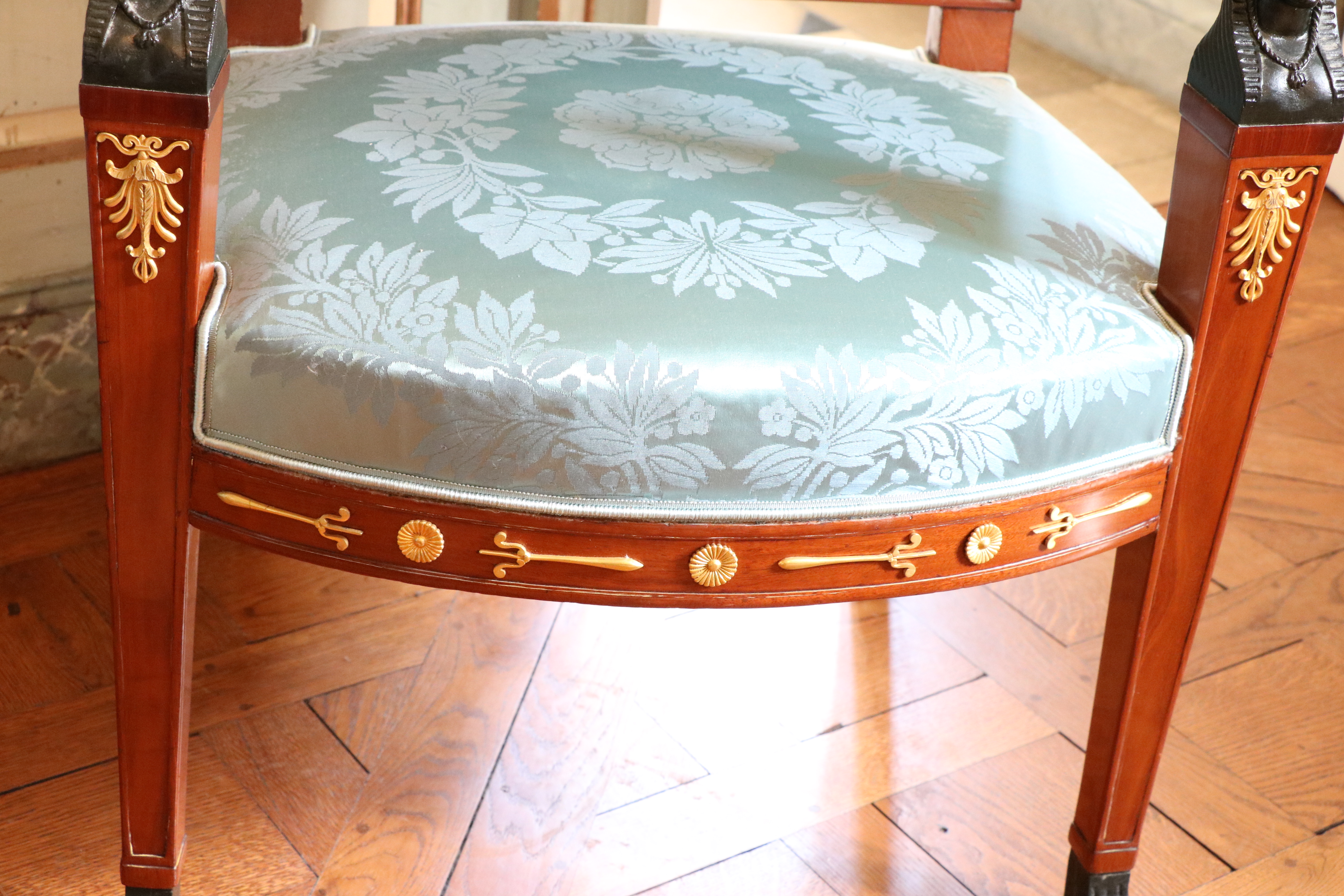 Jean-Baptiste Bernard DEMAY, né le 6 novembre 1758 à Paris (paroisse Notre Dame de la Bonne Nouvelle) et mort le 15 mars 1848 dans la capitale, était un ébéniste et menuisier en sièges français réputé pour la qualité artistique de sa production. Reçu maître ébéniste en 1784, il exerça à Paris. Son atelier a réalisé une très belle production de sièges et quelques très beaux meubles sobres en acajou. Fournisseur de la Cour, notamment pour la Reine Marie-Antoinette, on lui doit des sièges aux dossiers en éventail ou en forme de montgolfière, motif à la mode depuis l’envol des premières montgolfières en 1783 Provenance: -Ancienne Collection Mancel-Coti Une bergère et un fauteuil en acajou estampillés de Jean-Baptiste Demay, également ornés de bustes d’égyptiennes en bois patiné, ont été vendus à Paris, Christie’s, le 7 novembre 2002, lot 411.