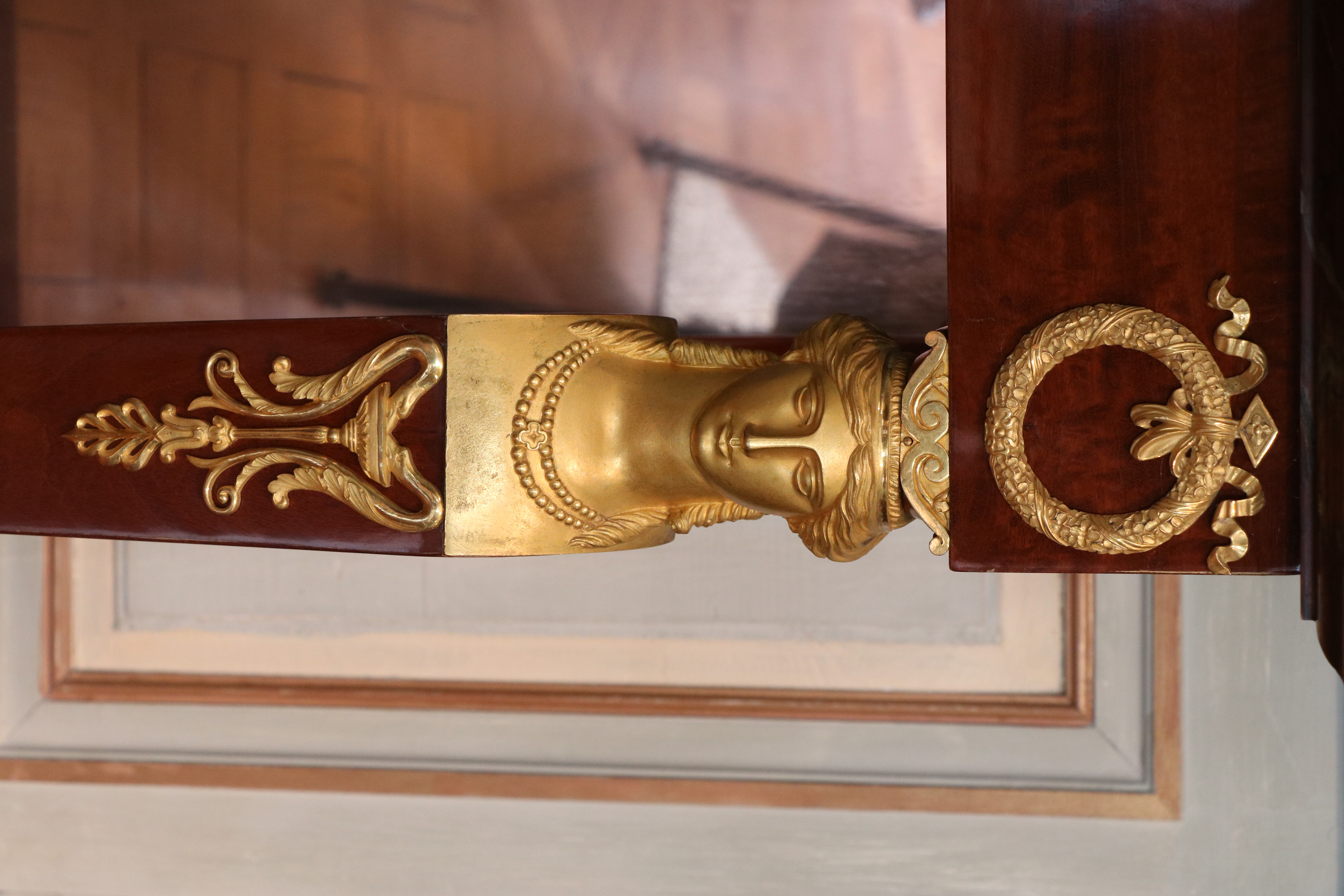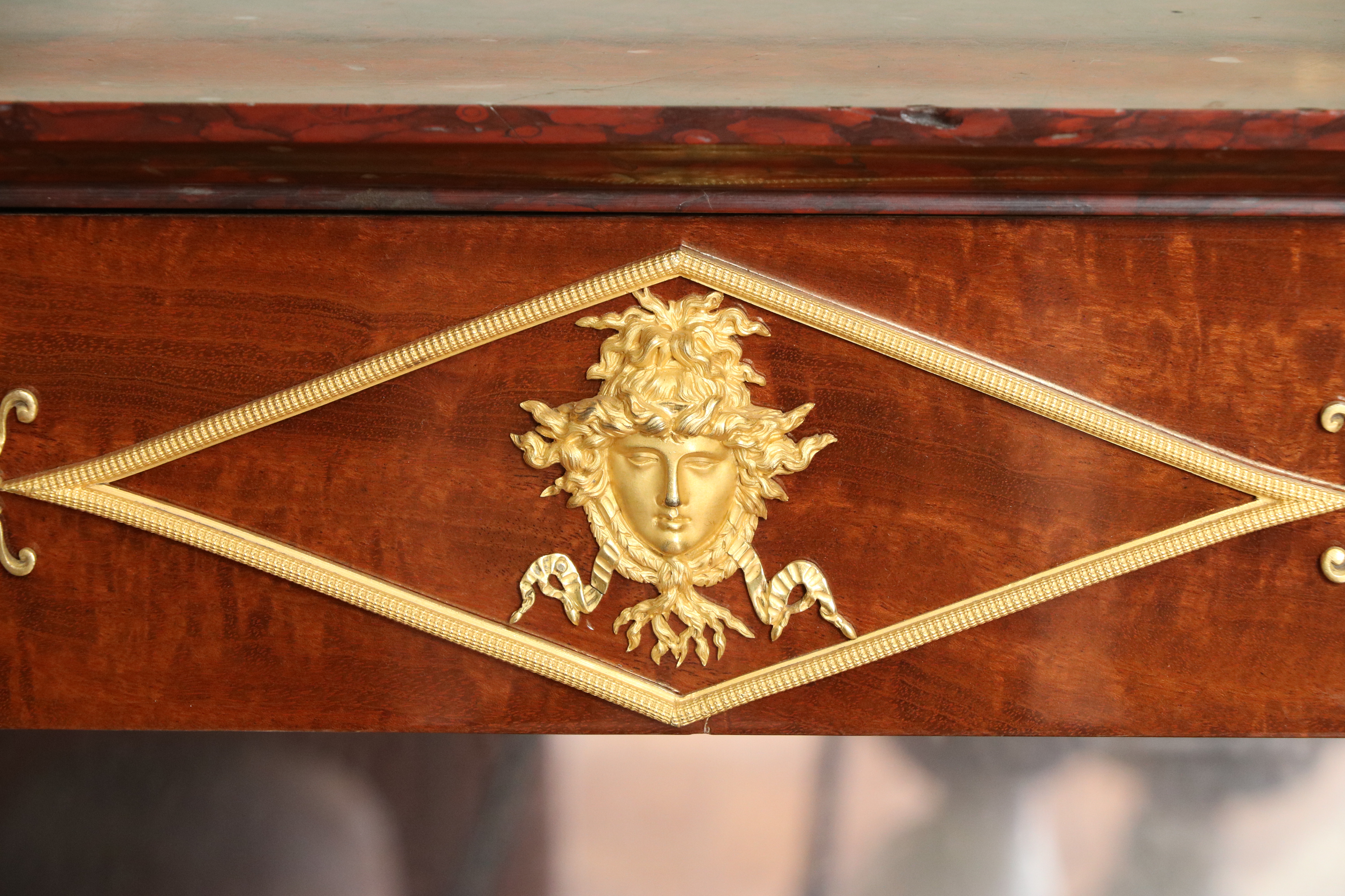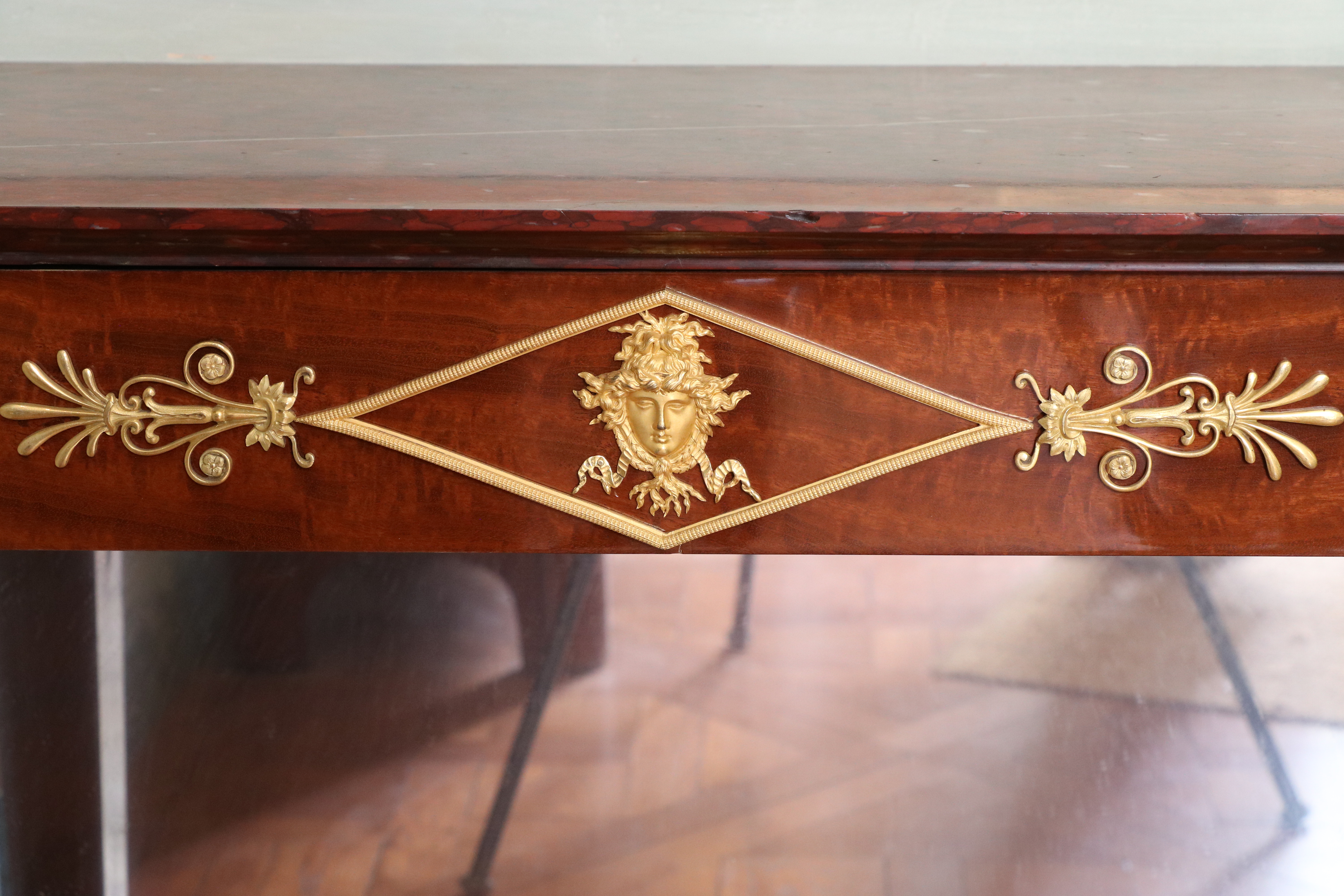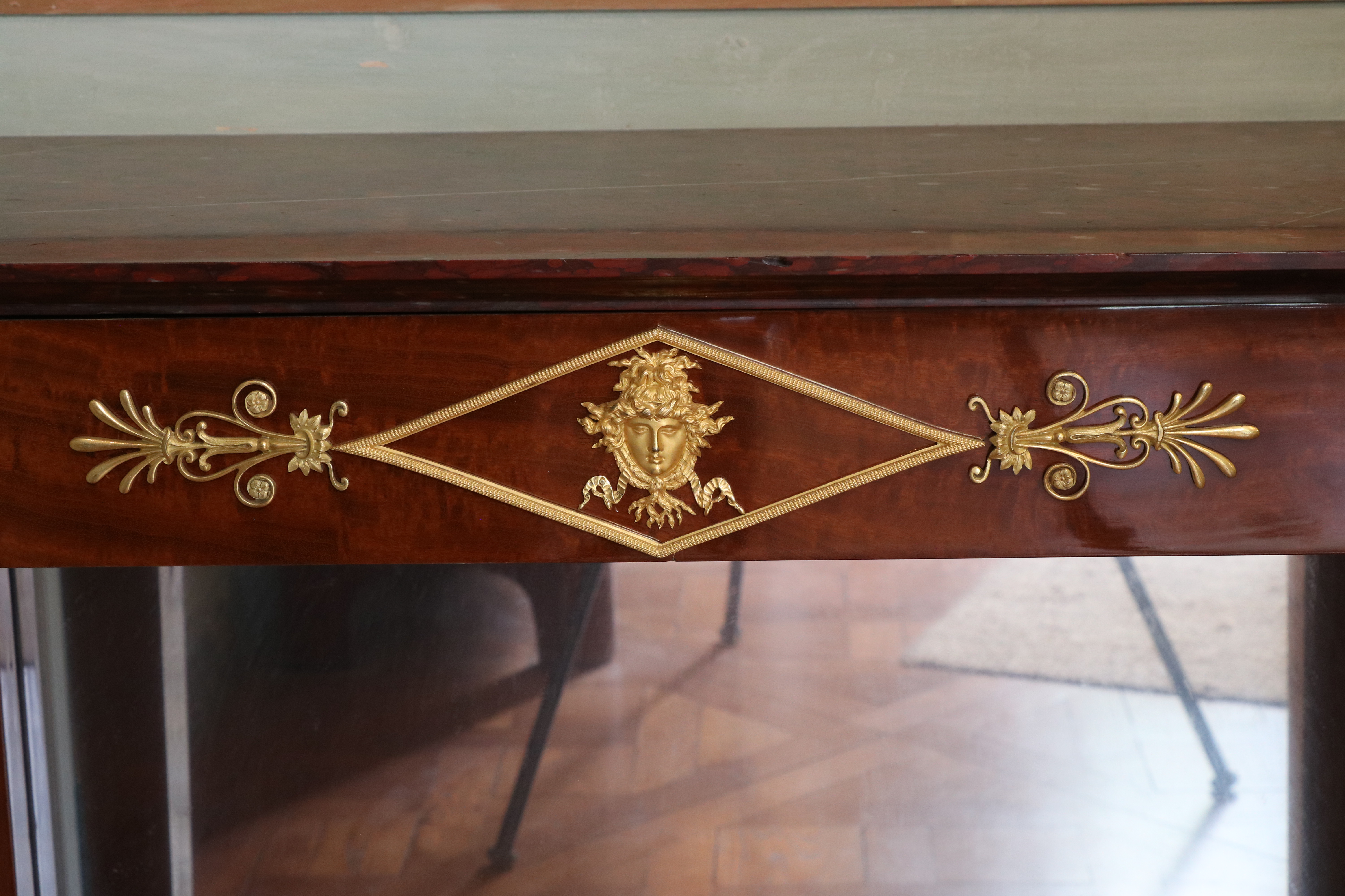 Paire de tables consoles en acajou, le dessus de marbre griotte à moulure inversée reposant sur une ceinture à couronnes de feuilles de laurier et ruban et mascaron dans un encadrement losangé à palmettes, soutenue par des montants en gaine à bustes de femme antique en caryatide et plinthe rectangulaire surmontée à l’arrière d’un fond de glace ; (petites restaurations). Estampille de Bernard Molitor, ébéniste reçu maître en 1787. Epoque Consulat. Etat d’usage H : 91 cm, L: 97 cm, P : 46 cm