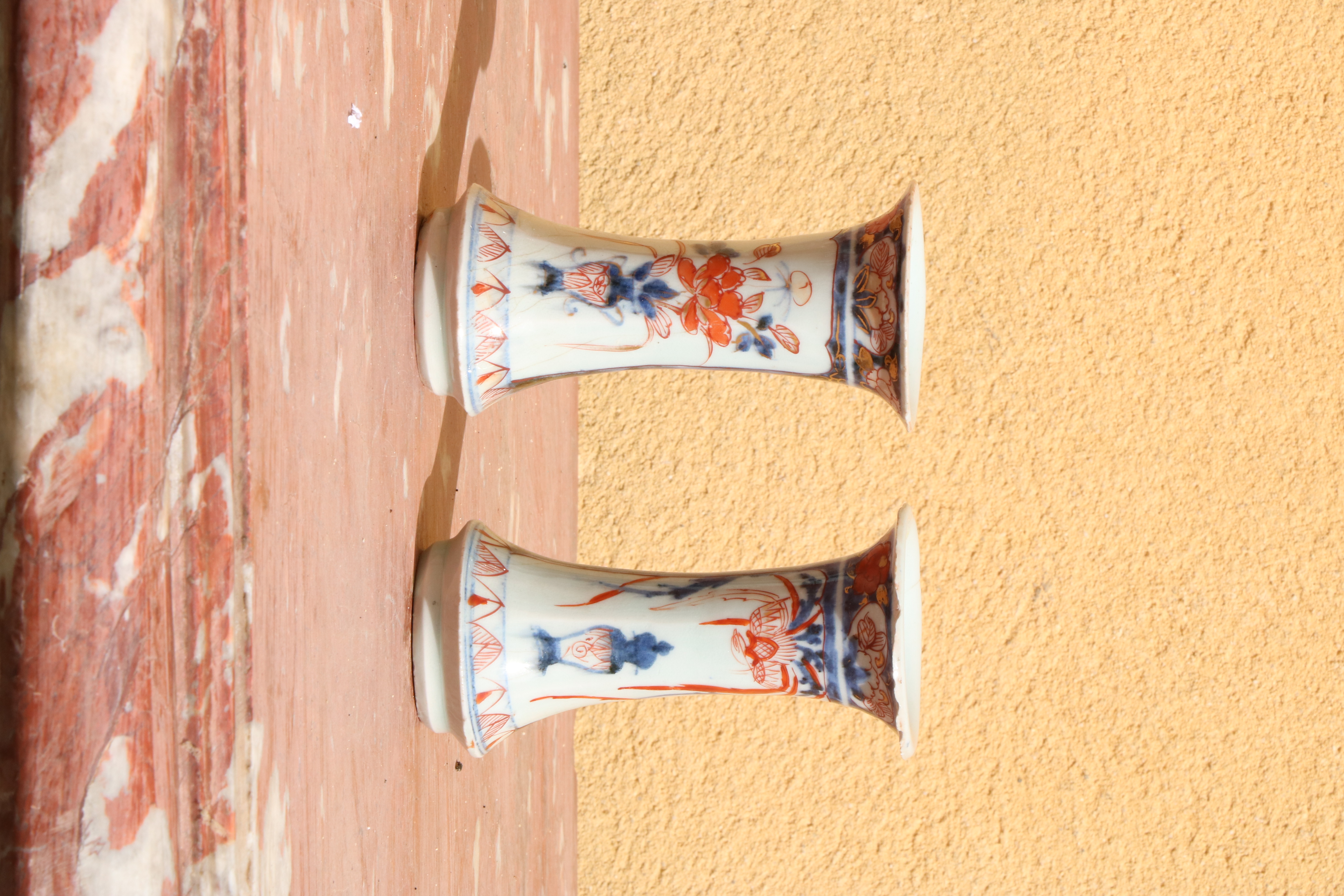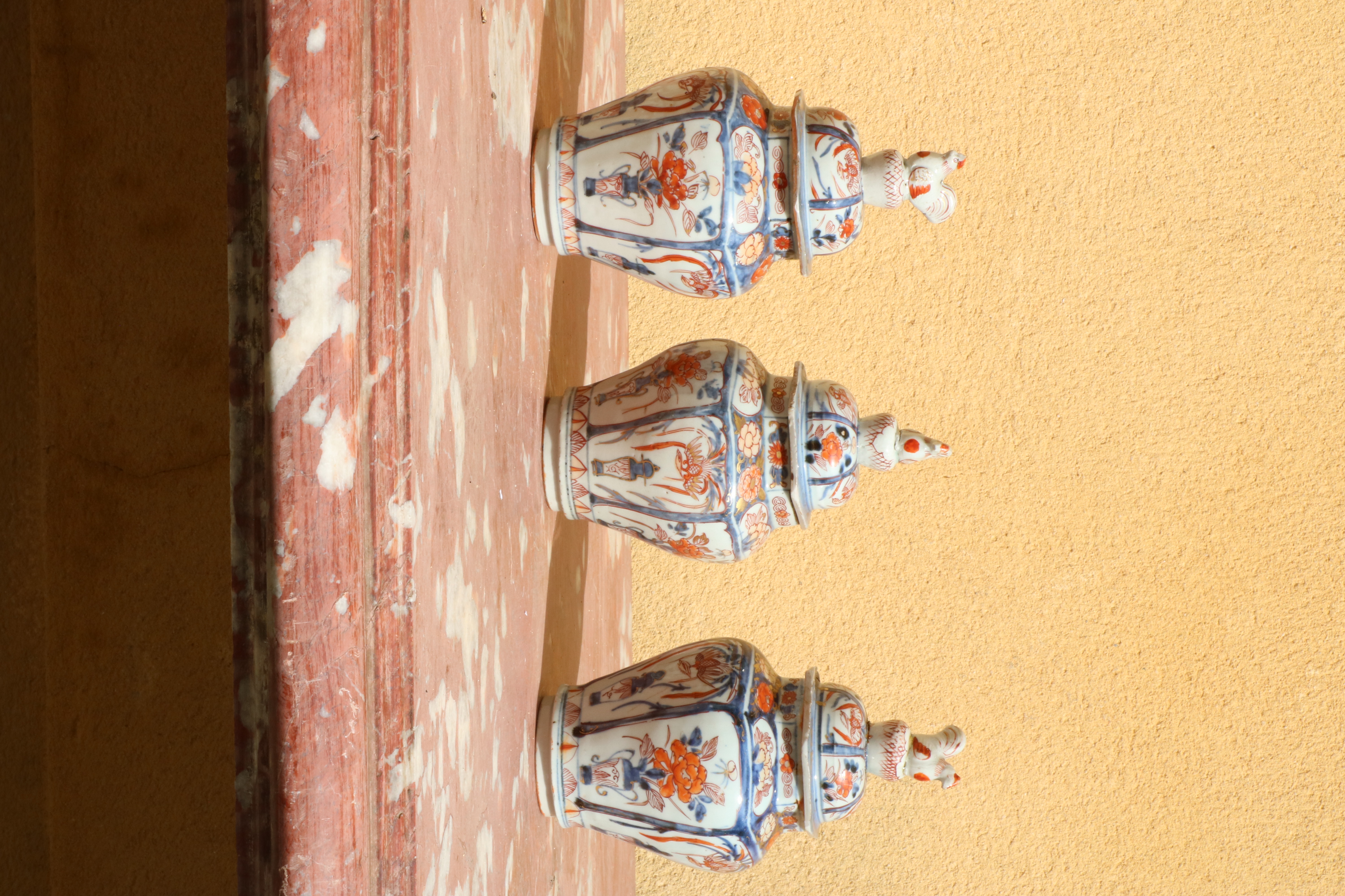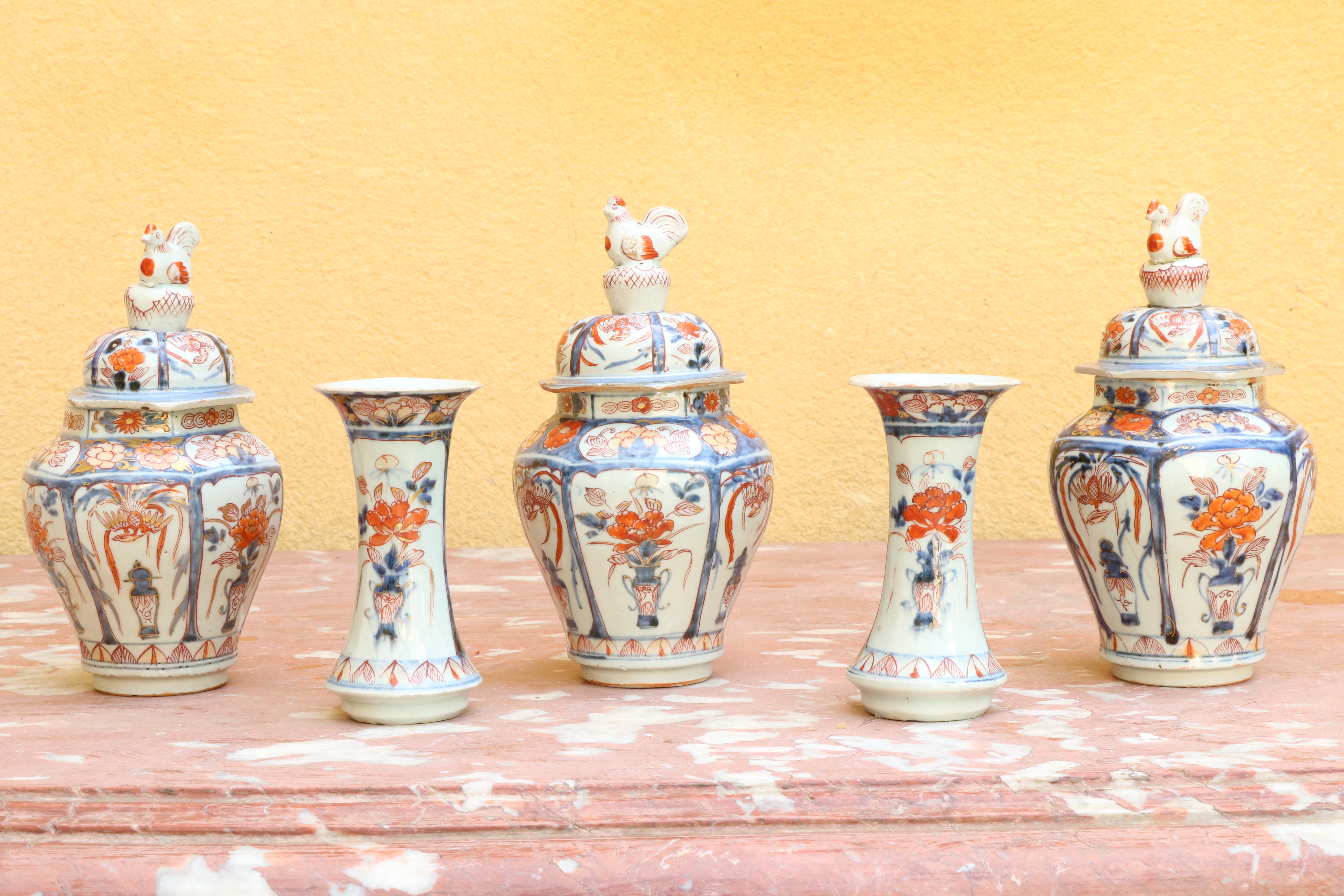 Suite de cinq vases japonais Imari XVIIème Les trois vases sont dotés de couvercles bombés surmontés de coqs. Vases de forme balustre décorés à la main dans la palette Imari avec des décorations sur fond blanc, dans des tons de rouge brique et de bleu, avec comme représentations des fleurs et des bouquets garnis. Les deux vases concaves présentent un vocabulaire similaire avec deux faces peintes Etat d’usage ( accidents) H : 22 cm ( avec couvercle ) H 14 cm. Epoque XVIIème époque Edo