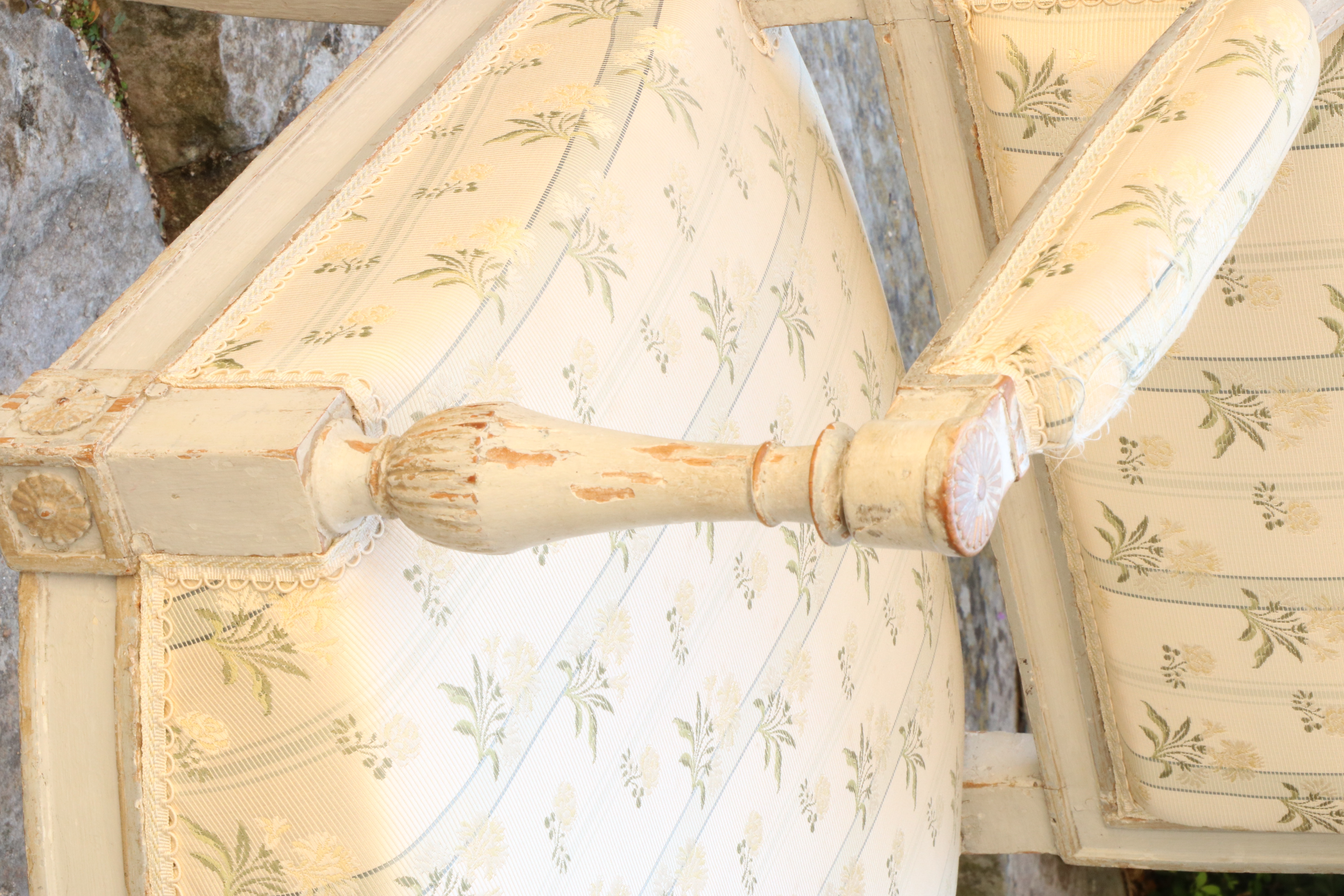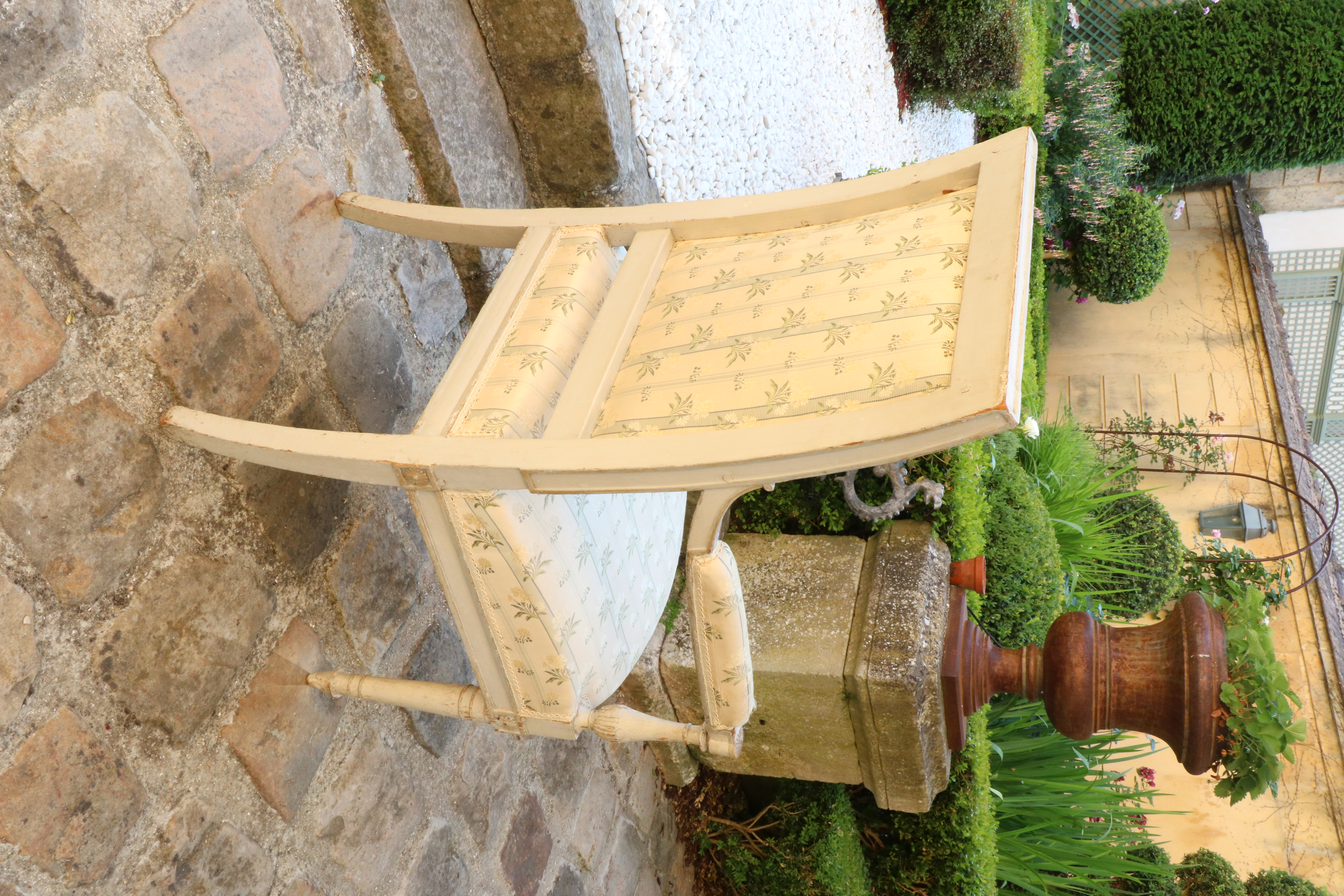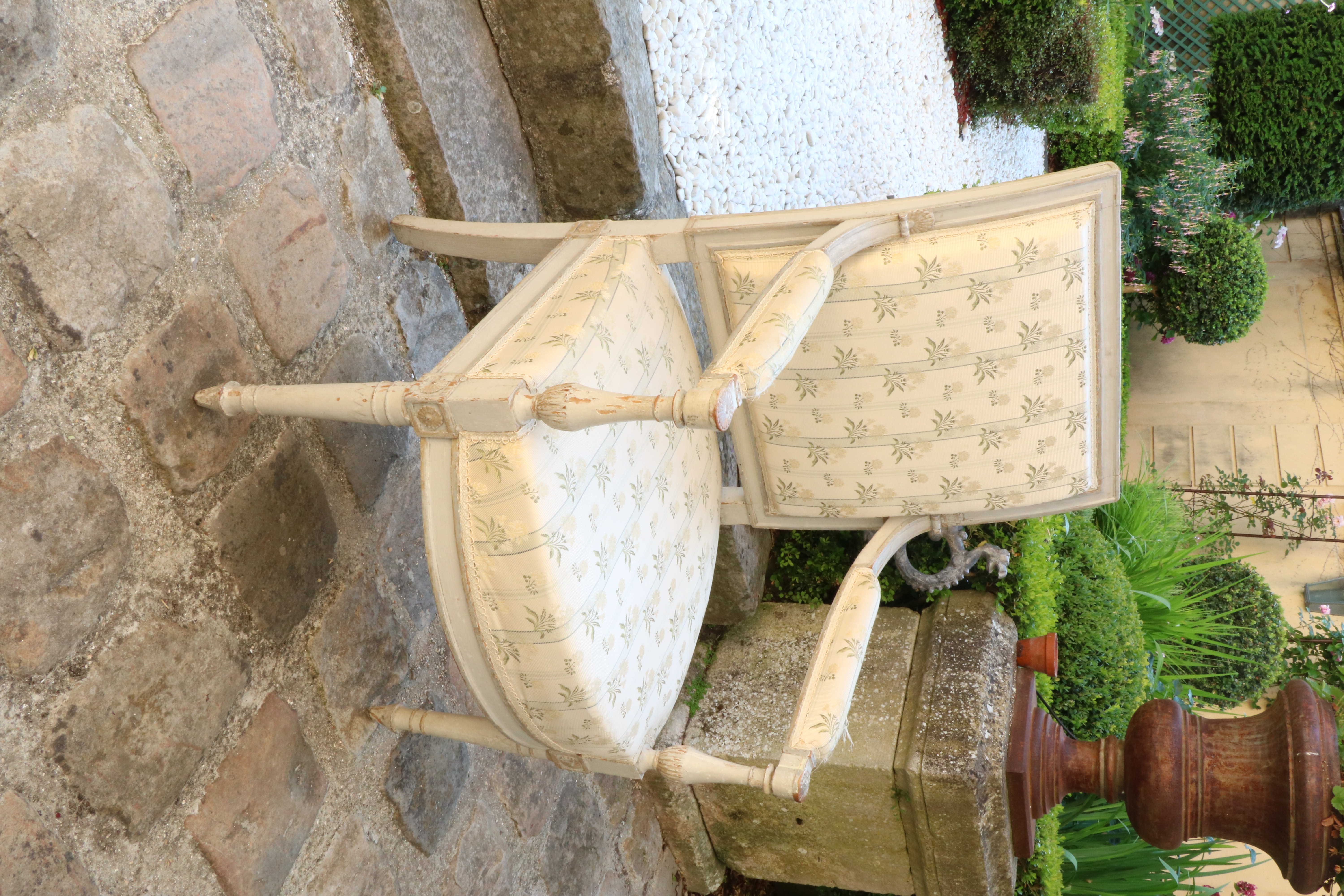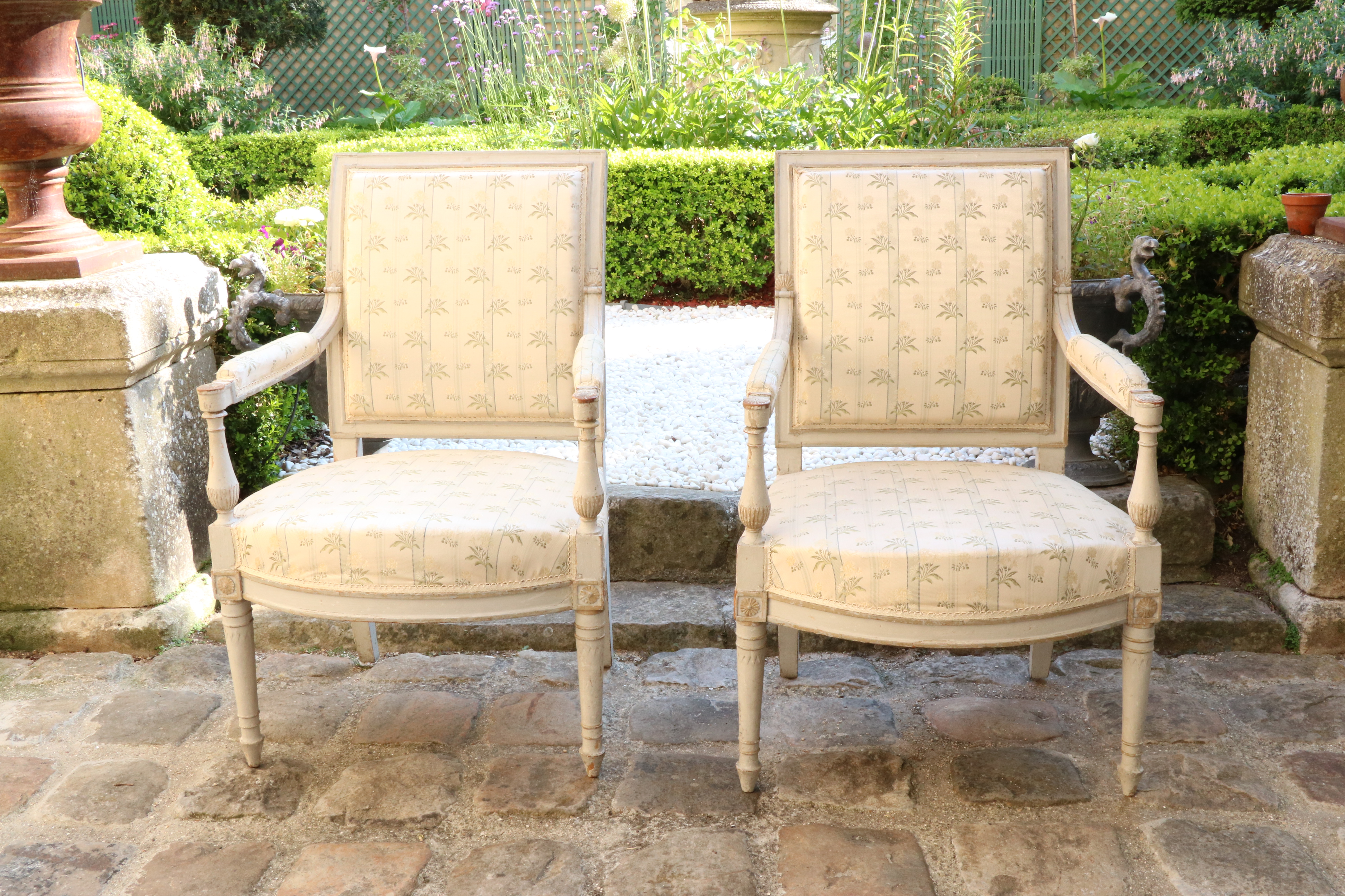 Paire de fauteuils en hêtre mouluré et peint, à dossier plat rectangulaire, les supports d’accotoirs en balustre et reposant sur des pieds avant fuselés à bagues et des pieds arrière en sabre. Etiquettes inscrites à l’encre : Compiègne Petites Ecuries / N°1 / Cabinet de Travail / 2 fauteuils et 2 fauteuils / 447 ; Numéros à l’encre : C 10212 et C458 ; marque au feu CP couronné Accidents et restaurations. Fin du XVIIIe siècle. H : 92 cm, L : 60 cm. Provenance : Château de Compiègne à la fin du XVIIIe siècle et au XIXe siècle.