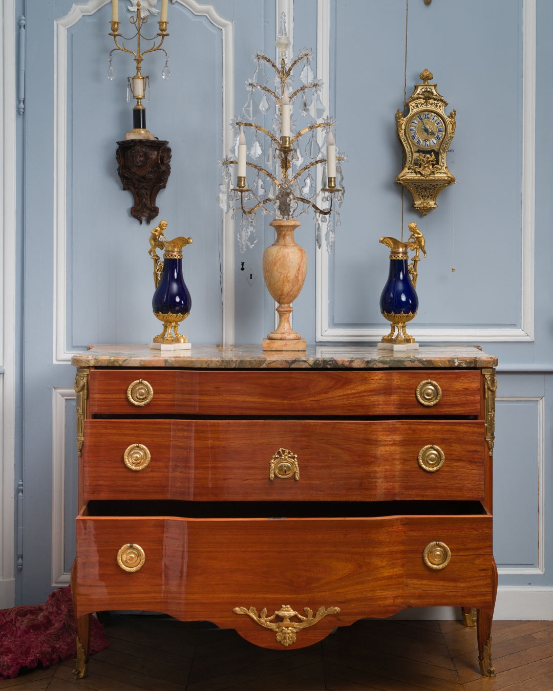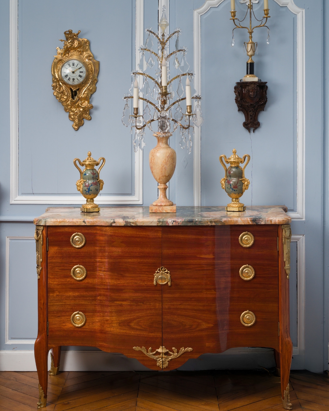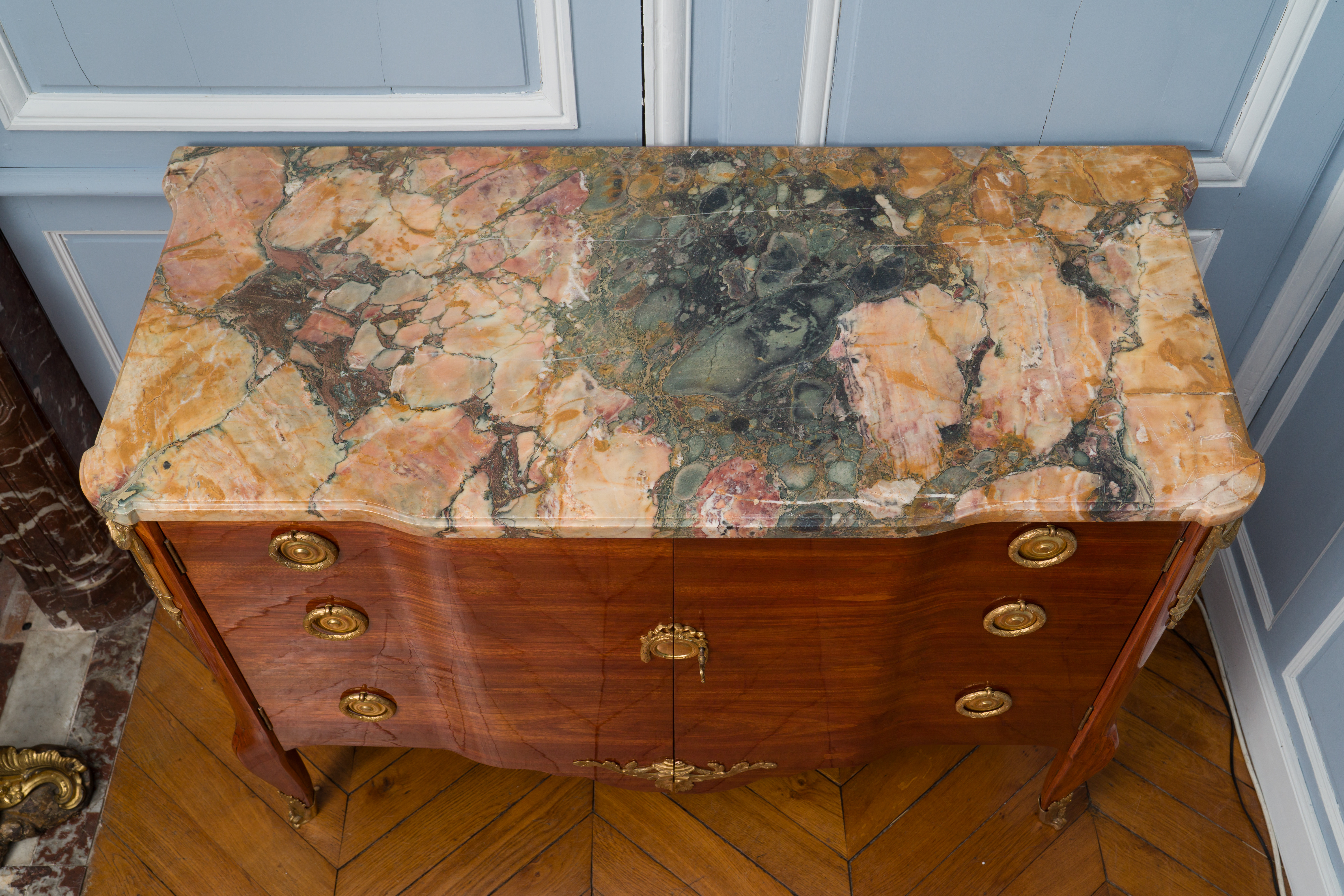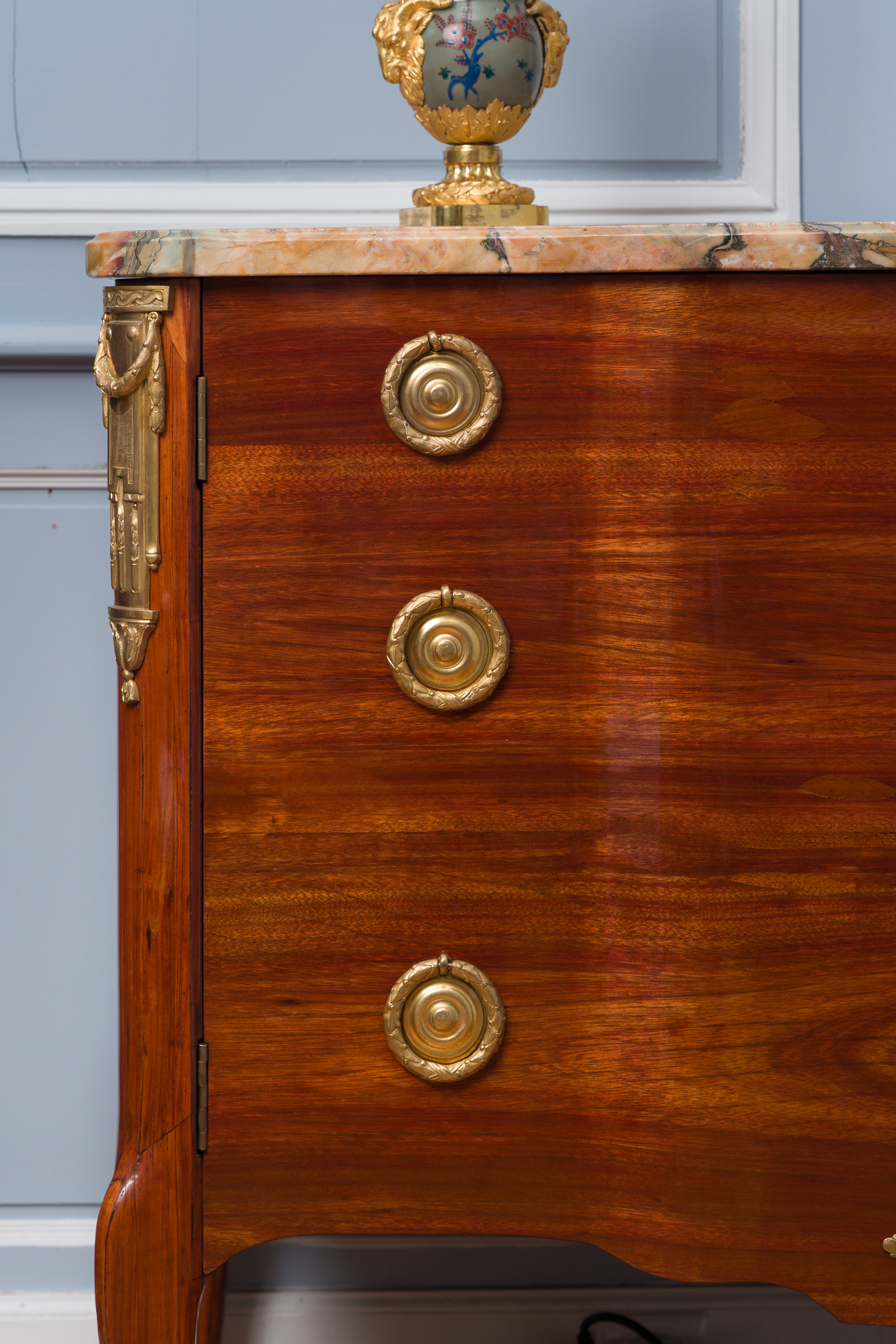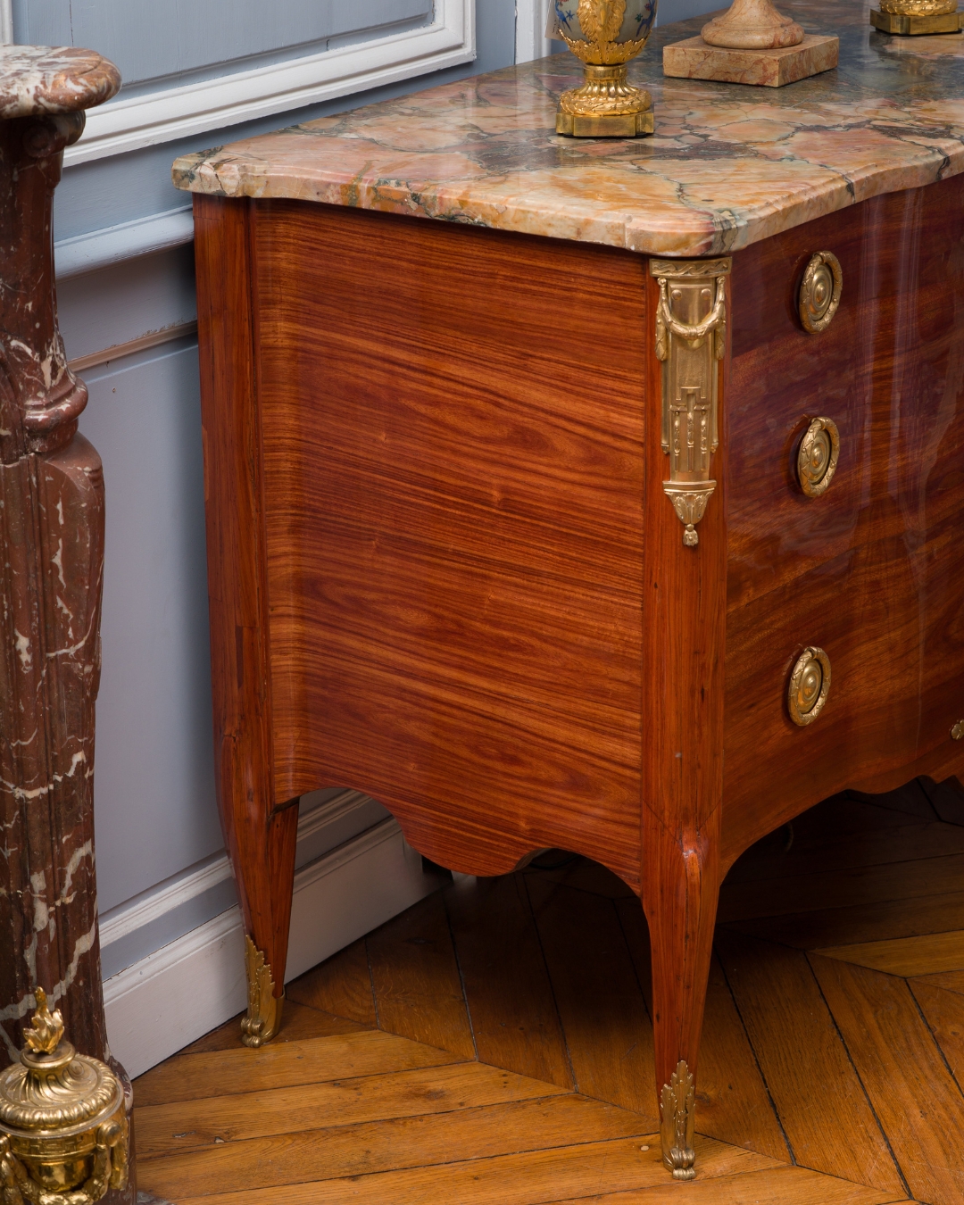 Ces deux commodes s’inspirent directement des commodes mises au point par Jean-François Oeben et livrées pour la marquise de Pompadour au château de Ménars ainsi que pour le château de Chanteloup vers 1770 pour le duc de Choiseul. Cette série de commodes diffère dans leur mode d’ouverture, combinant à l’origine des portes et des tiroirs, fréquemment simplement à tiroirs ou comme pour l’une de ces deux commodes, à vantaux.
