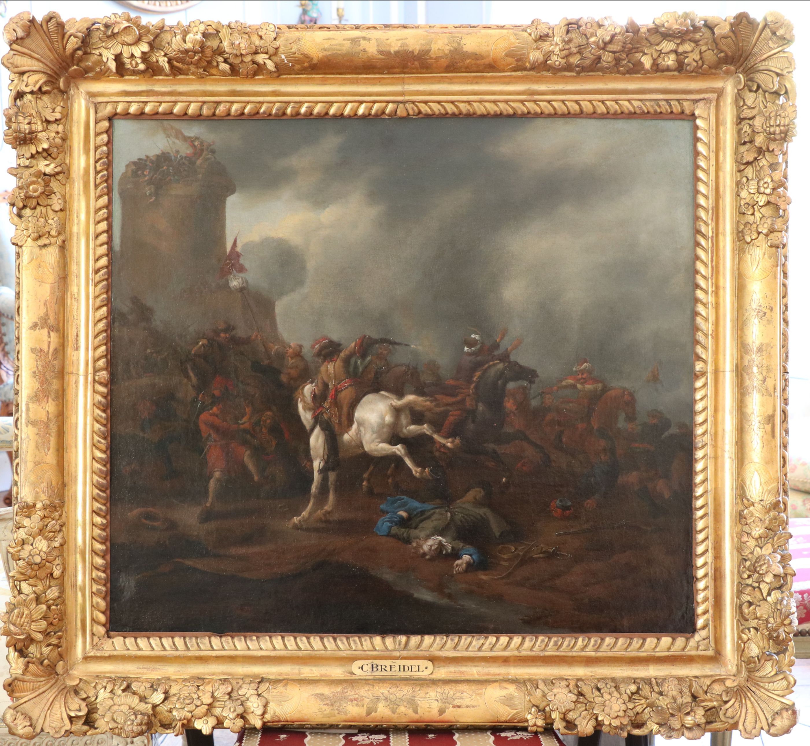 Choc de cavalerie oar Karel BREYDEL (Anvers 1678 - 1733) Huile sur Toile Etat d'usage H.59,5 x L.67 cm Trace d'inscription au dos sur le châssis Huy …B Karel Breydel ou Carel Breydel dit "Le Chevalier" est un peintre flamand de scènes militaires, de peintures équestres et de paysages.