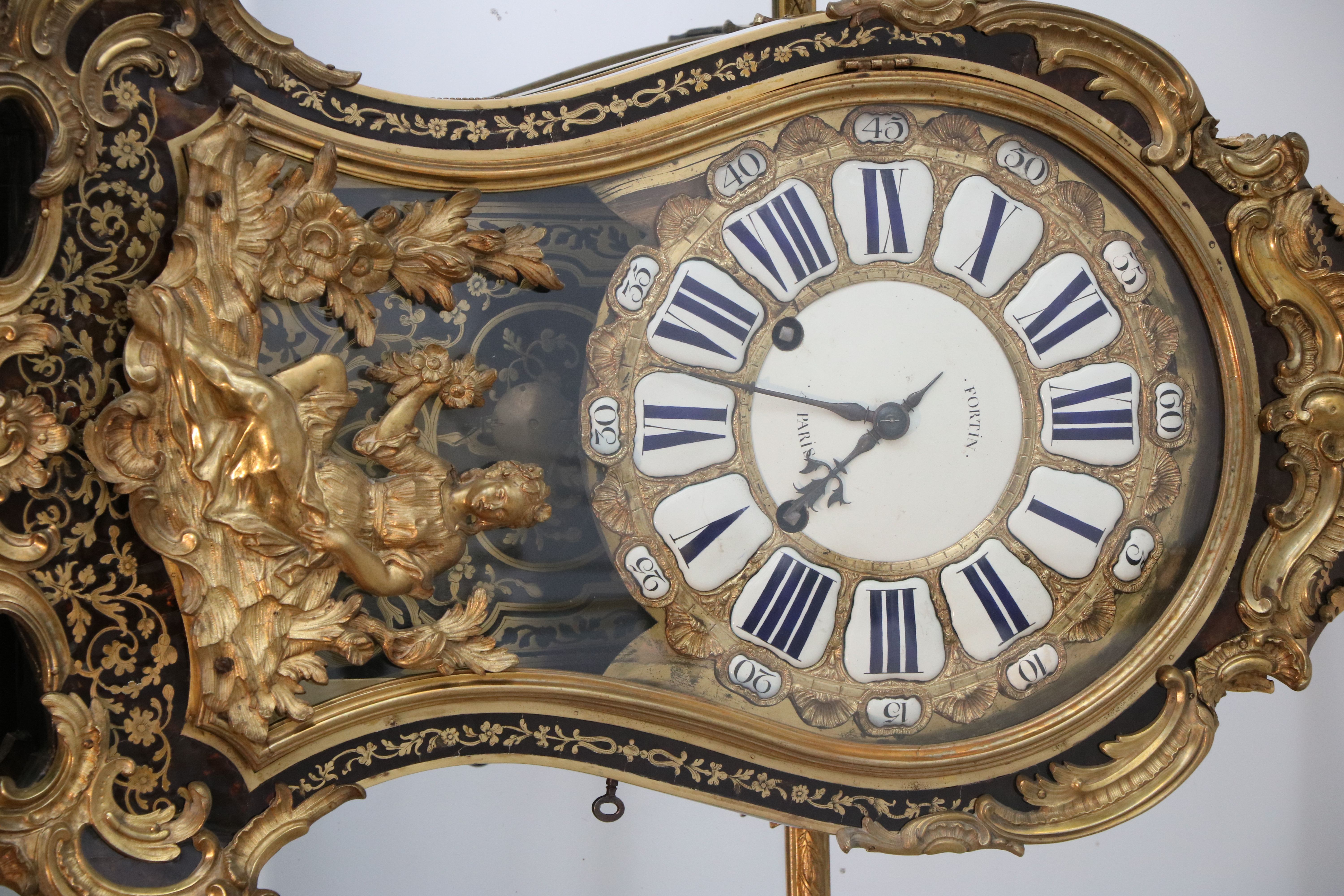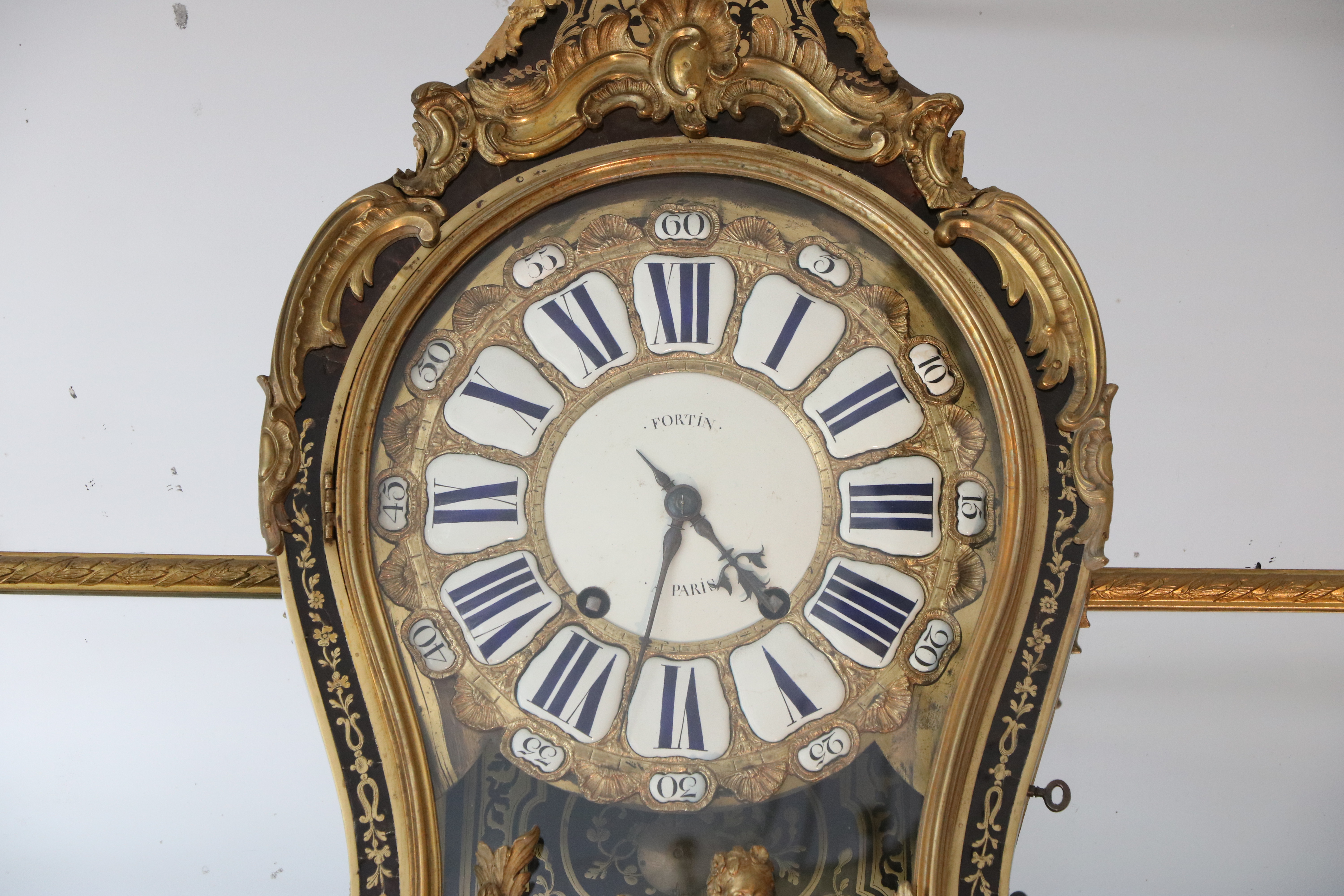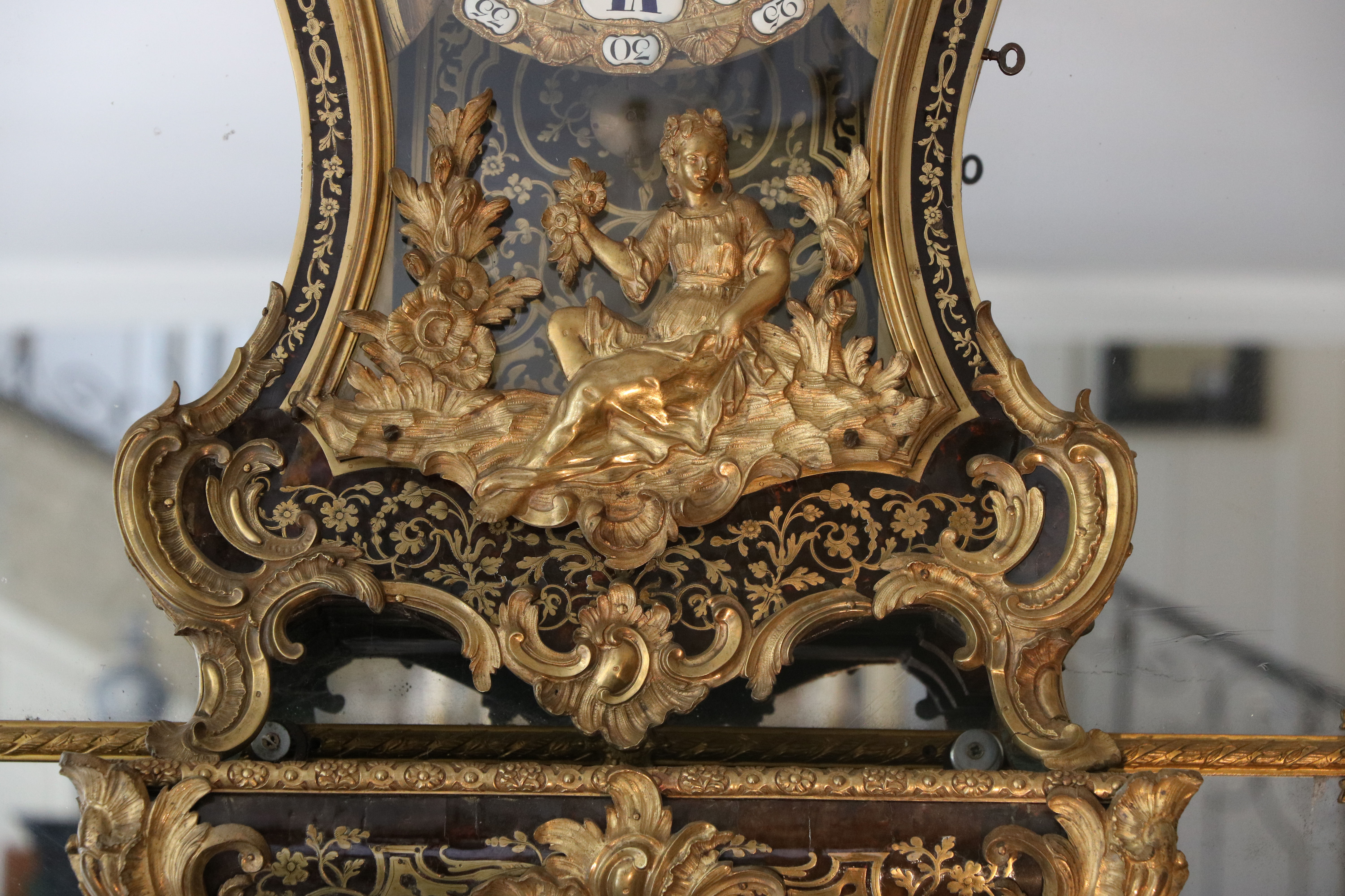 Grand cartel et sa console en marqueterie Boulle composé d’écailles de tortue et de laiton. Sa forme moulurée s’inspire de l’architecture. La marqueterie présente des motifs d’arabesques, de rinceaux, de lambrequins et d'un C couronné de feuillage sur le haut du cartel. Ce dernier est richement garni de bronzes dorés et ciselés. En façade sous le tambour, un décor en bronze avec relief présente une allégorie féminine flanquée de bouquets de fleurs. Le cartel repose sur quatre petits pieds à cartouches et agraffes surmontés de guirlandes, enroulées de lauriers. Le cadran émaillé indique les heures en chiffres romains. Epoque Louis XV Etat d'usage H. 127 x L. 46 x P. 24,5 cm