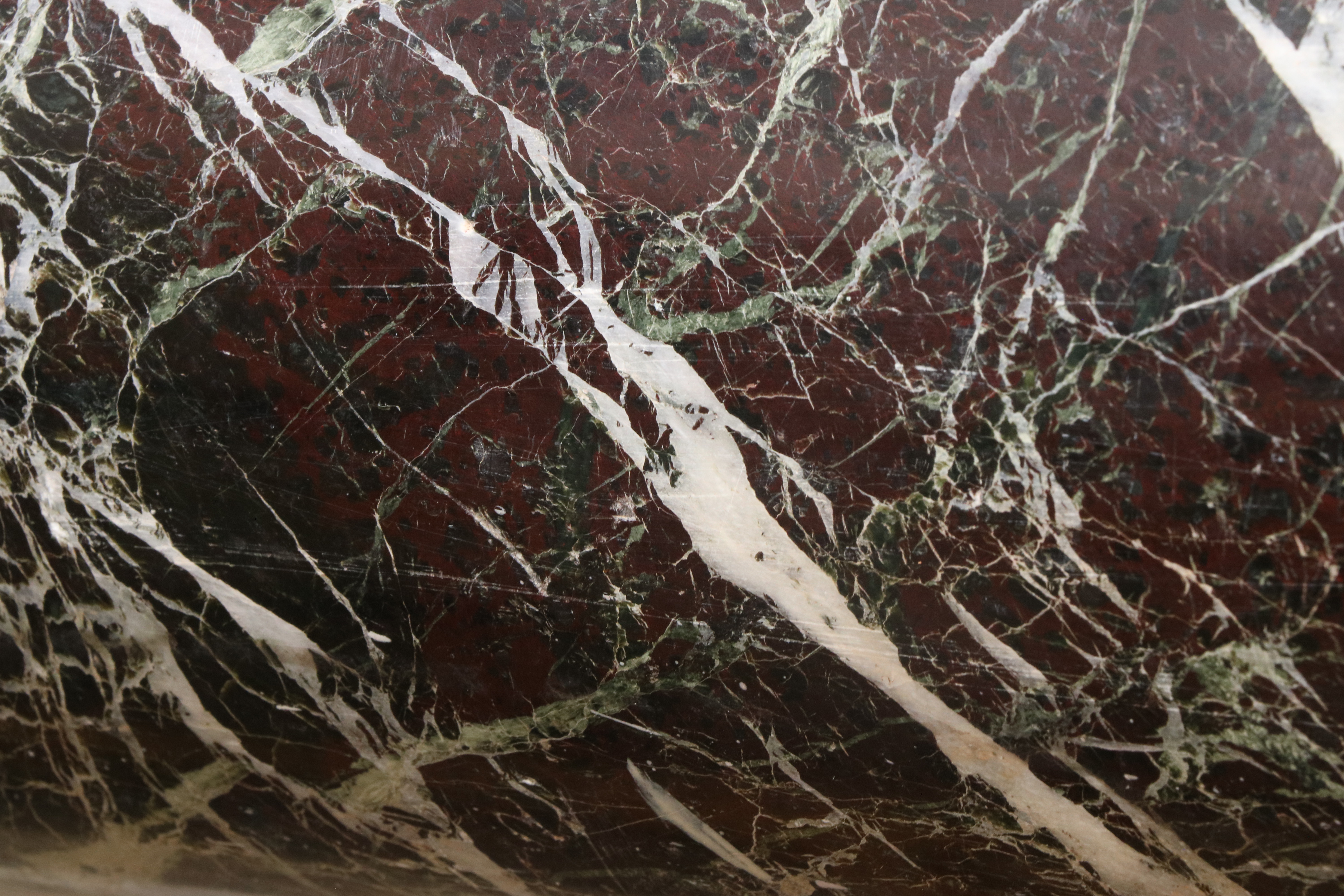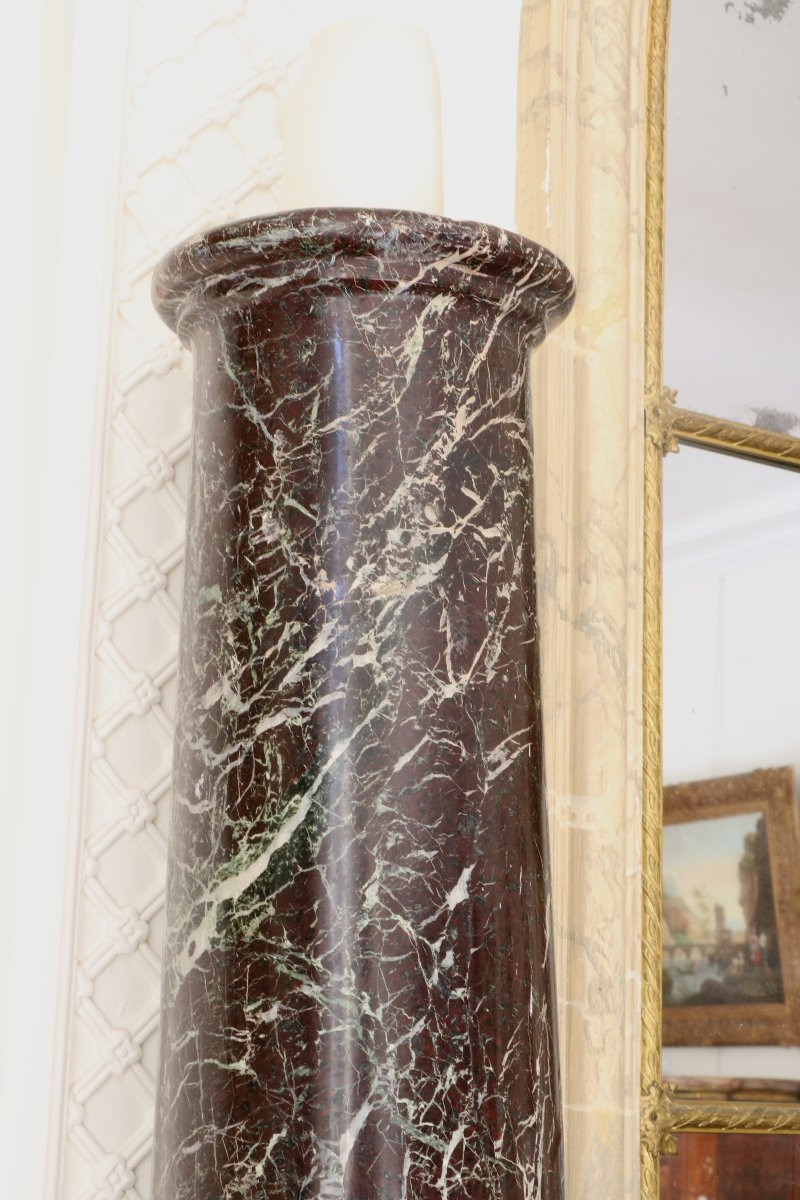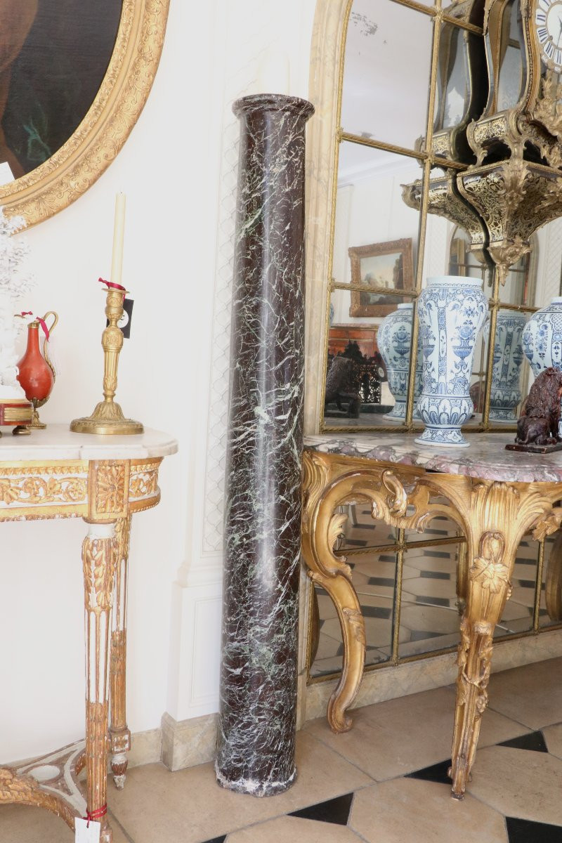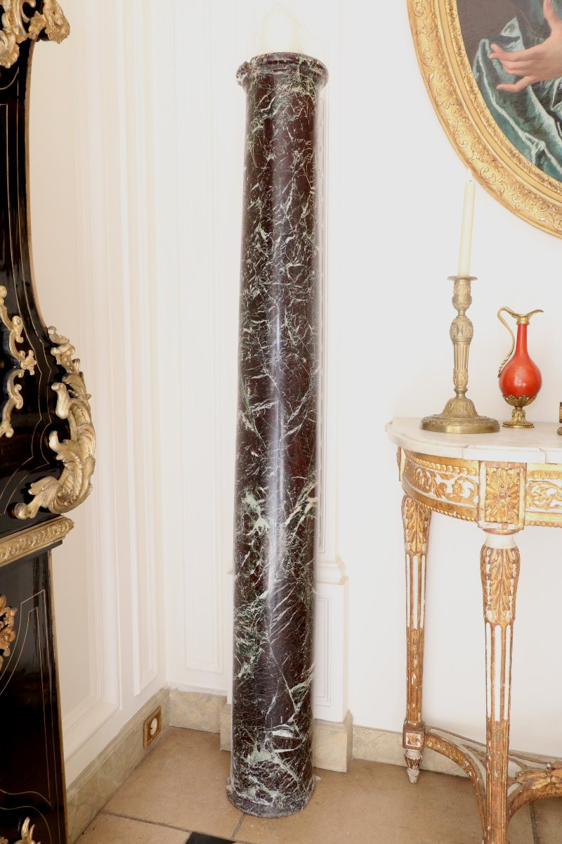 Paire de colonnes en marbre levanto vert et rouge Epoque XVIIIe siècle Accidents aux moulures H. 163 x D. 20 cm La réalisation de notre paire de colonnes, au XVIIIe siècle, a vraisemblablement puisé son inspiration dans l’ordre toscan, en vogue en Europe depuis l’avènement de la Renaissance italienne : elles ne présentent en effet aucune cannelure ou ornement particulier, mais la présence caractéristique d’un astragale faisant office de plateau ainsi que la forme du fût rappellent cet ordre antique, faisant ainsi dialoguer les arts décoratifs avec l’architecture.