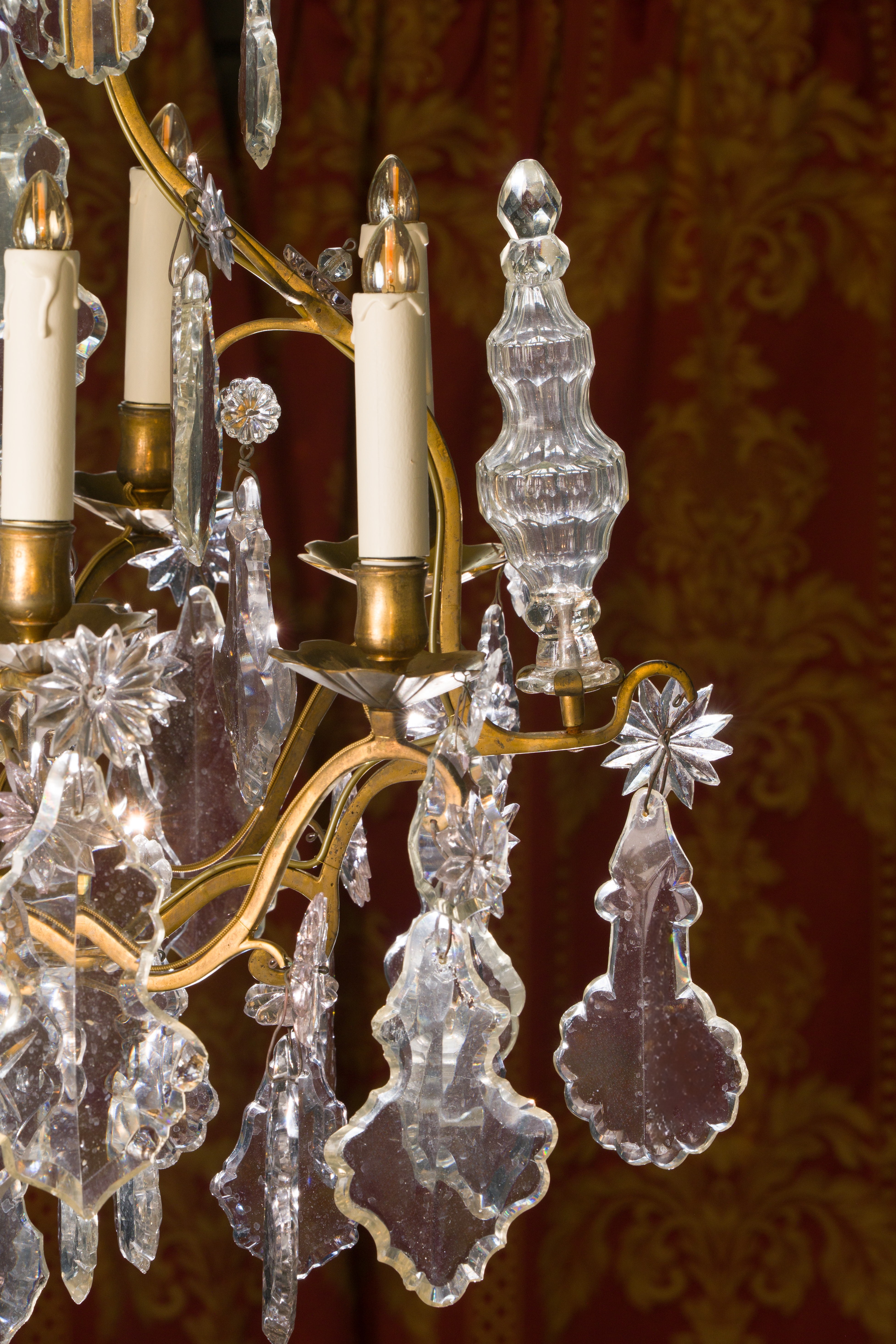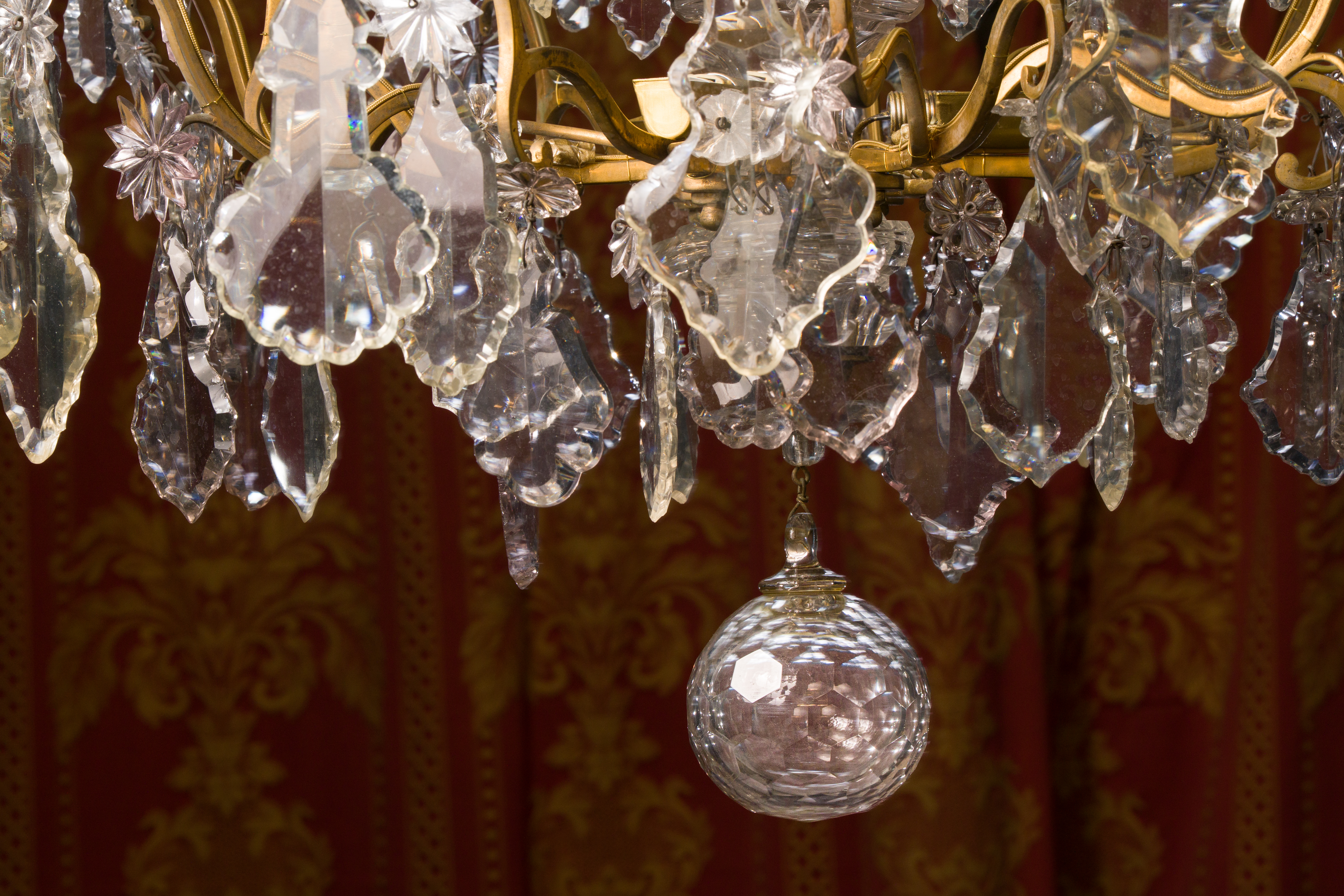 Lustre cage en cristal à neuf bras de lumière en bronze doré. Les pampilles à la découpe chantournée sont surmontées de fleurettes. Quatre autres bras s’achèvent par des poignards en cristal de forme balustre. Une boule en cristal facettée pend du lustre. Epoque Louis XV Etat d’usage - électrifié H. 120 X L. 74 cm