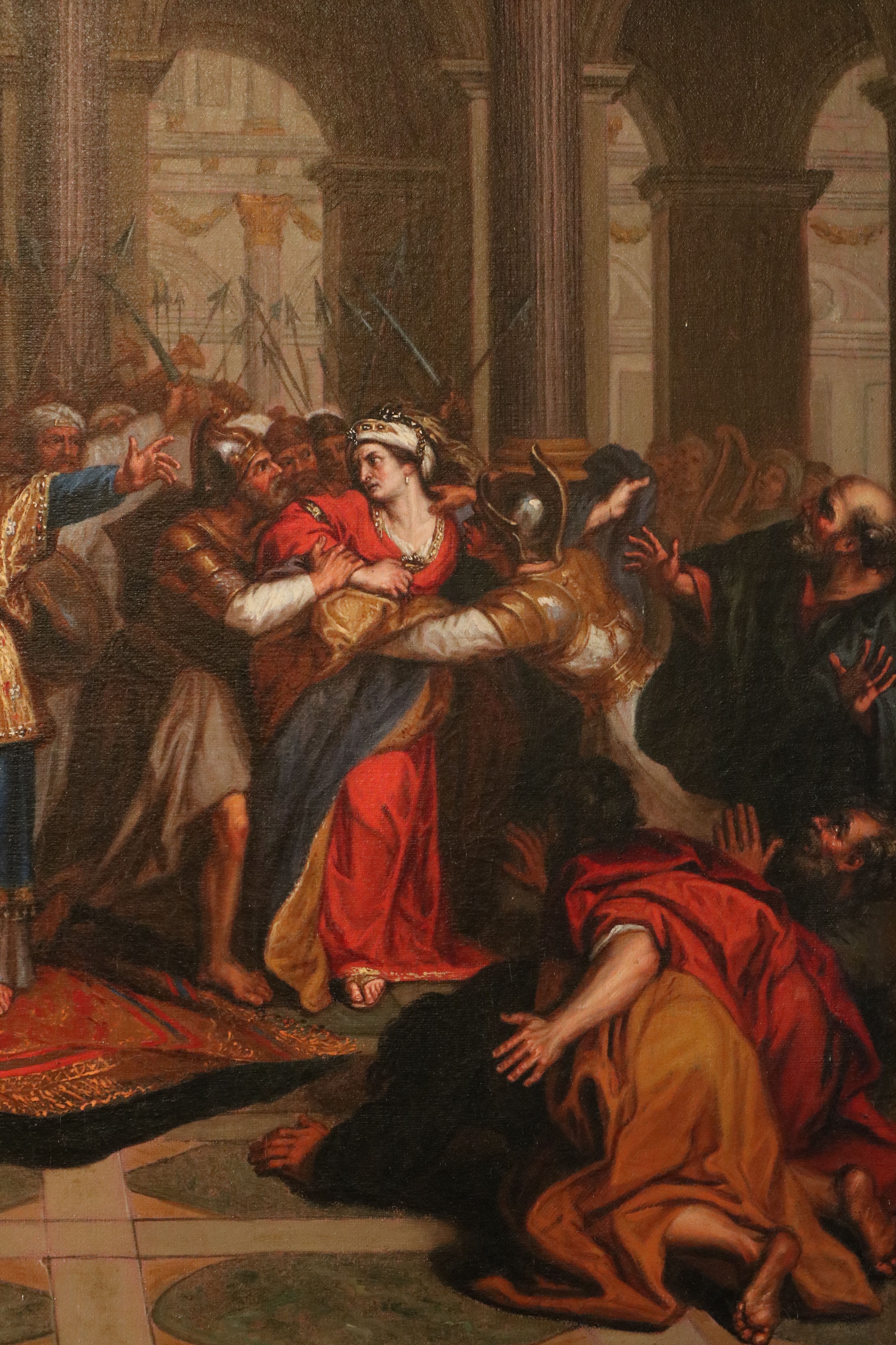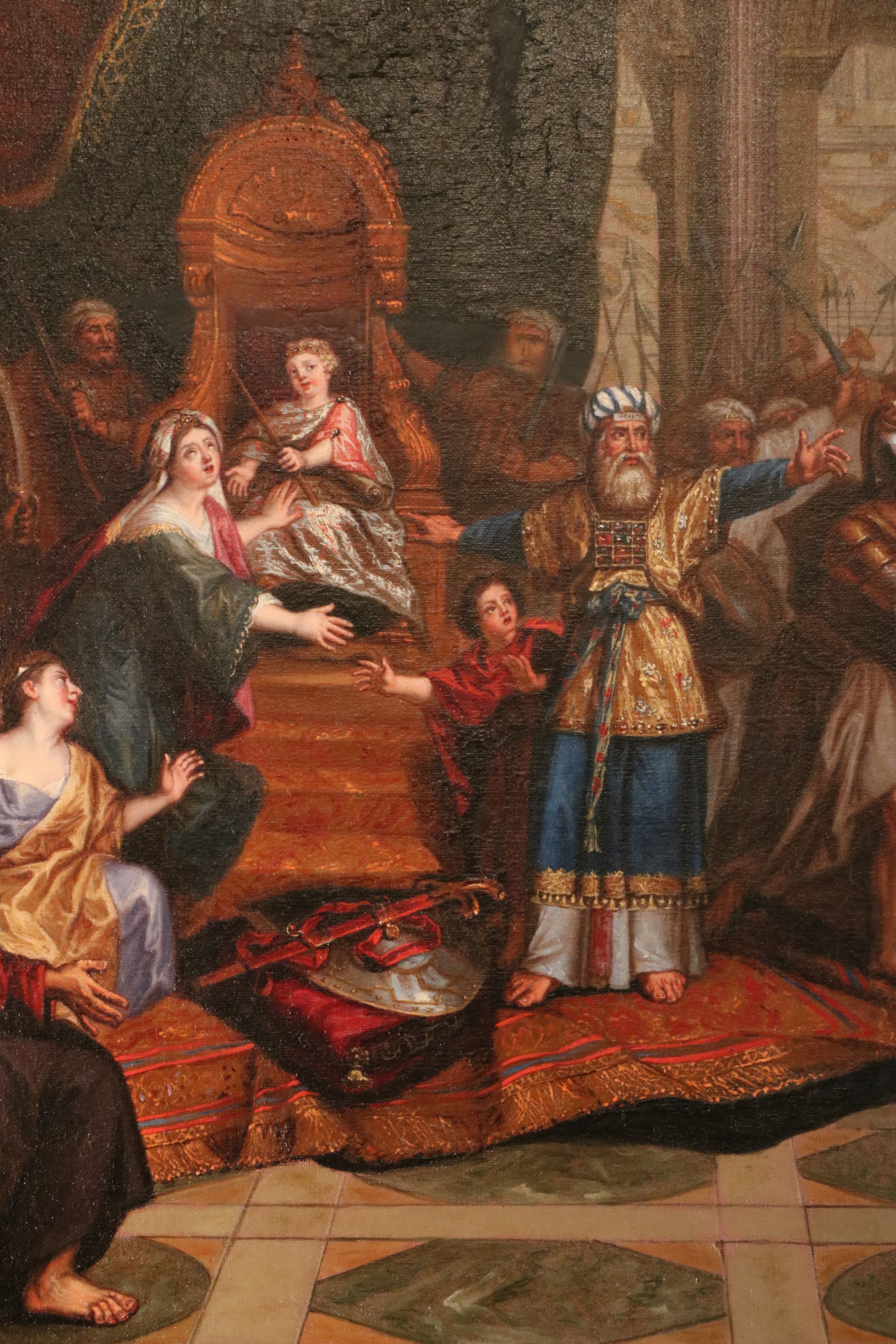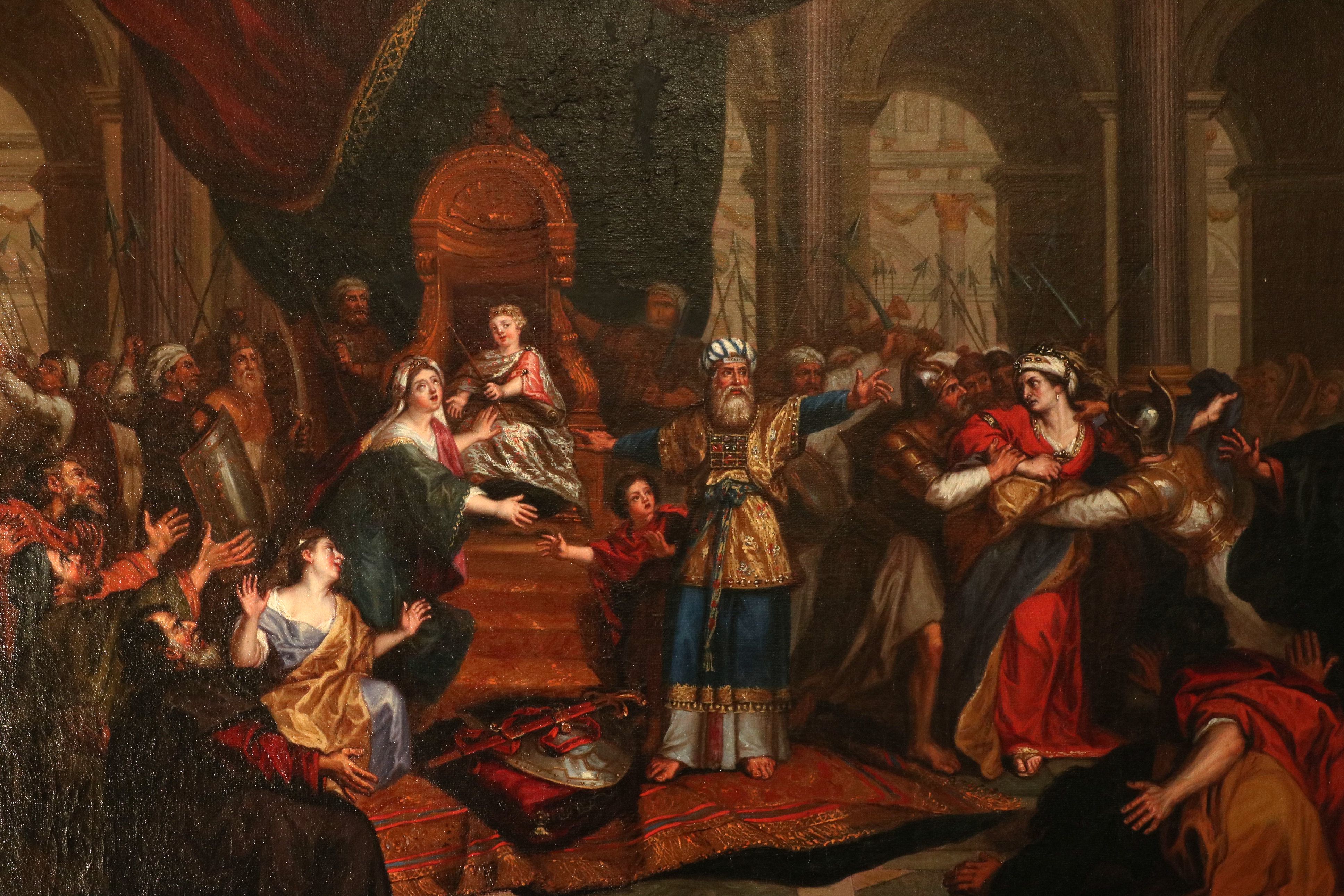 Le tableau illustre un épisode biblique tiré du Deuxième Livre des Rois (chapitre XI) : l'expulsion d'Athalie du temple. Pour s’emparer du pouvoir, Athalie avait ordonné le massacre de tous les héritiers royaux. Toutefois, Josabeth, épouse du grand prêtre Joad, réussit à sauver Joas, petit-fils d’Athalie, alors âgé de sept ans. L’enfant vient d’être proclamé roi de Juda, avec le soutien du peuple et de l’armée. Furieuse, Athalie interrompt la cérémonie, entre dans le temple et tente de s’en prendre à l’enfant. Elle est alors arrêtée par les soldats, qui la traînent hors du sanctuaire malgré ses cris et sa résistance.