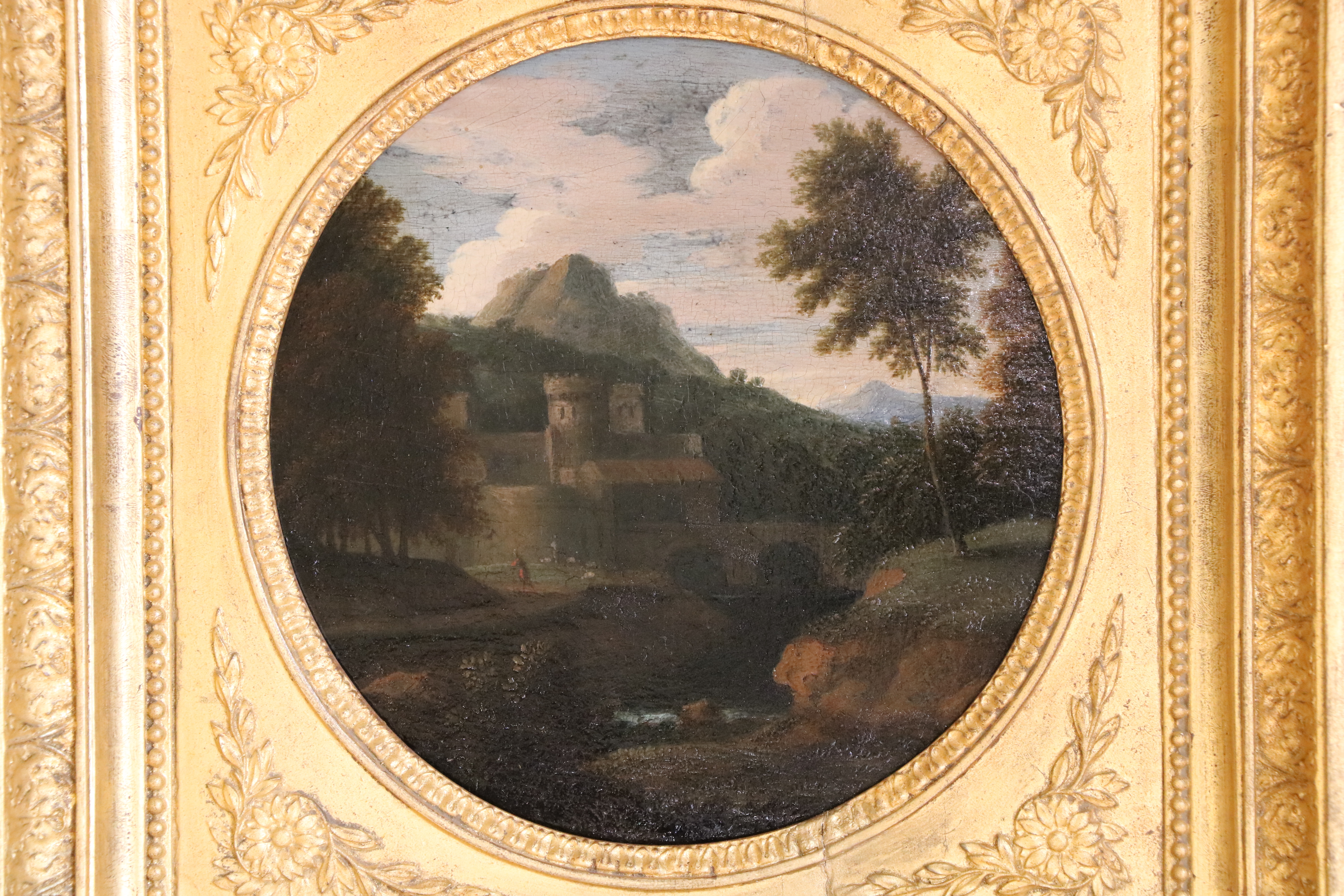 Gaspard Dughet (attribué à), Rome 1615 – Rome 1675 « Paysage animé sur fond de Château ». Ecole Française du XVIIème siècle. Huile sur bois de forme Tondo. Cadre en stuc doré à l’or Etat d'usage H. 38,5 x L. 38,5 cm D. 25,3. Gaspard Dughet appelé communément Gaspard Poussin est un peintre de compositions religieuses, paysages animés, paysages dessinateur. Gaspard Dughet était fils de sujets français fixés à Rome. Nicolas Poussin se trouvant en 1620 seul et isolé à Rome, fut reçu dans l’intimité de la famille Dughet. C’est ainsi que Dughet fut fortement influencé par Poussin et qu’il consacra sa vie à la peinture. Ses œuvres empreintes de grandeur et de solennité, Dughet excella dans la représentation des effets de lumière au soleil levant et couchant.