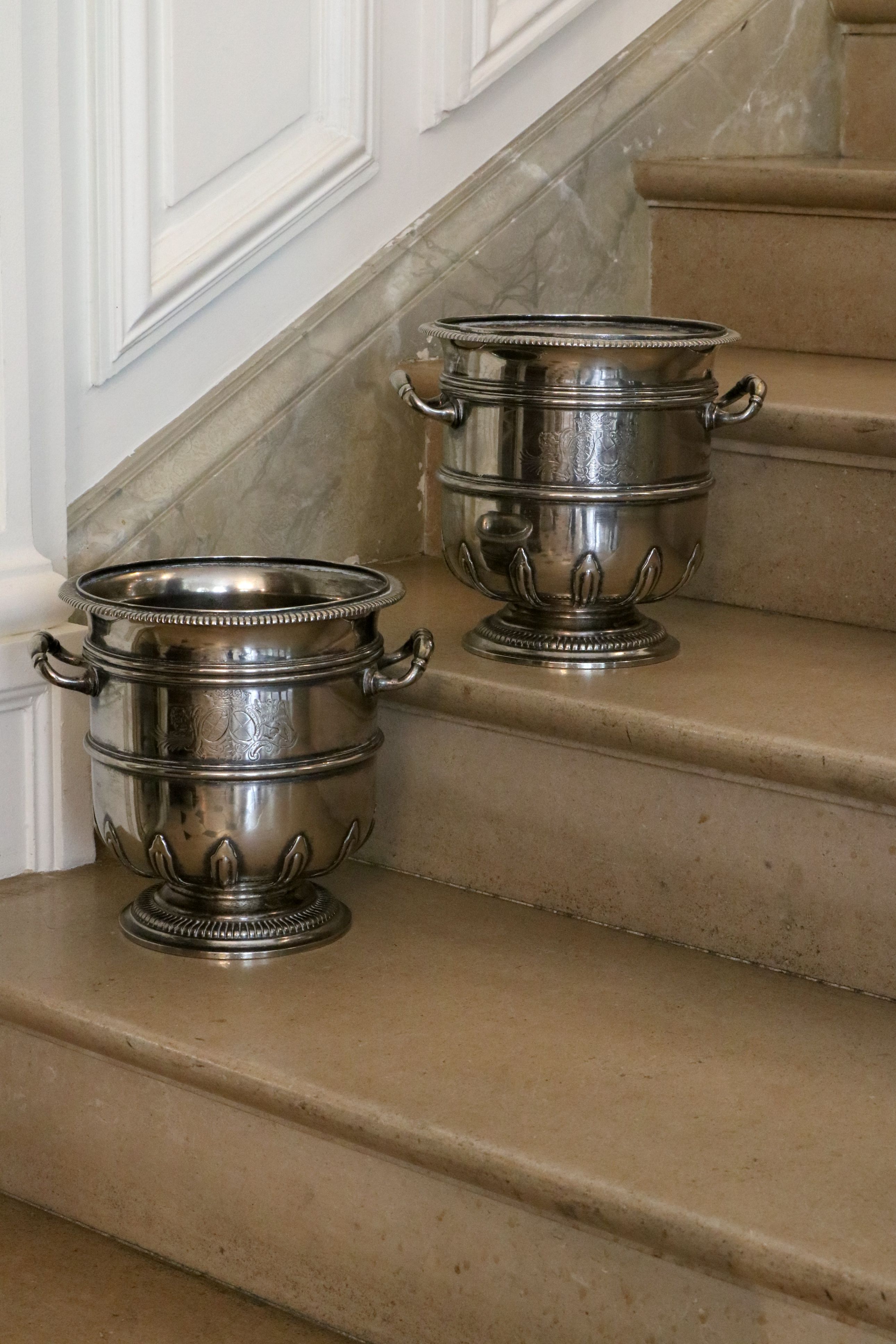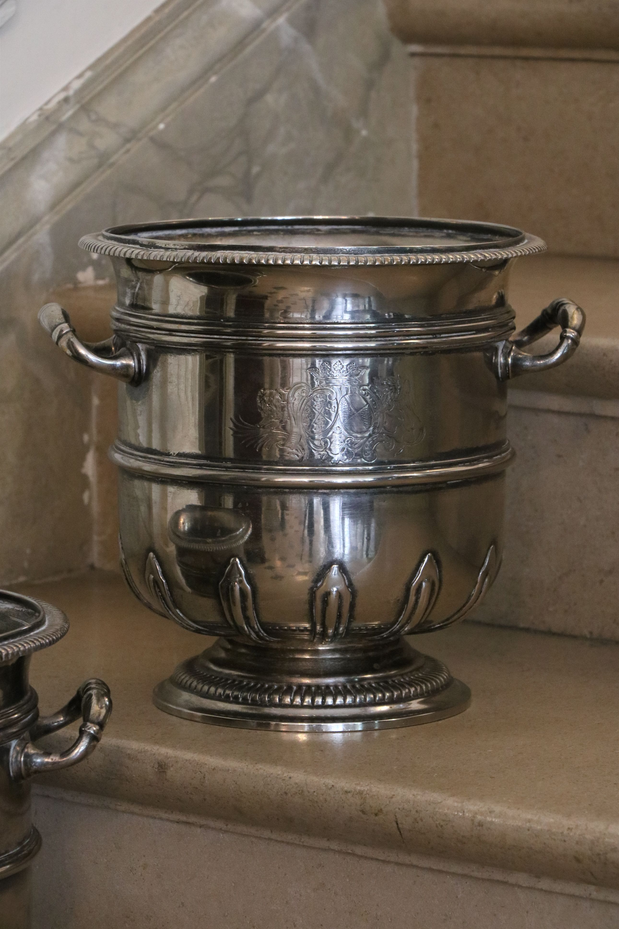 Rafraîchissoirs sur piédouche godronné, la panse ornée de filets ainsi que de palmes stylisées. Des armoiries ducales figurent au centre, présentant deux blasons couronnés, flanqués d'un lion et d'un griffon. Deux poignées baguées sous l'encolure godronnée se redressent vers le haut. Vers 1800 Etat d'usage H.21,5 x D.21,5 cm