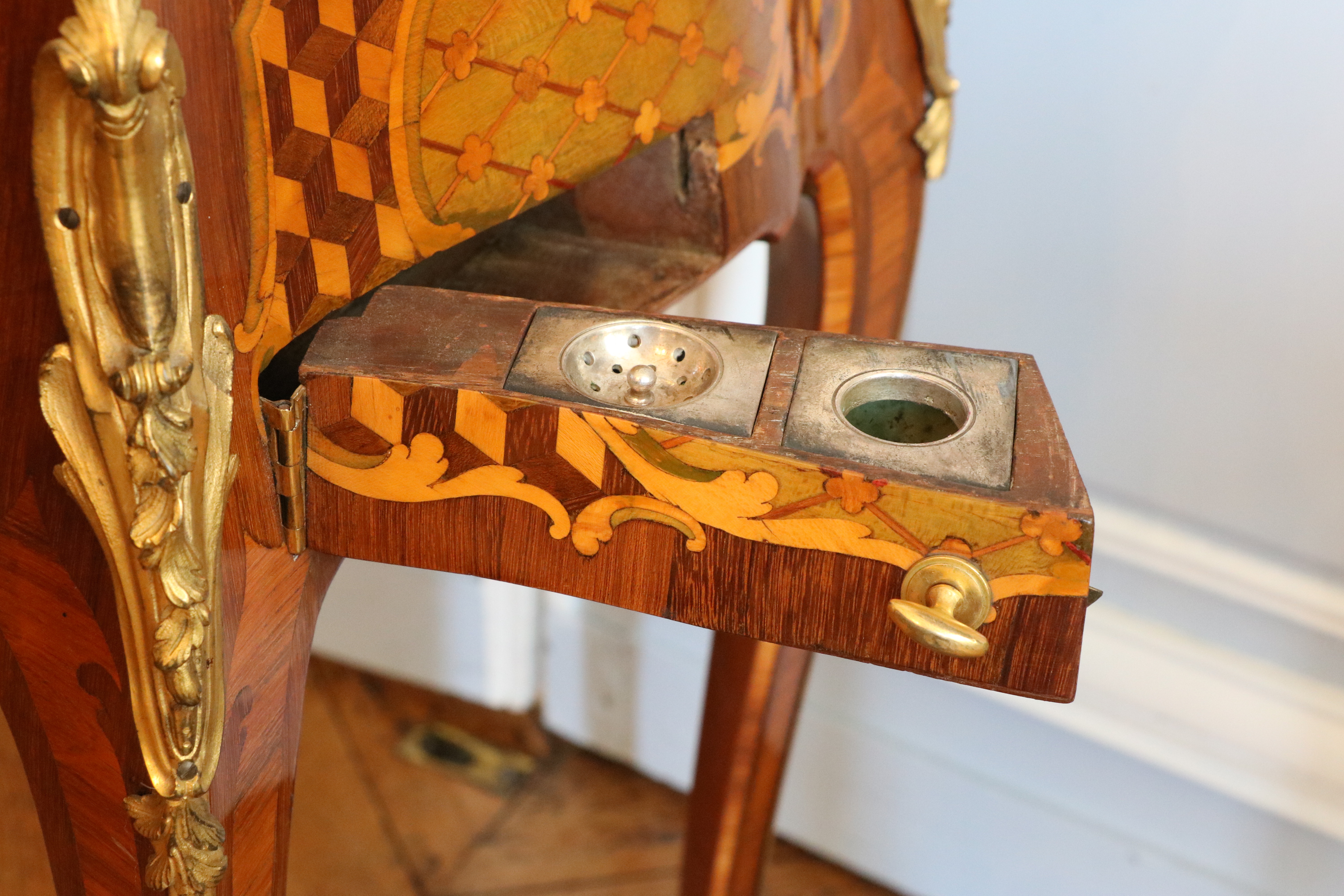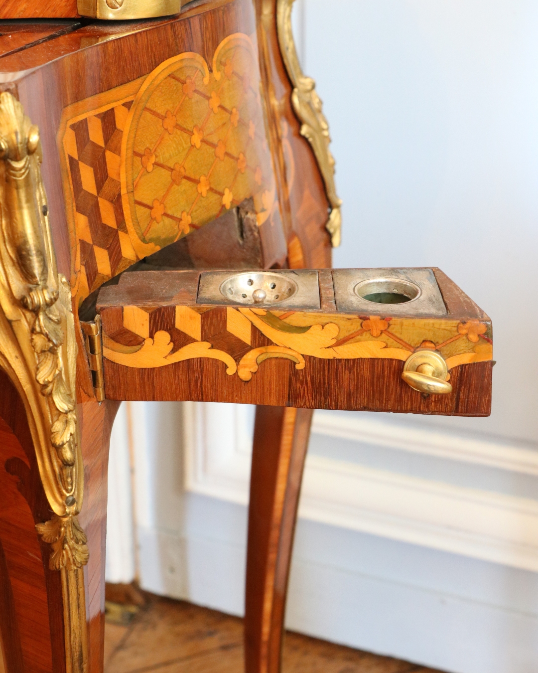 Petit tiroir discret pivotant sur le côté garni d'un encrier et sablier à écrire en métal argenté. Ornementation de bronzes ciselés et dorés. Estampilles (deux fois) de Léonard Boudin (reçu maître en 1761) et Jurande.
