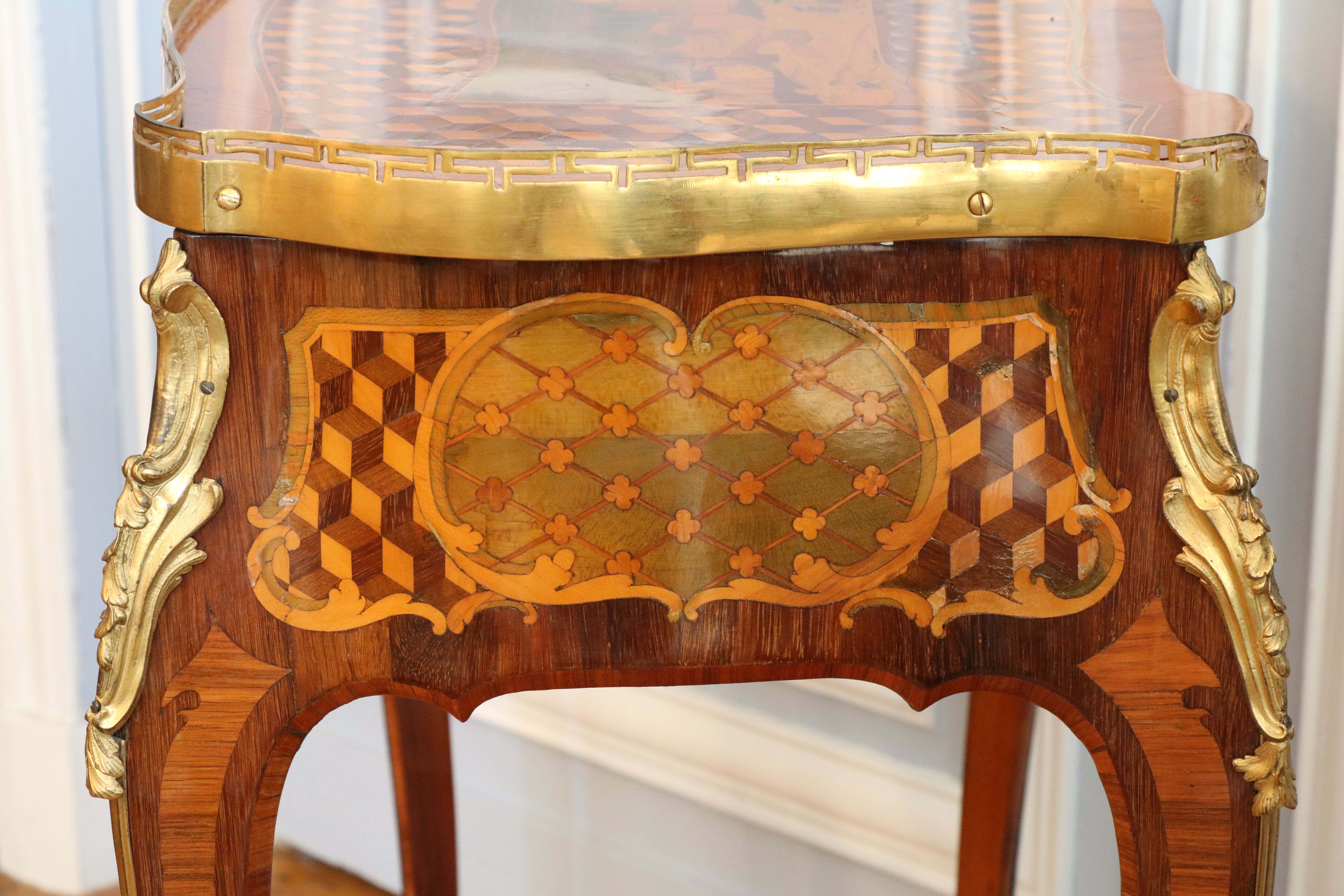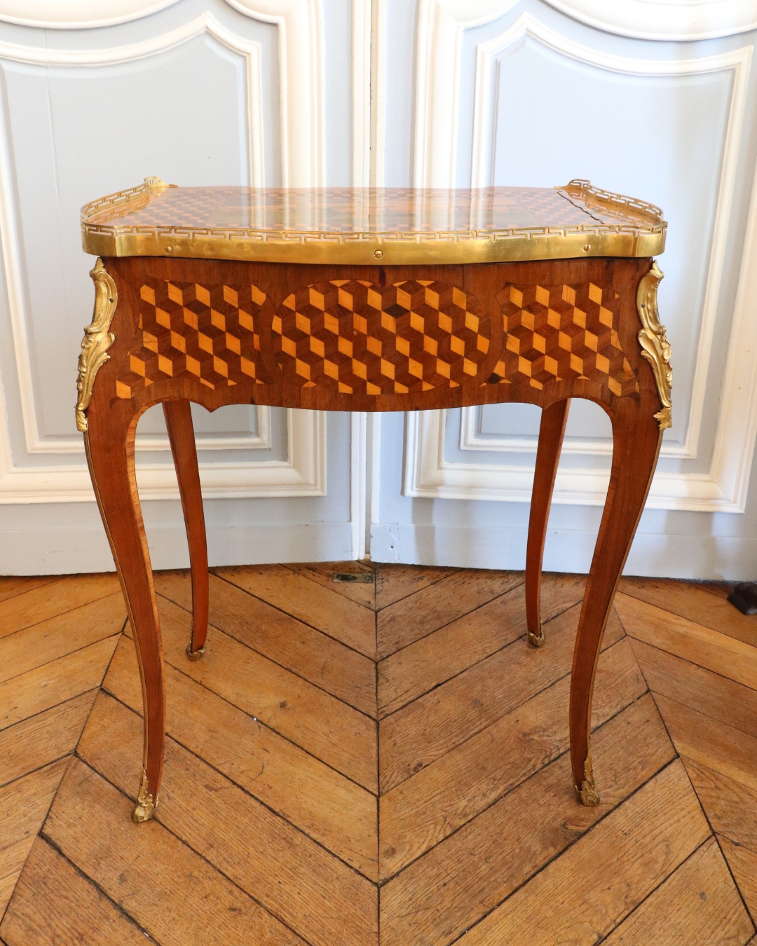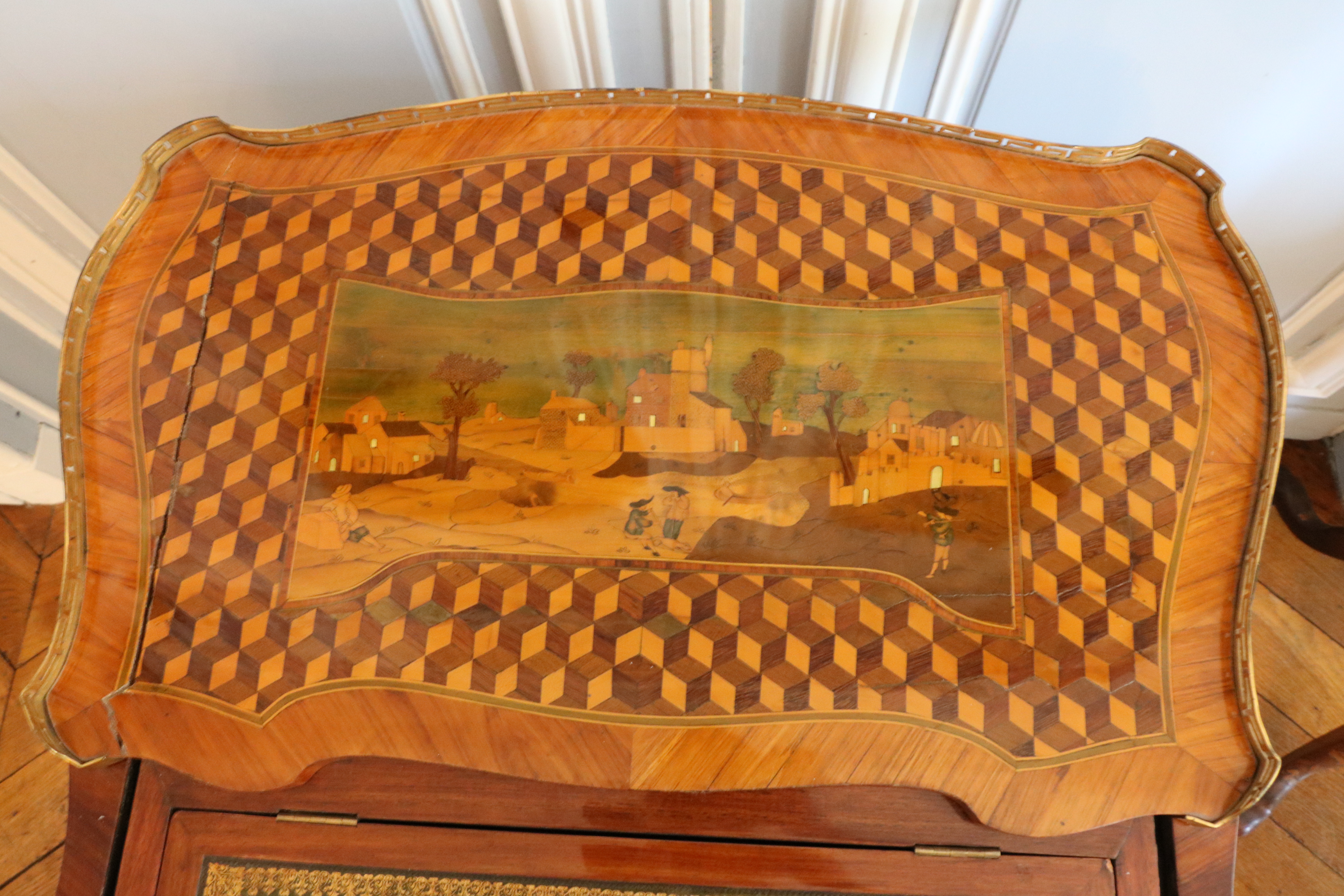 Table à écrire dite « à la Pompadour », de dame entièrement à décor de marqueterie géométrique de cubes et sur le plateau d'un paysage avec personnages et architectures dans une réserve ainsi que sur l'avant avec incrustations de nacre.