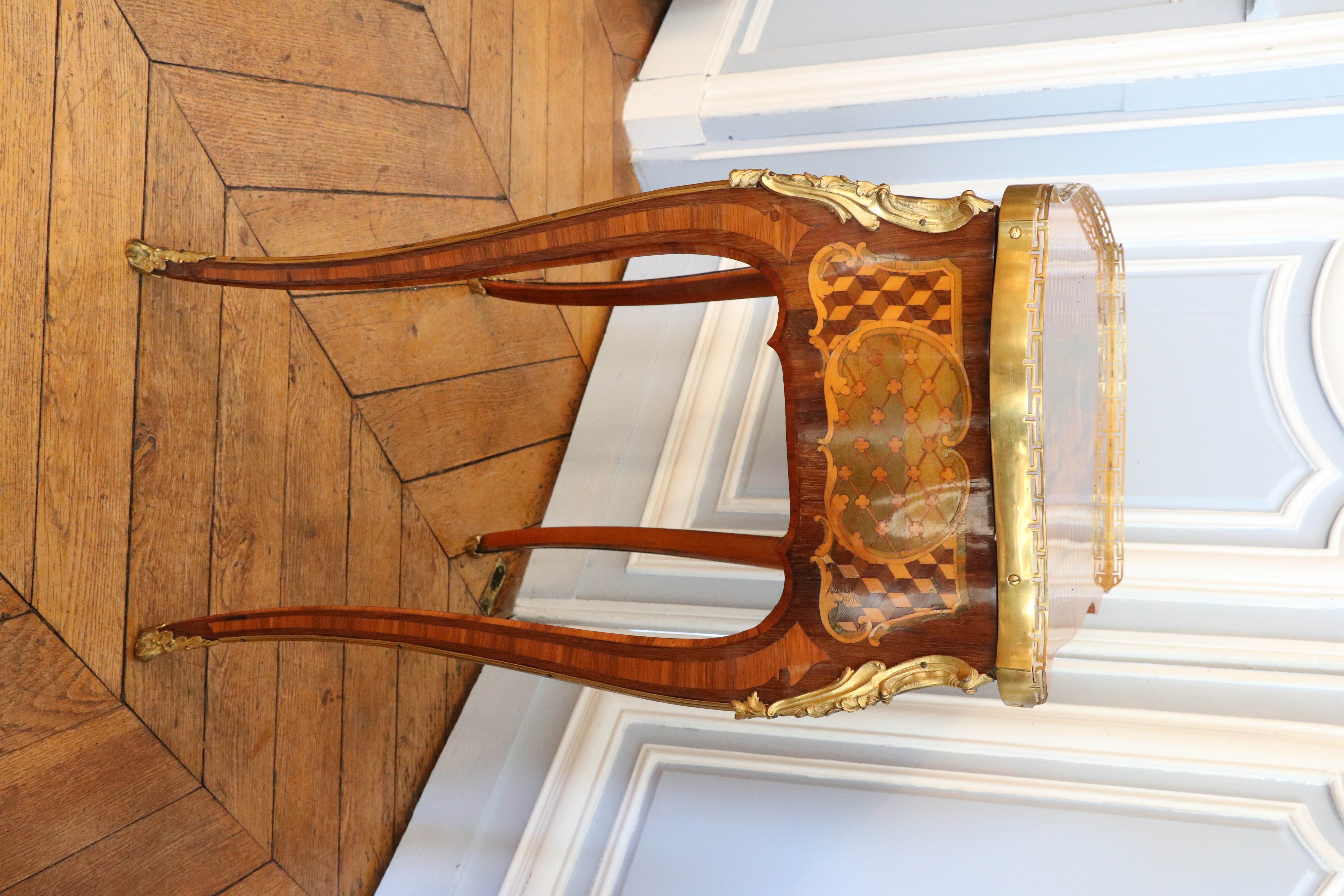 Notre table que nous pouvons dater des années 1770 s'inscrit dans la période de Transition entre les règnes de Louis XV et Louis XVI et reprend la structure. Elle revêt un décor hétérogène et colorés de différentes essences alliant scènes pittoresques aux lignes et droites et marqueteries cubiques à leurs cartouches vineux et aux volutes formant rocailles. Ses formes mouvementées démontrent le maintien au cours de cette décennie d'un attachement des formes héritées du Rococo tout en révélant l'évolution des arts pour un goût « à la grec » aux lignes plus sévères.