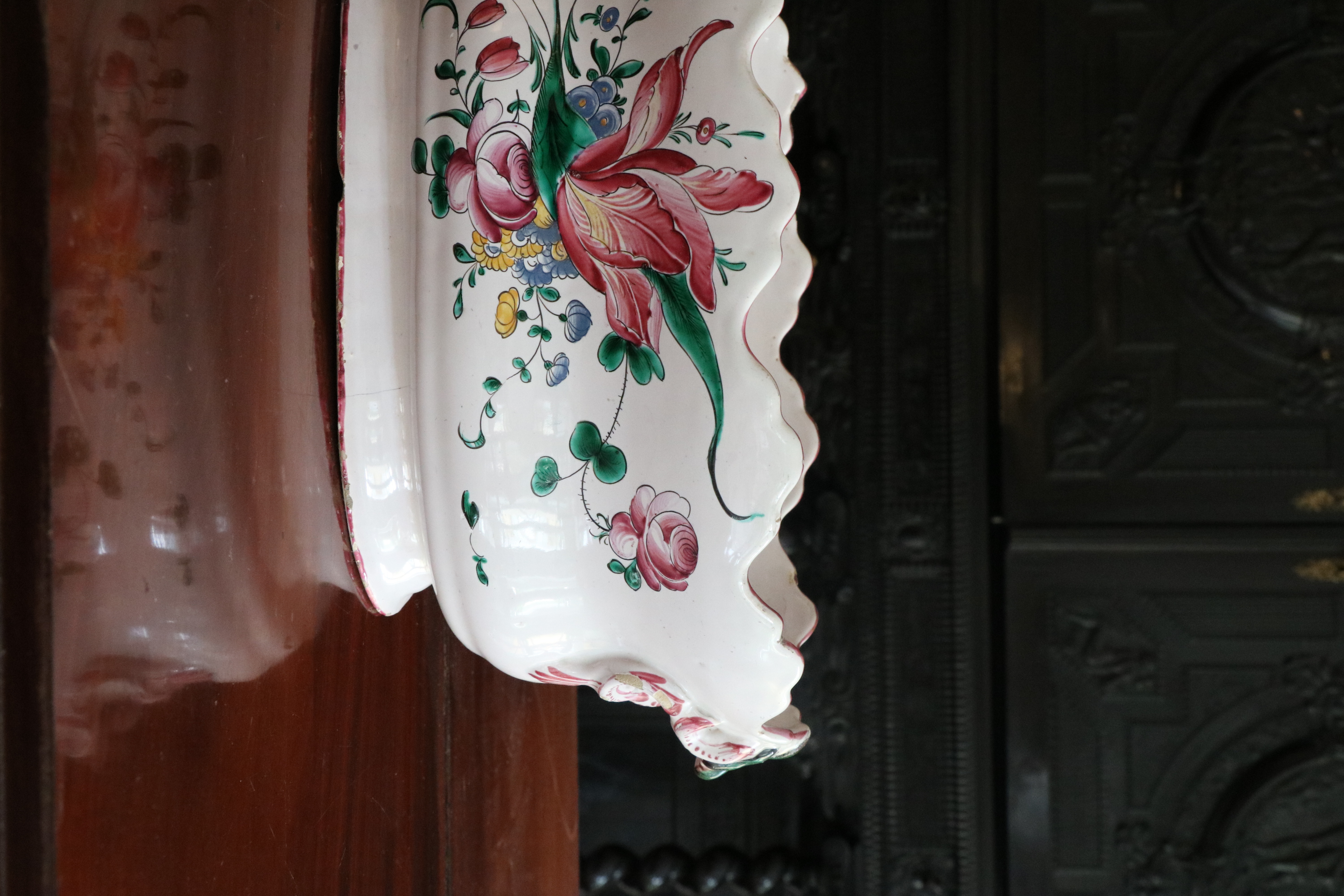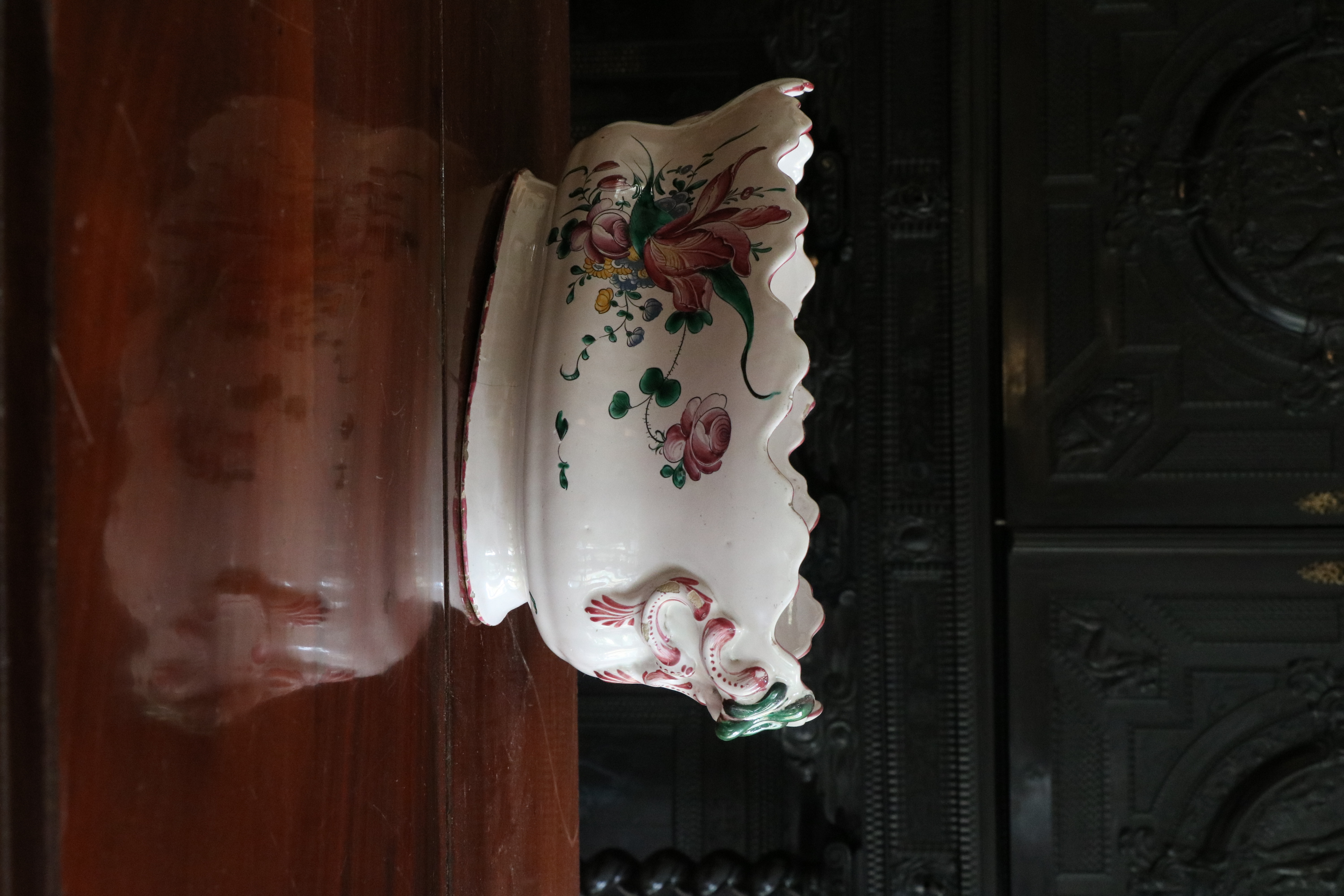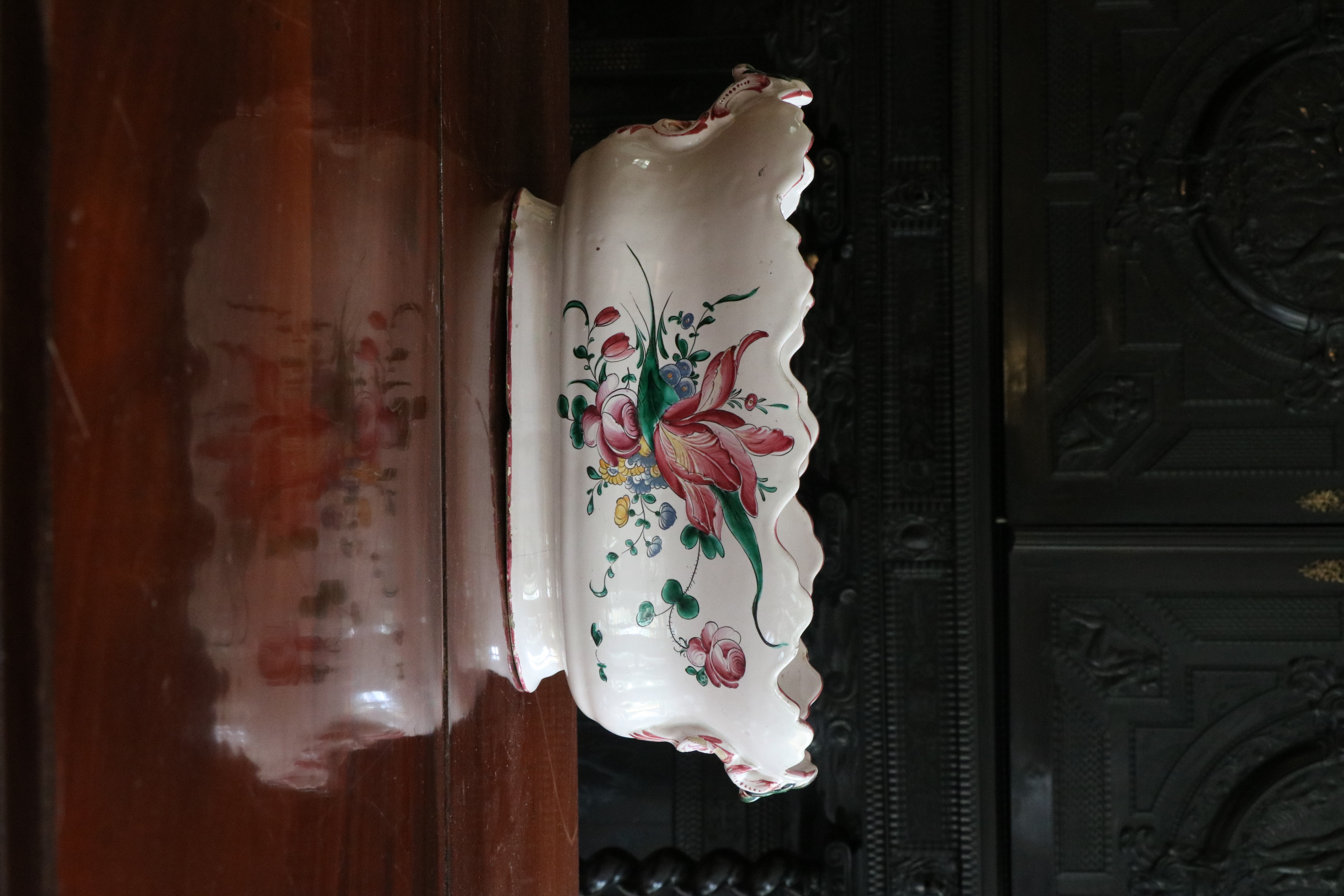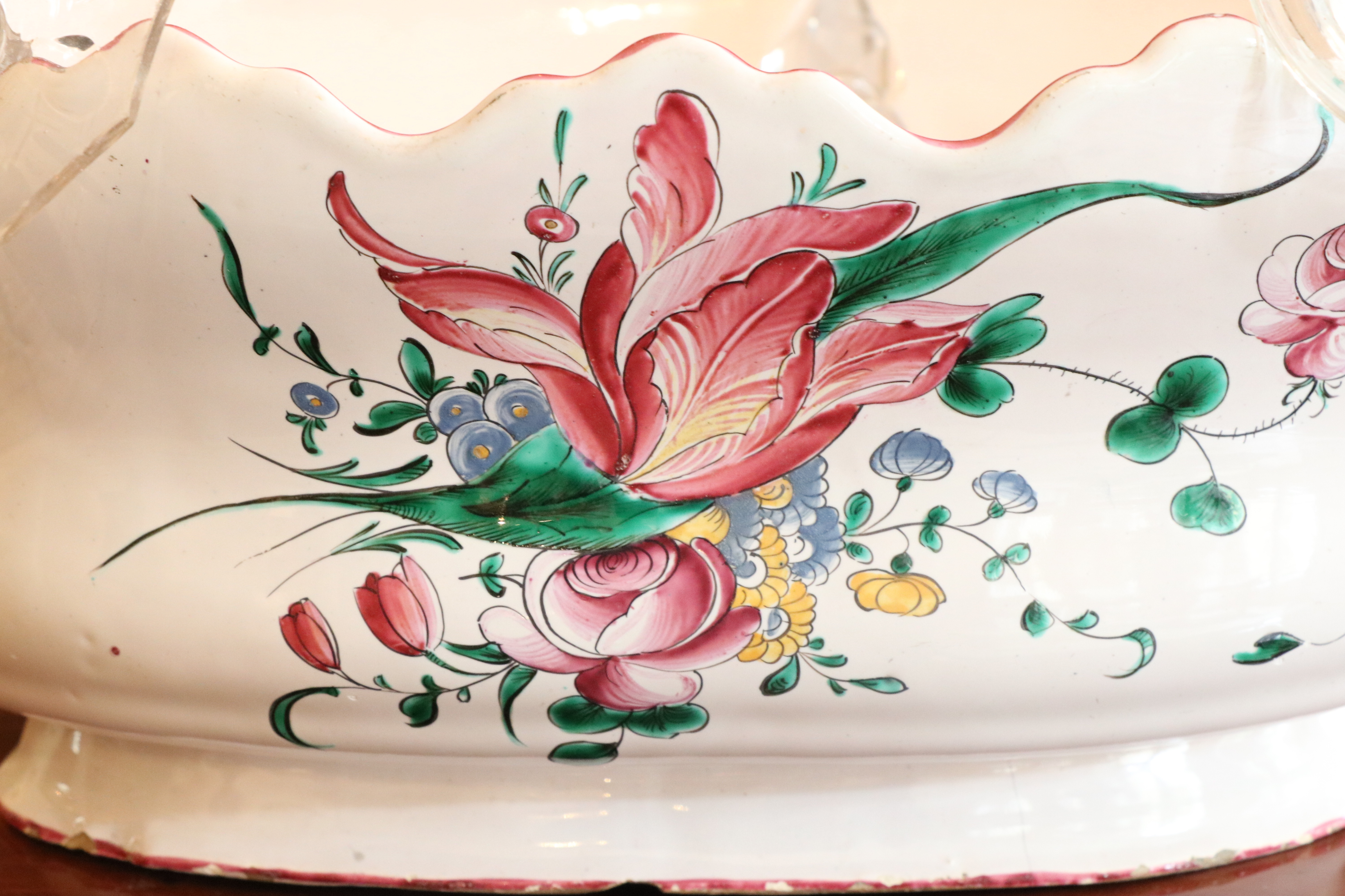 Rafraîchissoir ovale sur piédouche avec bordure dentelée et panse chantournée. IL présente un décor floral polychrome. XVIIIème, période Jacques CHAPELLE Etat d'usage H.13 x L. 33 ccm