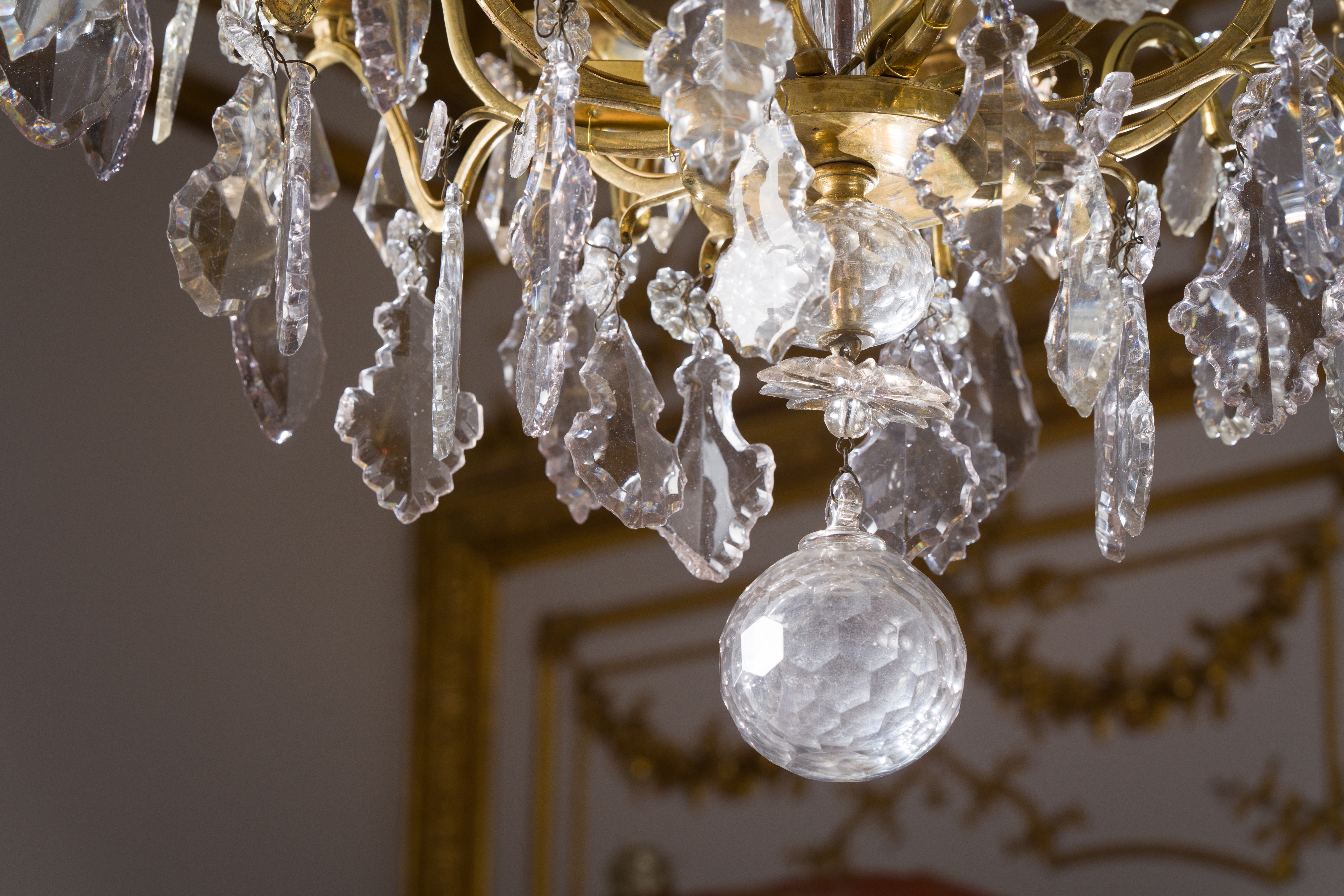 Des poignards en cristal alternent avec les bras de lumière mouvementés. Les pampilles à découpe chantournée sont sumrontées de fleurettes. Deux boules en cristal à facettes hexagonales pendent du lustre, séparées toutes deux par une fleur. Epoque Louis XV Etat d'usage H.132 x D. 76 cm