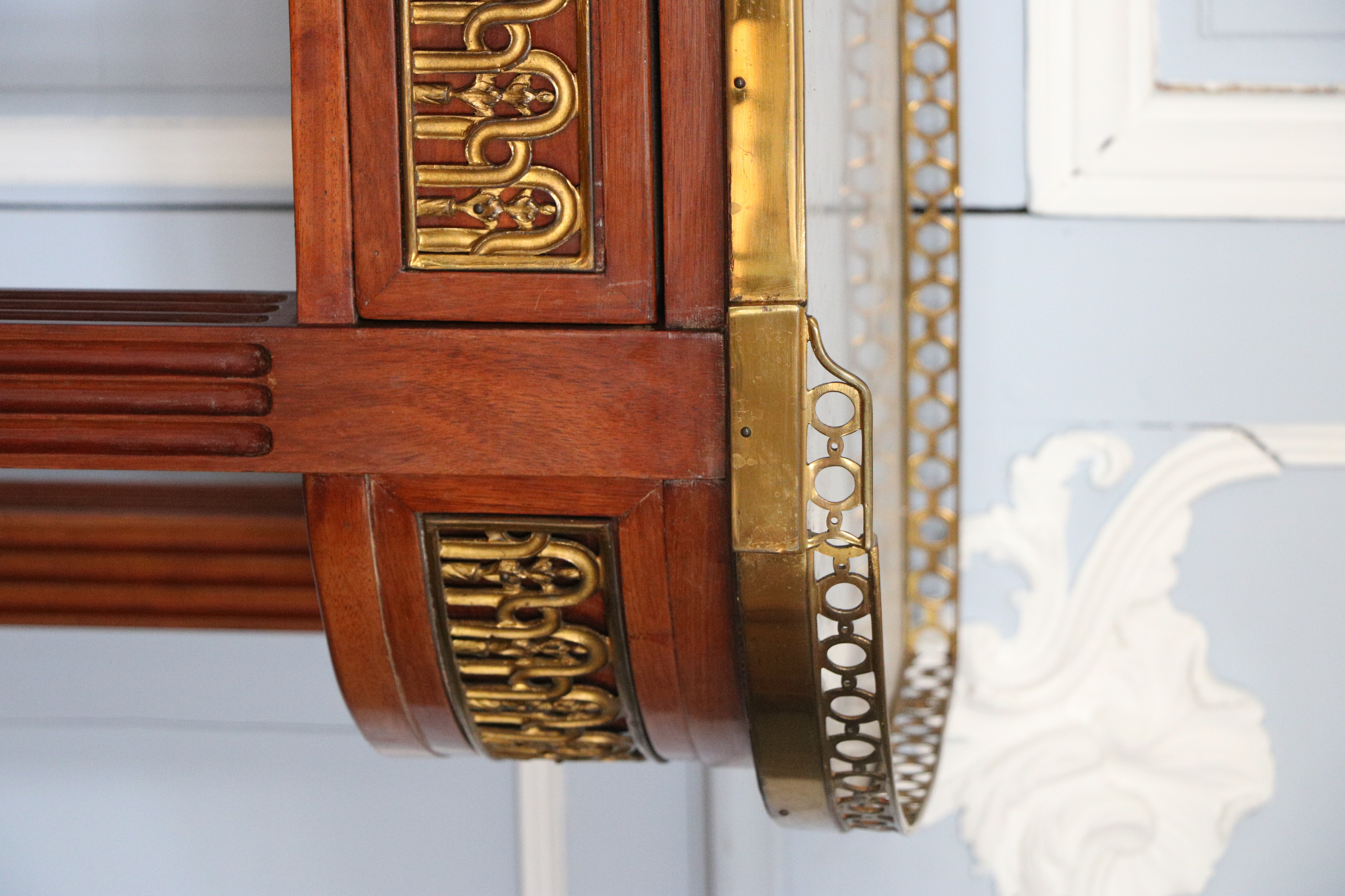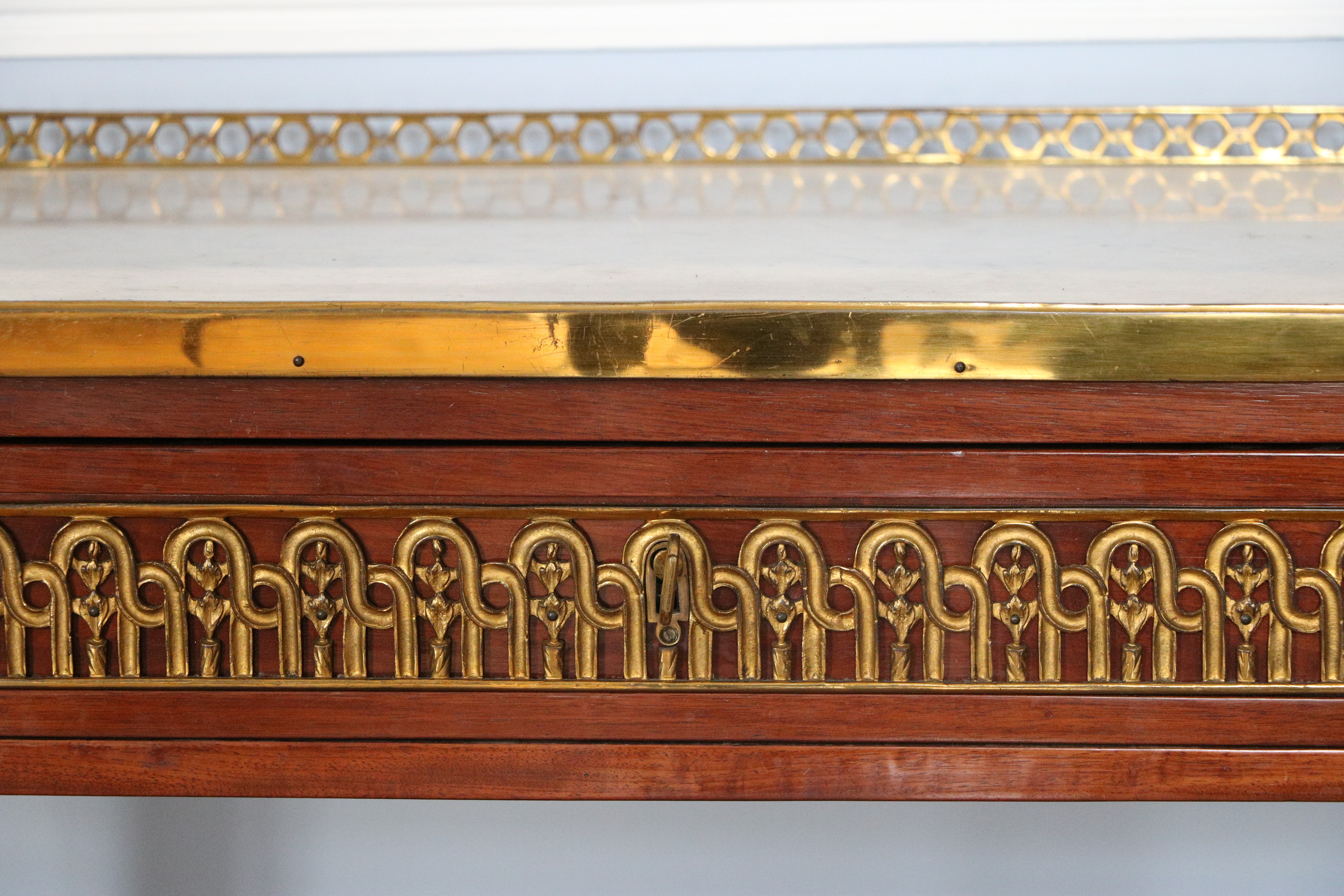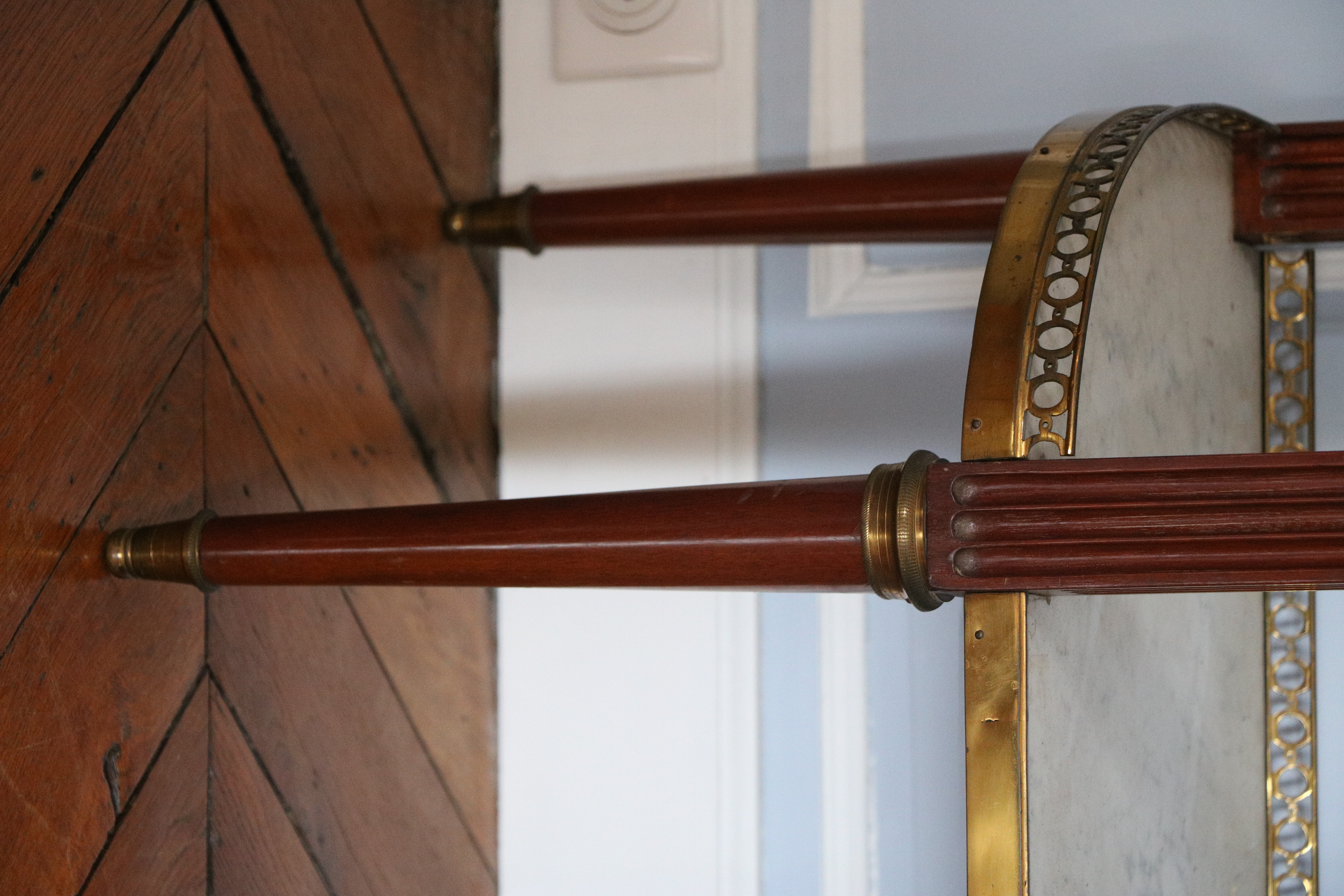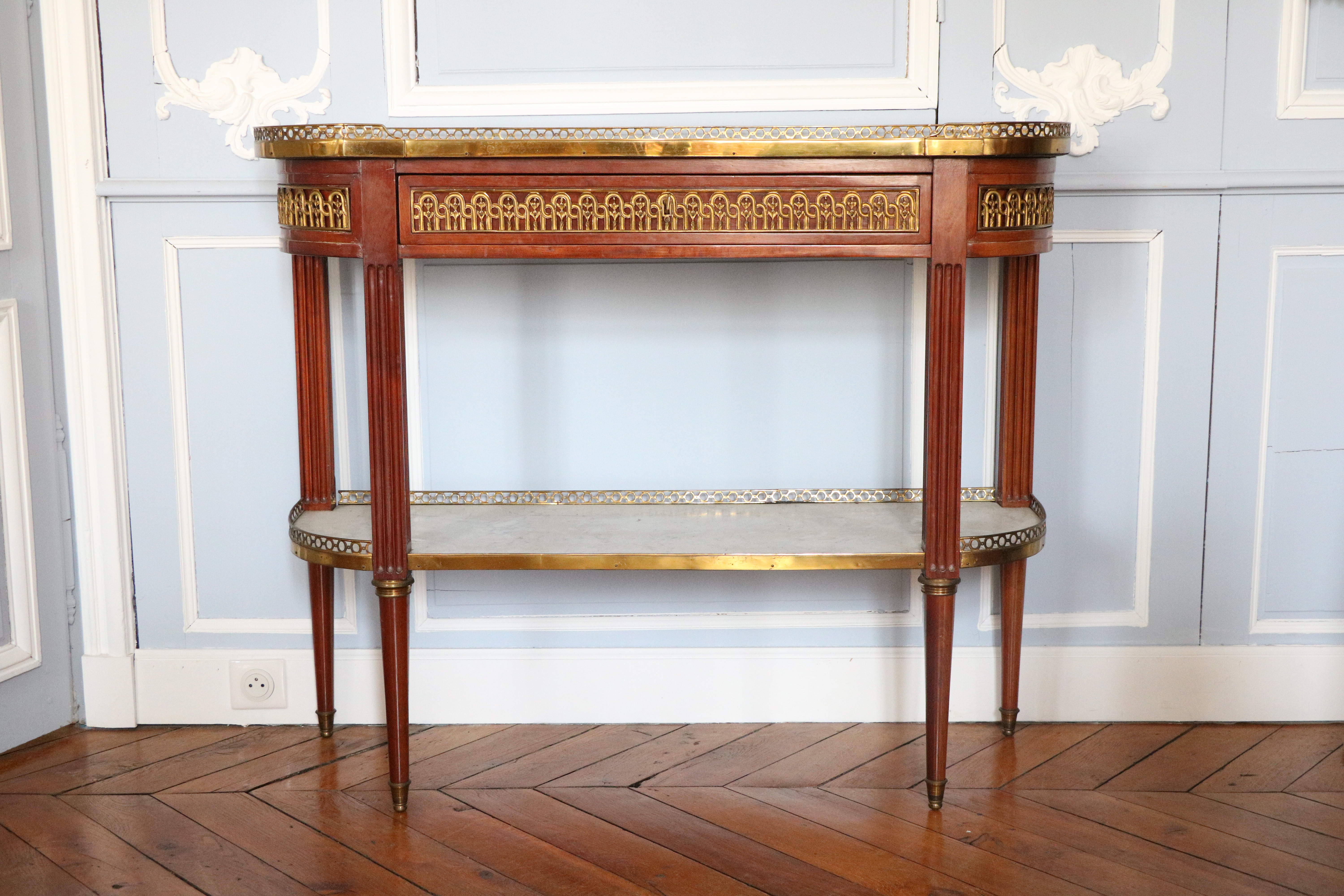Console en acajou avec dessus et tablette en marbre de carre blanc. Une galerie ajourée avec formes géométriques court sur le pourtour du meuble. Une frise d’entrelacs alternant avec des asperges s’ajuste à la ceinture du meuble. Les montants présentent des cannelures sur leur quatre faces. La console repose sur quatre pieds fuselés avec sabots en bronze doré. Epoque Louis XVI H 96 x L. 116 x P. 39 cm Etat d’usage Charles-Erdmann Richter - Ébéniste. Maître le 4 février 1784. Fournisseur du Mobilier de la Couronne. Il se distingua dans la fabrication des meubles en acajou, tels que des bureaux à cylindre, des bibliothèques, commodes et consoles, des tables de fantaisie…