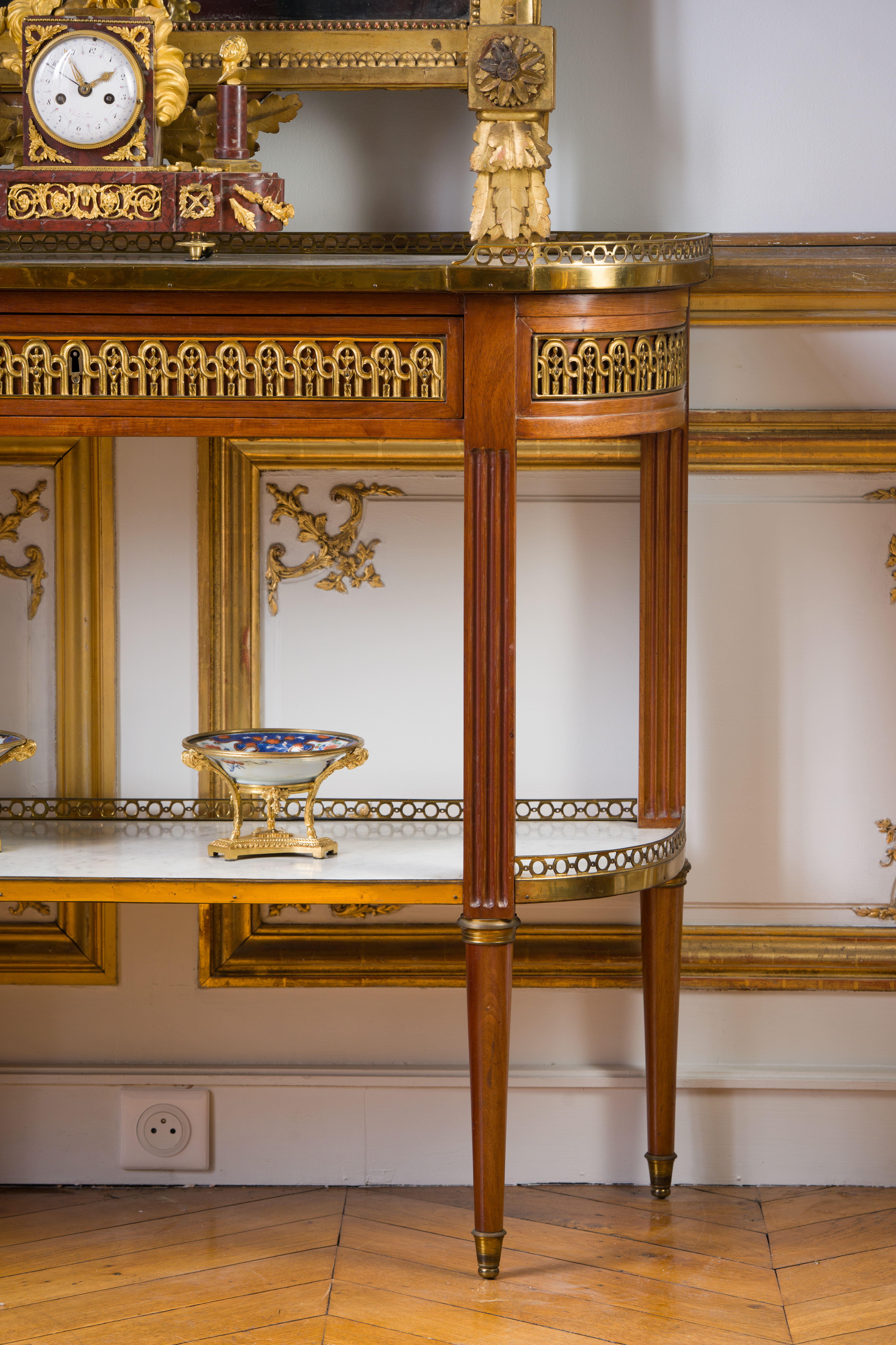 Console en acajou avec dessus et tablette en marbre de carre blanc. Une galerie ajourée avec formes géométriques court sur le pourtour du meuble. Une frise d’entrelacs alternant avec des asperges s’ajuste à la ceinture du meuble. Les montants présentent des cannelures sur leur quatre faces. La console repose sur quatre pieds fuselés avec sabots en bronze doré. Epoque Louis XVI H 96 x L. 116 x P. 39 cm Etat d’usage Charles-Erdmann Richter - Ébéniste. Maître le 4 février 1784. Fournisseur du Mobilier de la Couronne. Il se distingua dans la fabrication des meubles en acajou, tels que des bureaux à cylindre, des bibliothèques, commodes et consoles, des tables de fantaisie…