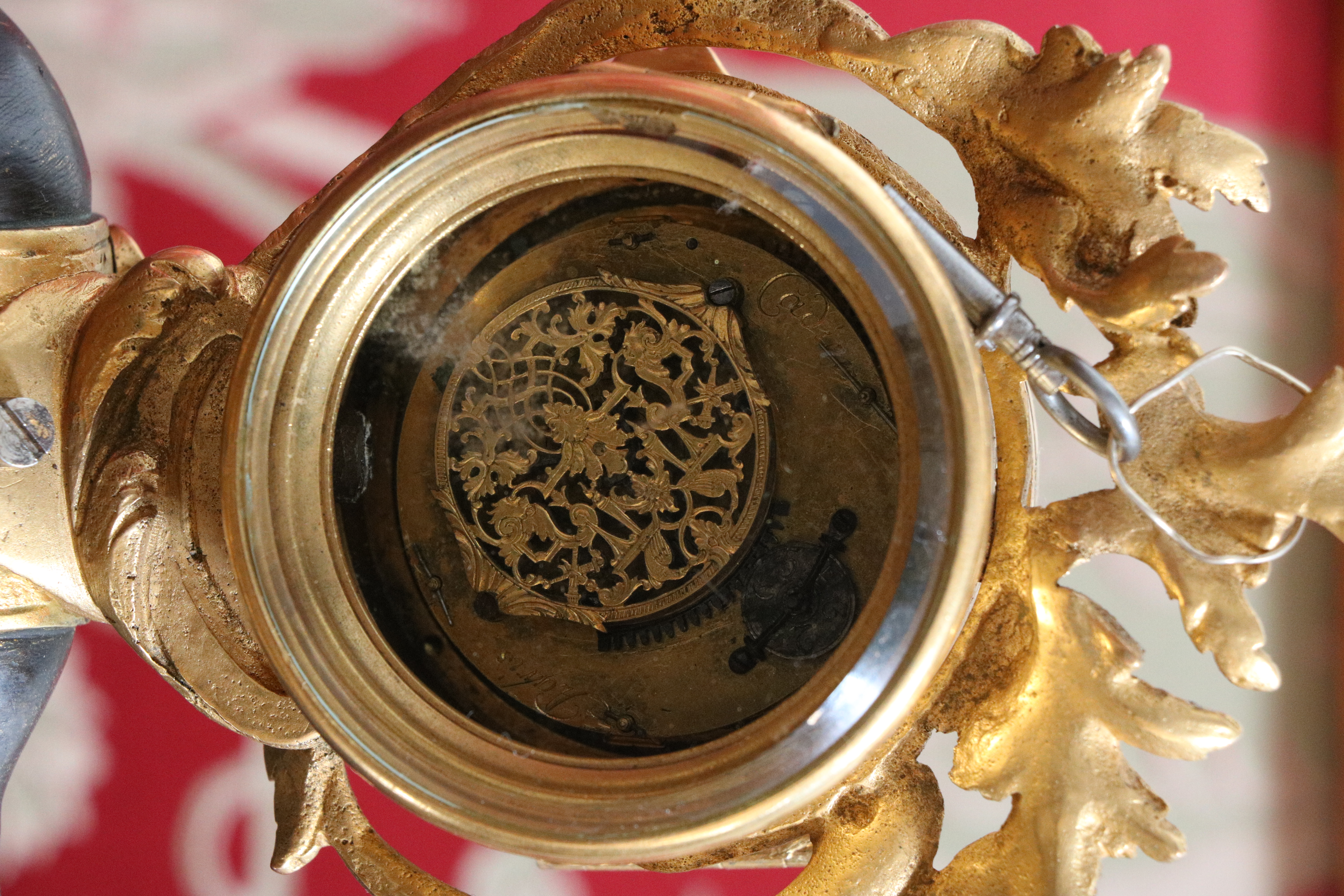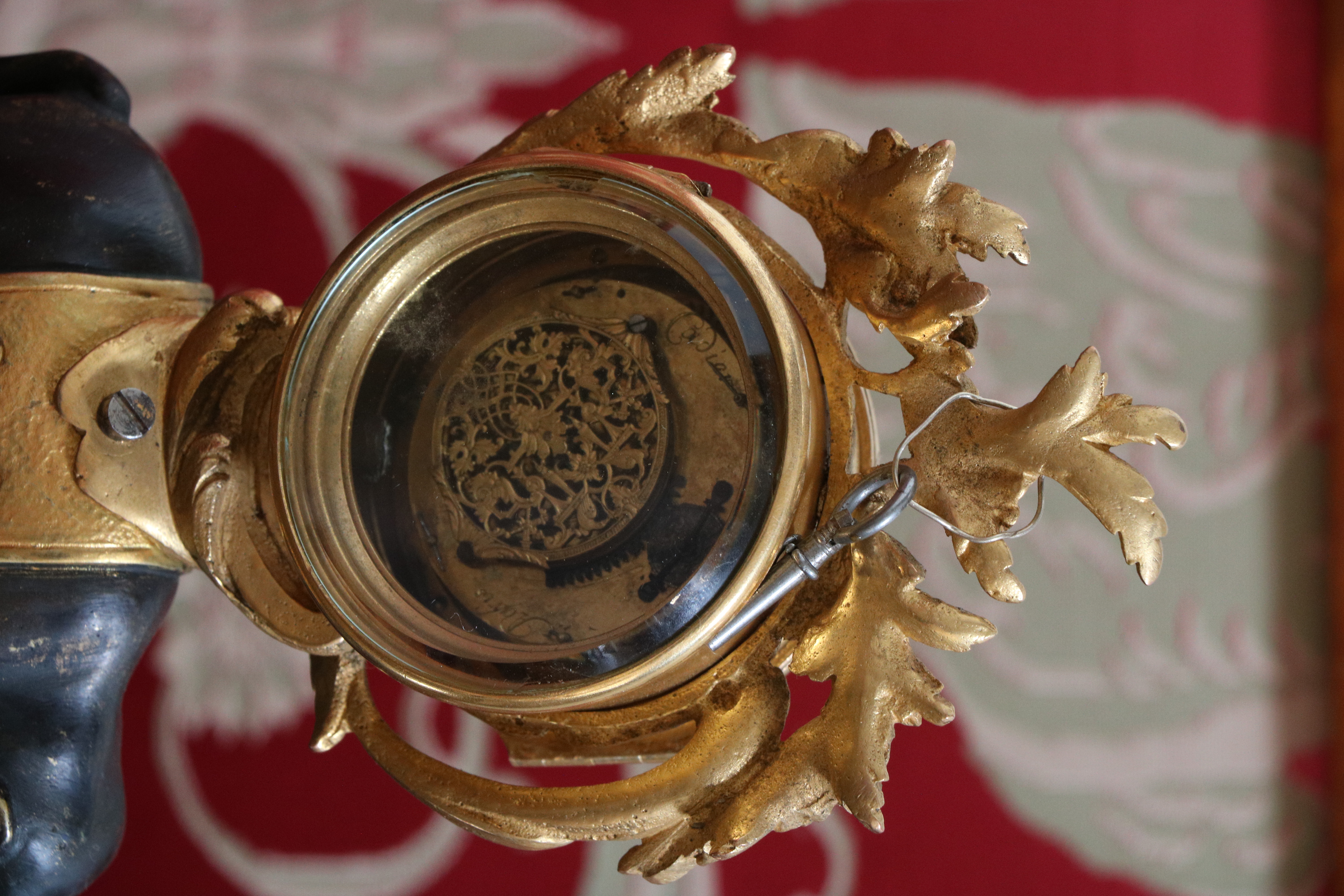 Pendule à l’éléphant en bronze doré et patiné. Le mouvement est cerné d’un décor feuillage qui se libère vers le haut et se rattache au dos de l’éléphant par un lambrequin. L’éléphant est flanqué d’un escargot et d’un chien, fixés à sur une rocaille. L’anatomie de l’éléphant pourra paraître surprenante, par ses oreilles, et notamment ses pieds : les sources visuelles du XVIIIème manquant pour présenter un tel animal. Signé Cadier à Paris Epoque Louis XV Mouvement d’époque Louis XIV H 22,5 x L. 21 x P. 12 cm