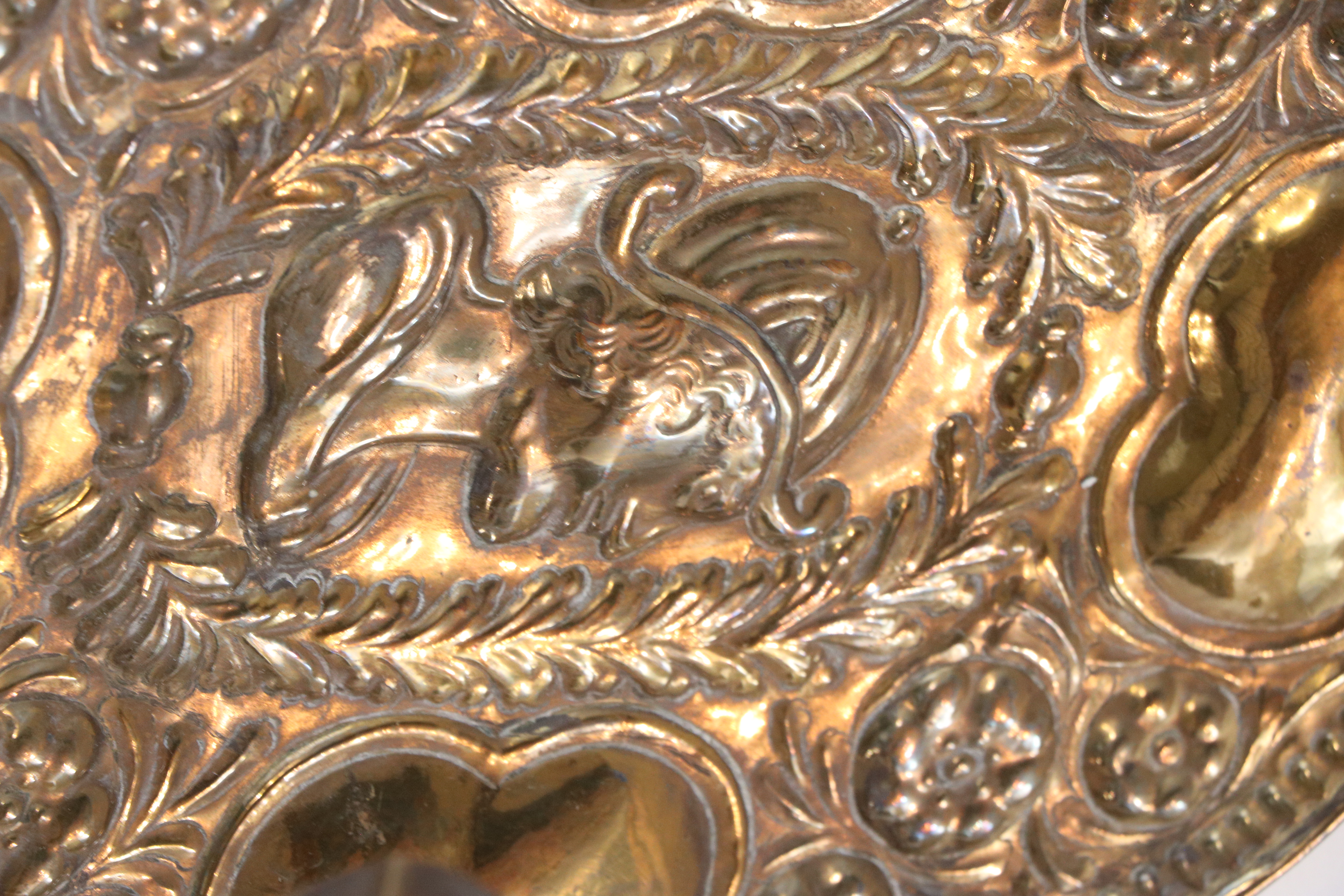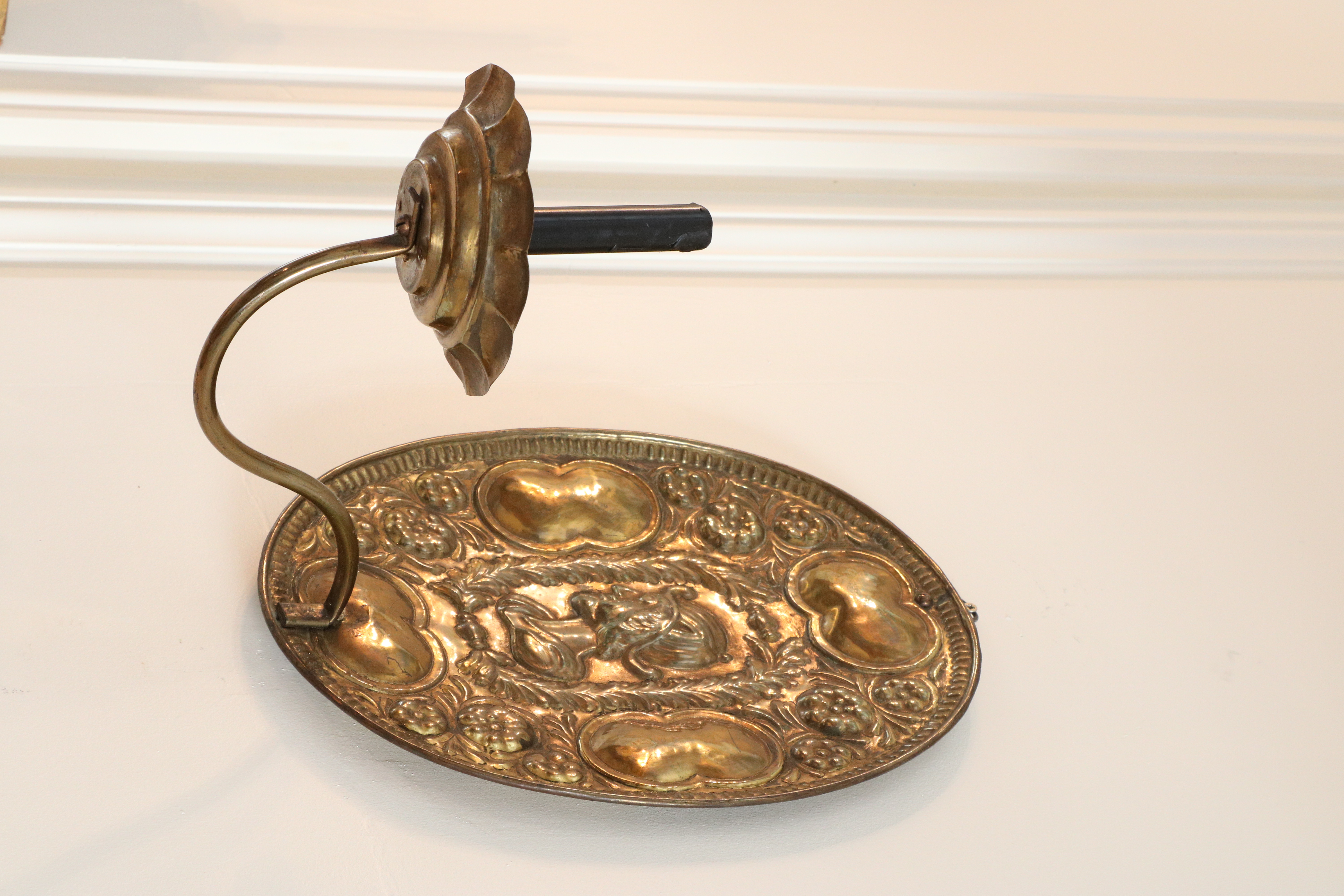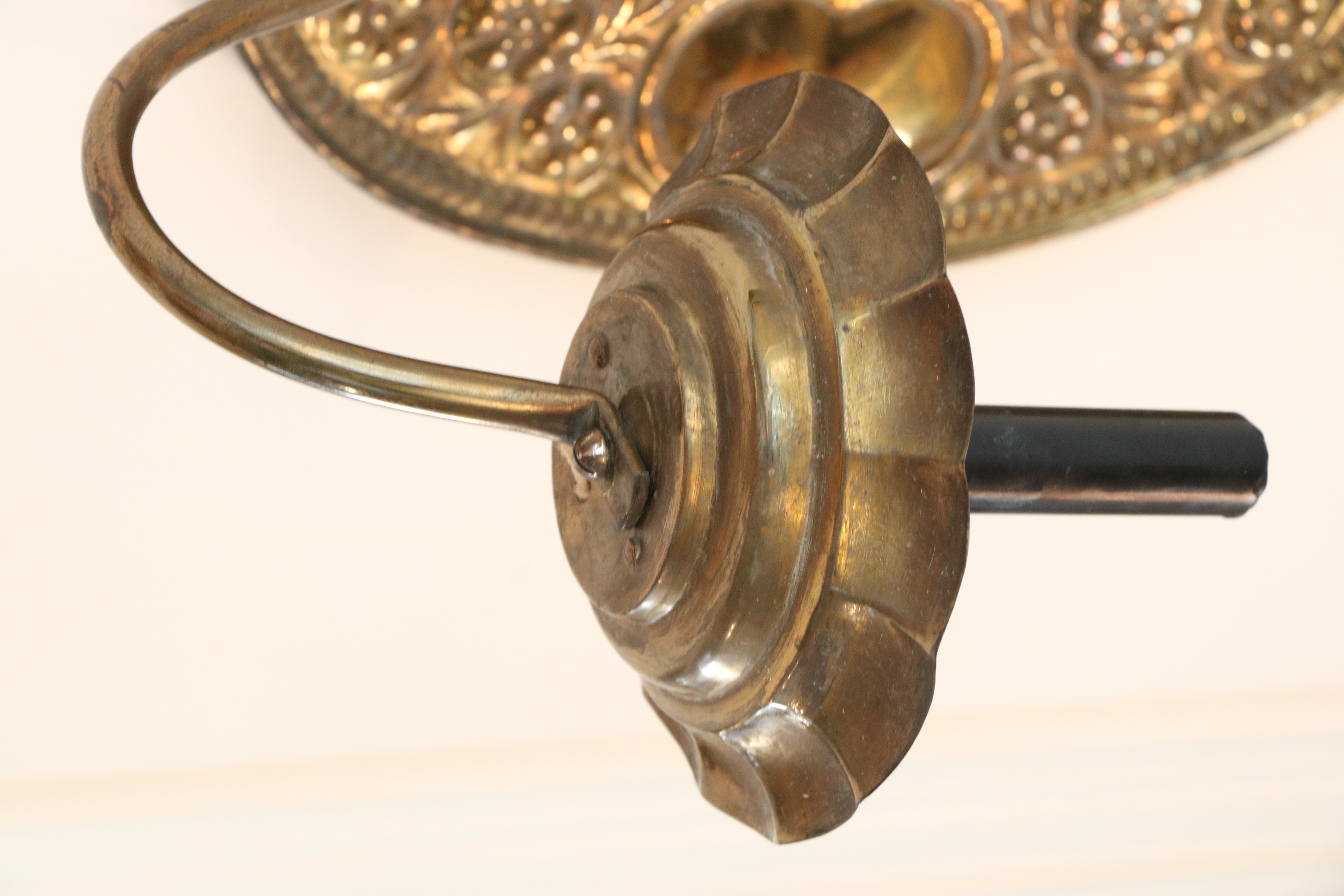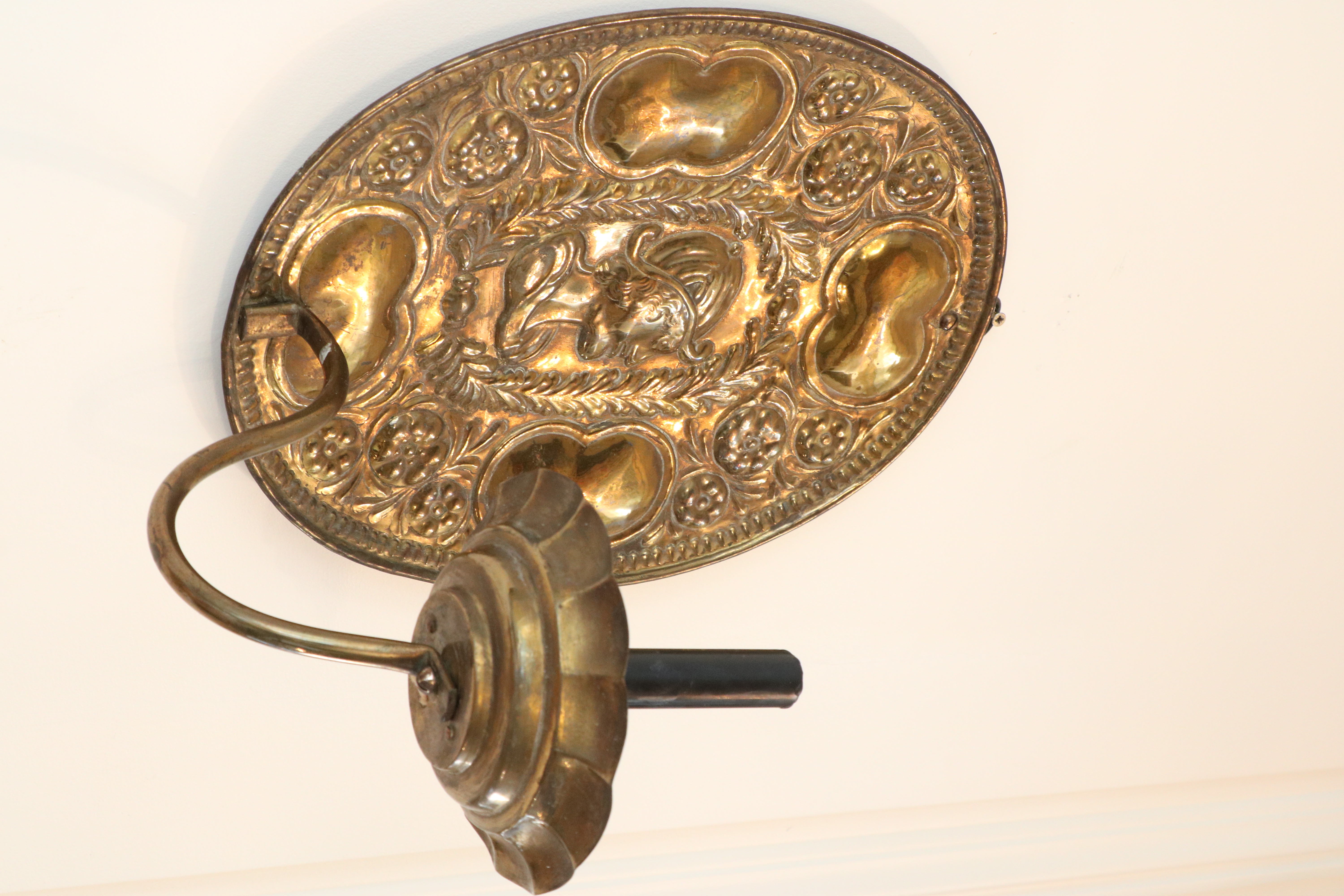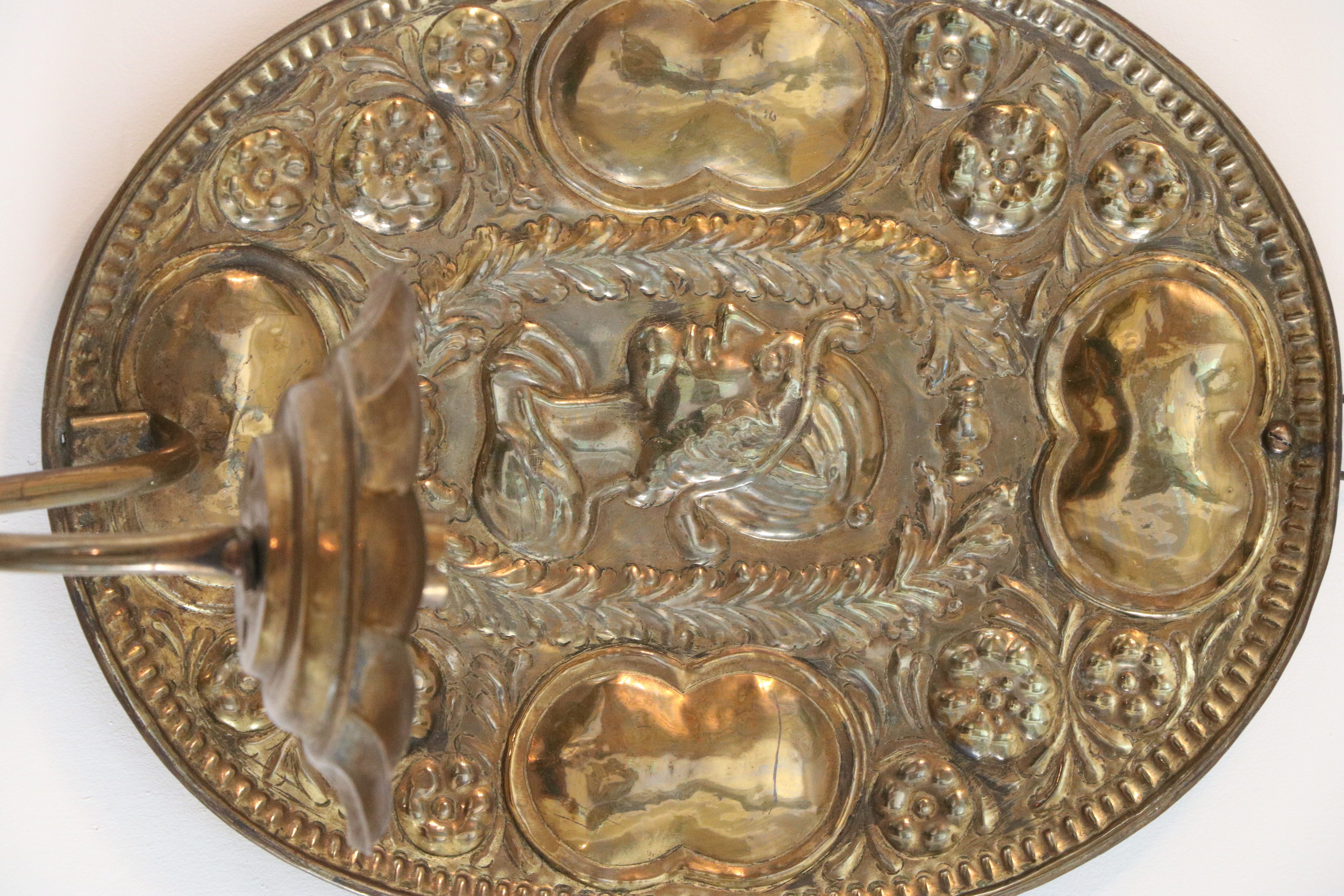 Paire de réflecteurs en laiton repoussé à un bras de lumière présentant des profils de soldats casqués. XVIIIème siècle Etat d’usage H.38 x L. 30 x P. 32 cm