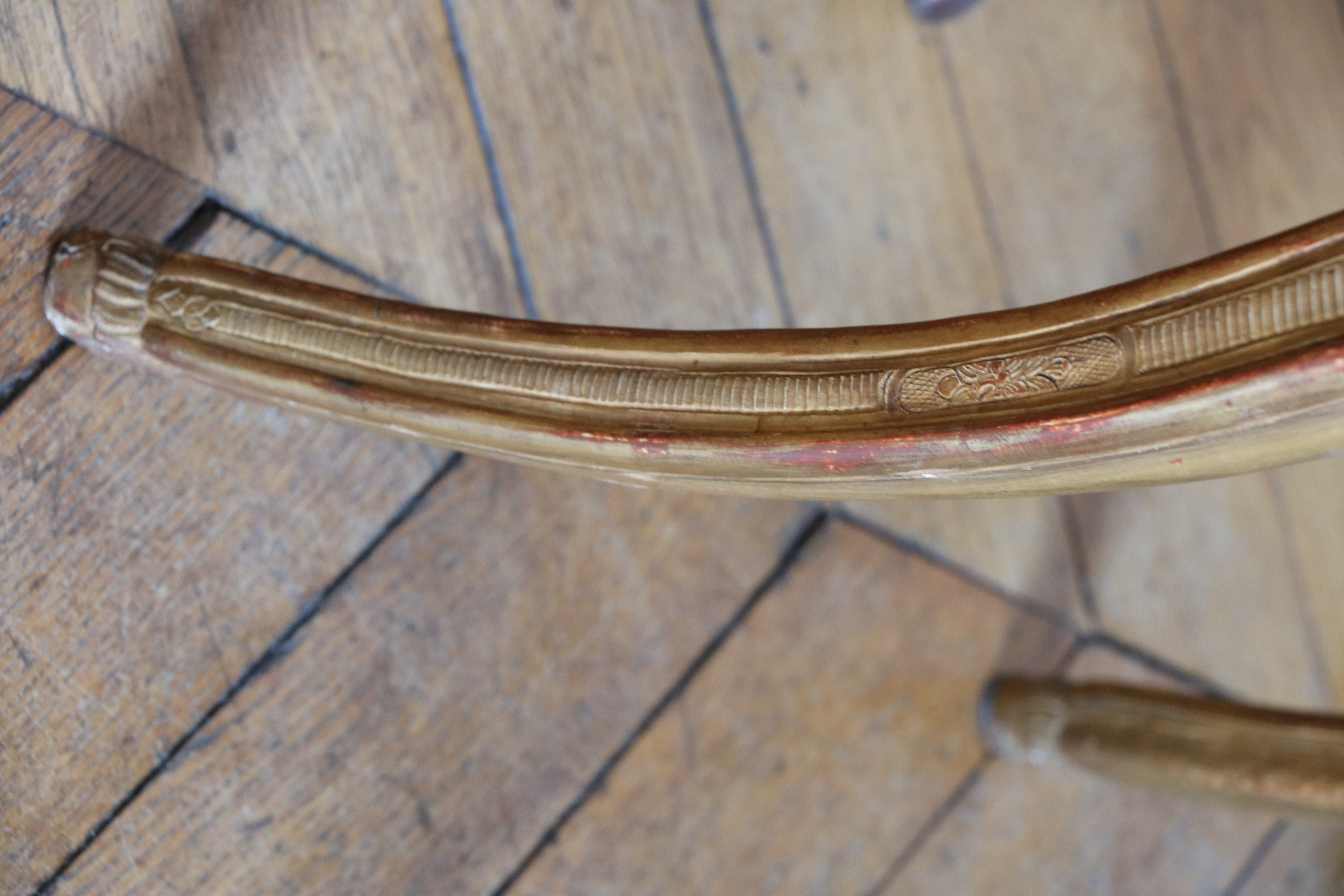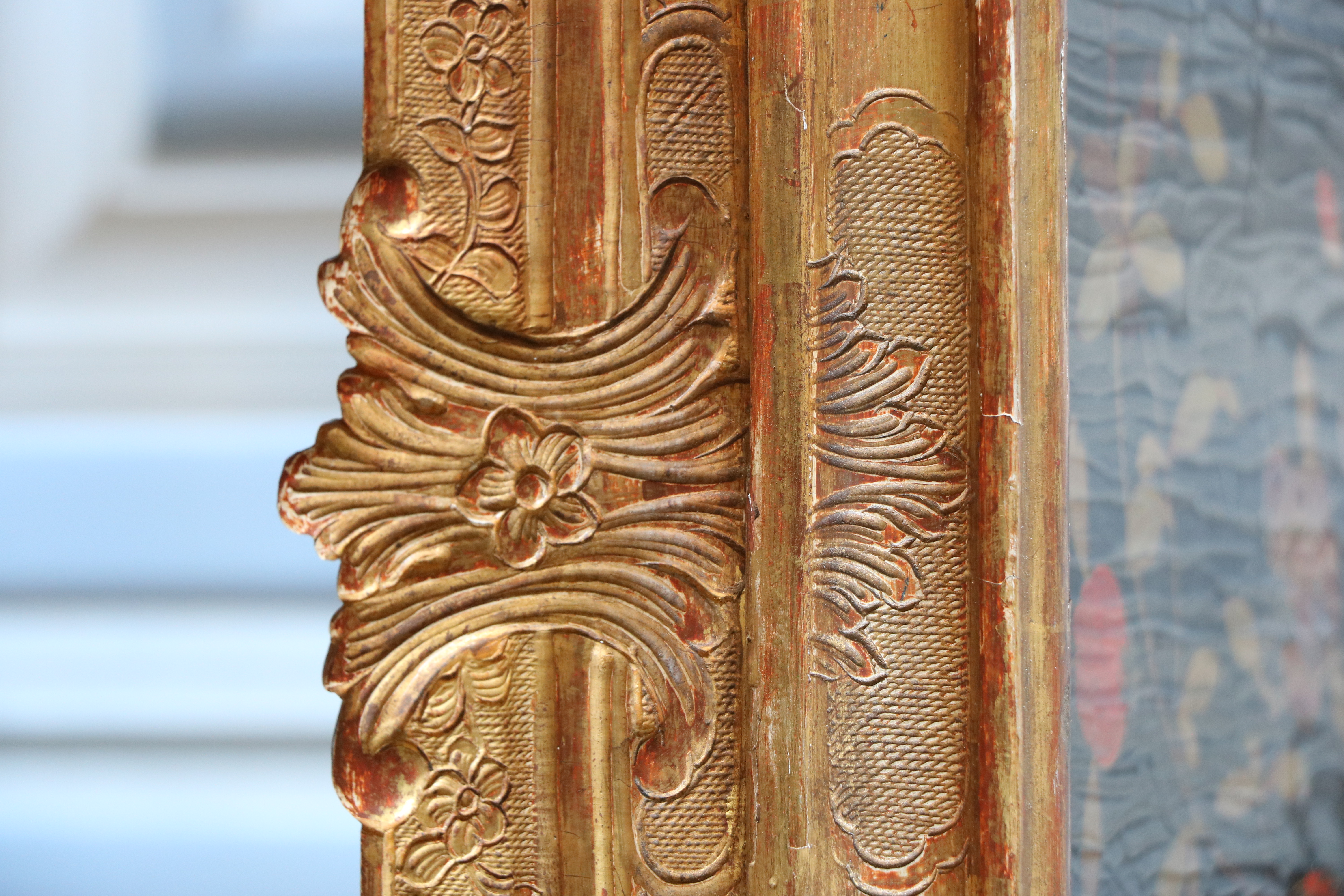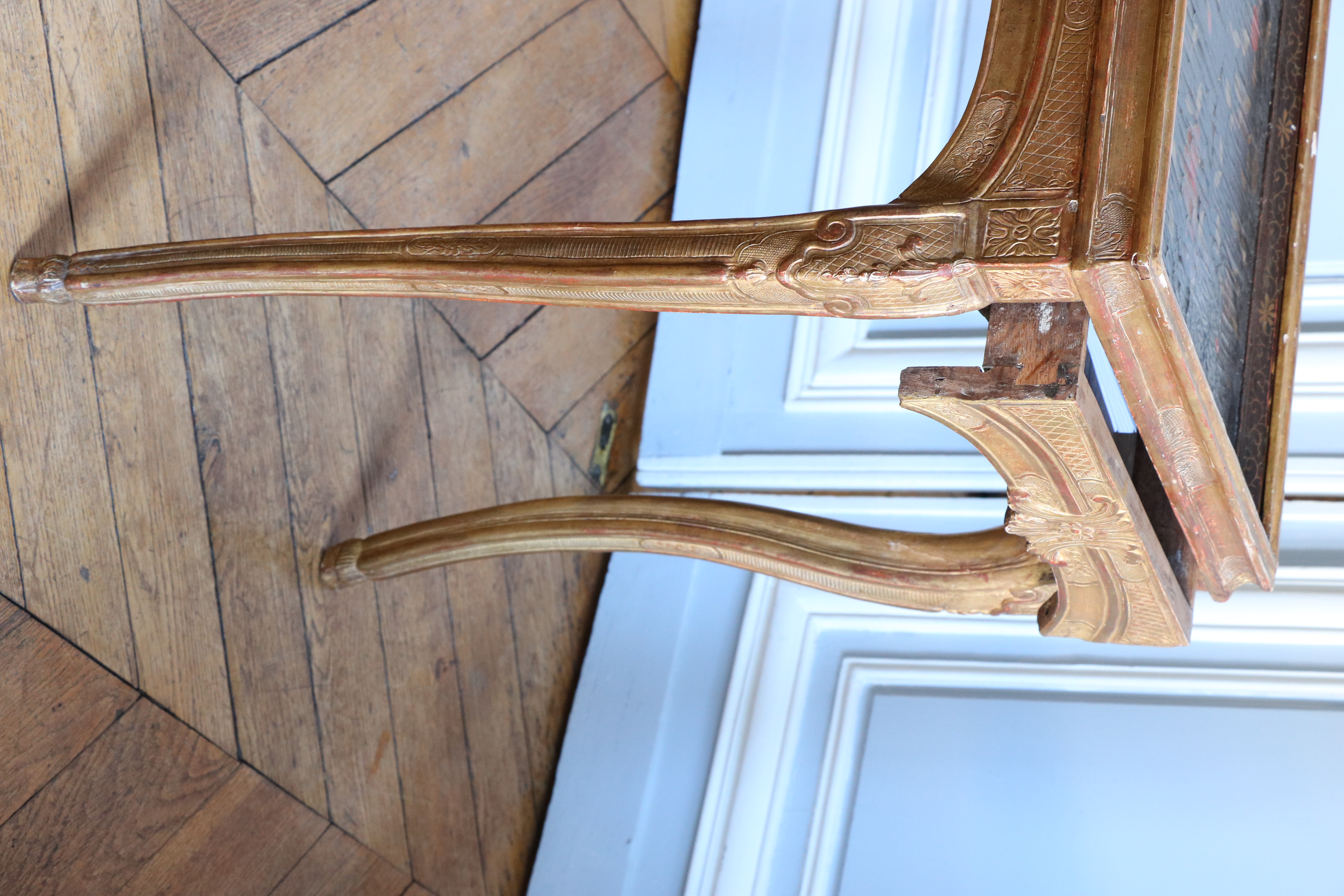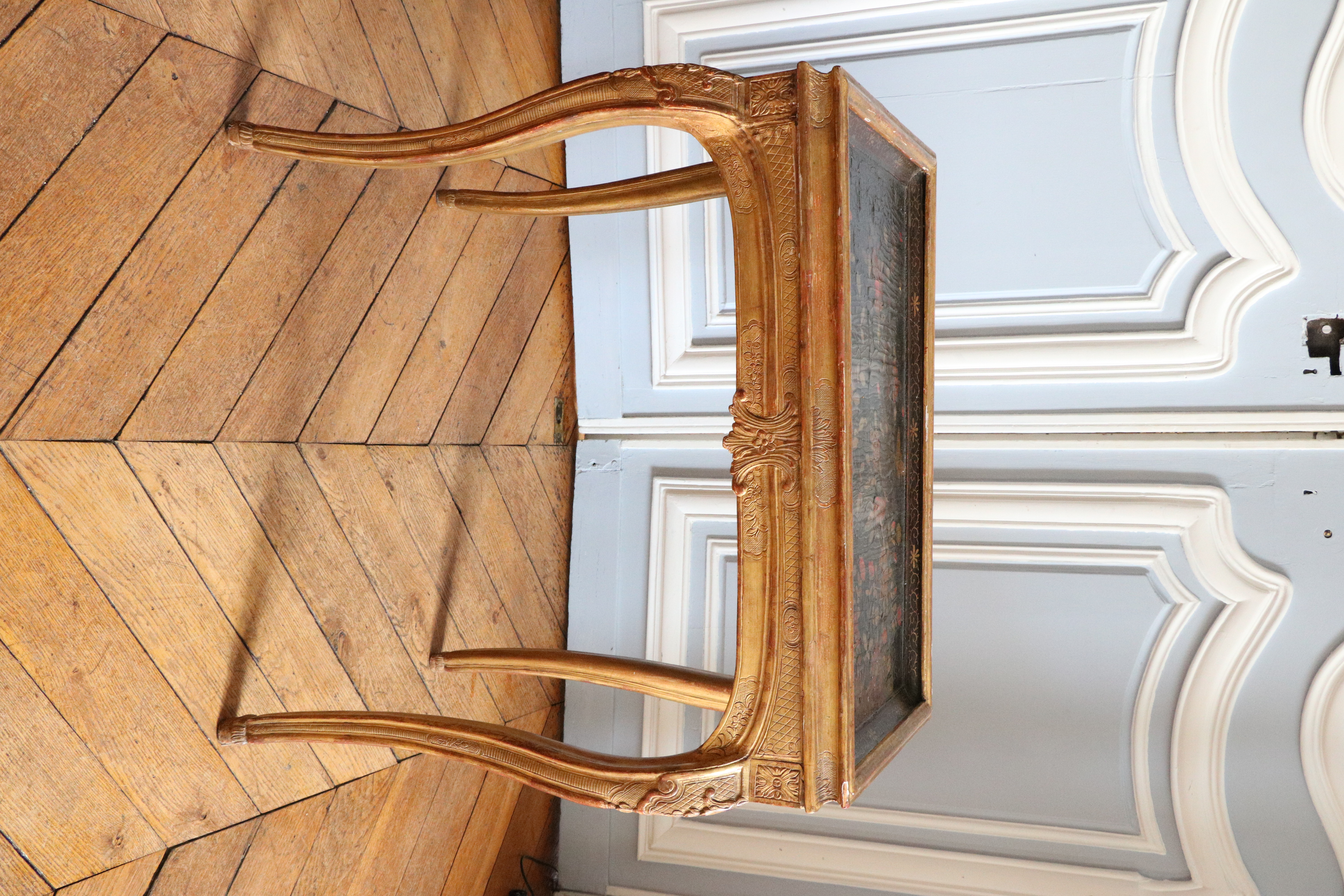 Table-console à plateau de laque en cabaret, de forme rectangulaire en bois sculpté et doré ouvrant par un tiroir latéral. Le dessus présente un panneau en laque de chine d'époque Kangxi à fond brun rehaussé d'or, à décor de tiges fleuries et feuillagées animées d'oiseaux et de papillons. Il repose sur un piétement caractéristique du début de la période Louis XV : sculpture symétrique à motifs de coquilles, feuillages et grenades éclatées, pieds en console terminés par des sabots caprins. Paris. Époque début Louis XV. Circa 1730. Craquelures et accidents à la laque. Léger manque à la dorure. H.67 x L.67 x P.44 cm Présente dans les intérieurs à la mode du XVIIIème siècle, la table en cabaret apparaît à la fin du XVIIème siècle. Son introduction dans le mobilier français est due à l'engouement qui s'est manifesté tout au long du Grand Siècle pour les objets venus d'Extrême-Orient. Le cabaret désigna tout d'abord un plateau sur lequel étaient dressés tasses, pots, sucrier, théière, cafetière ou chocolatière selon la collation désirée. Les premiers cabarets, importés de Chine ou du Japon, étaient en laque et commercialisés par les marchands merciers qui les adaptèrent à des piètements fabriqués en France. Ils ne tardèrent pas à en faire réaliser avec des formes les plus diverses, faisant de ce meuble l'un des plus élégants du XVIIIème siècle. Cet exemplaire en laque appartient à la première génération de table en cabaret composée d'un piètement ouvrant à un tiroir latéral, en bois de chêne sculpté et doré avec des pieds cambrés à sabot de biche.