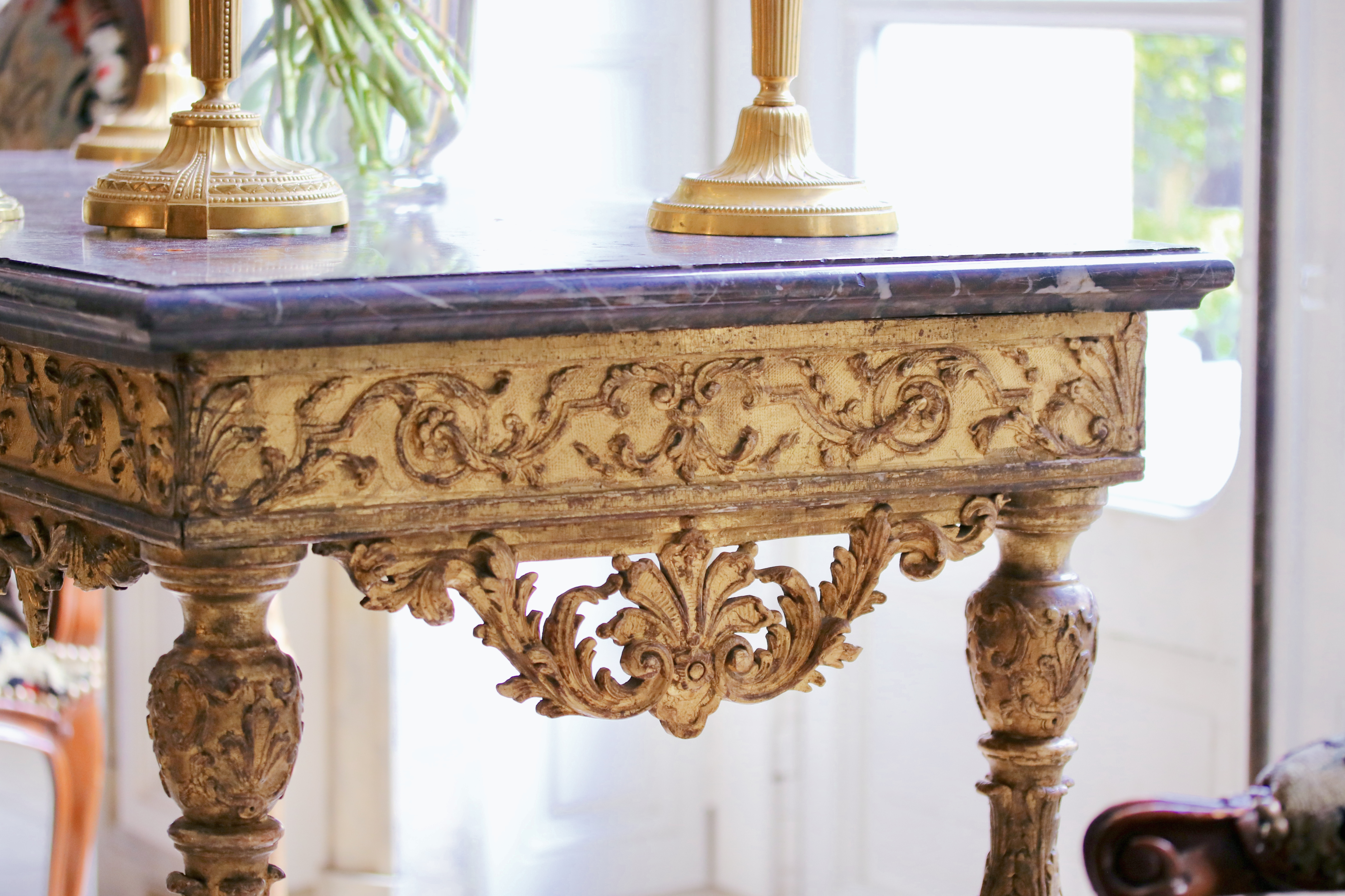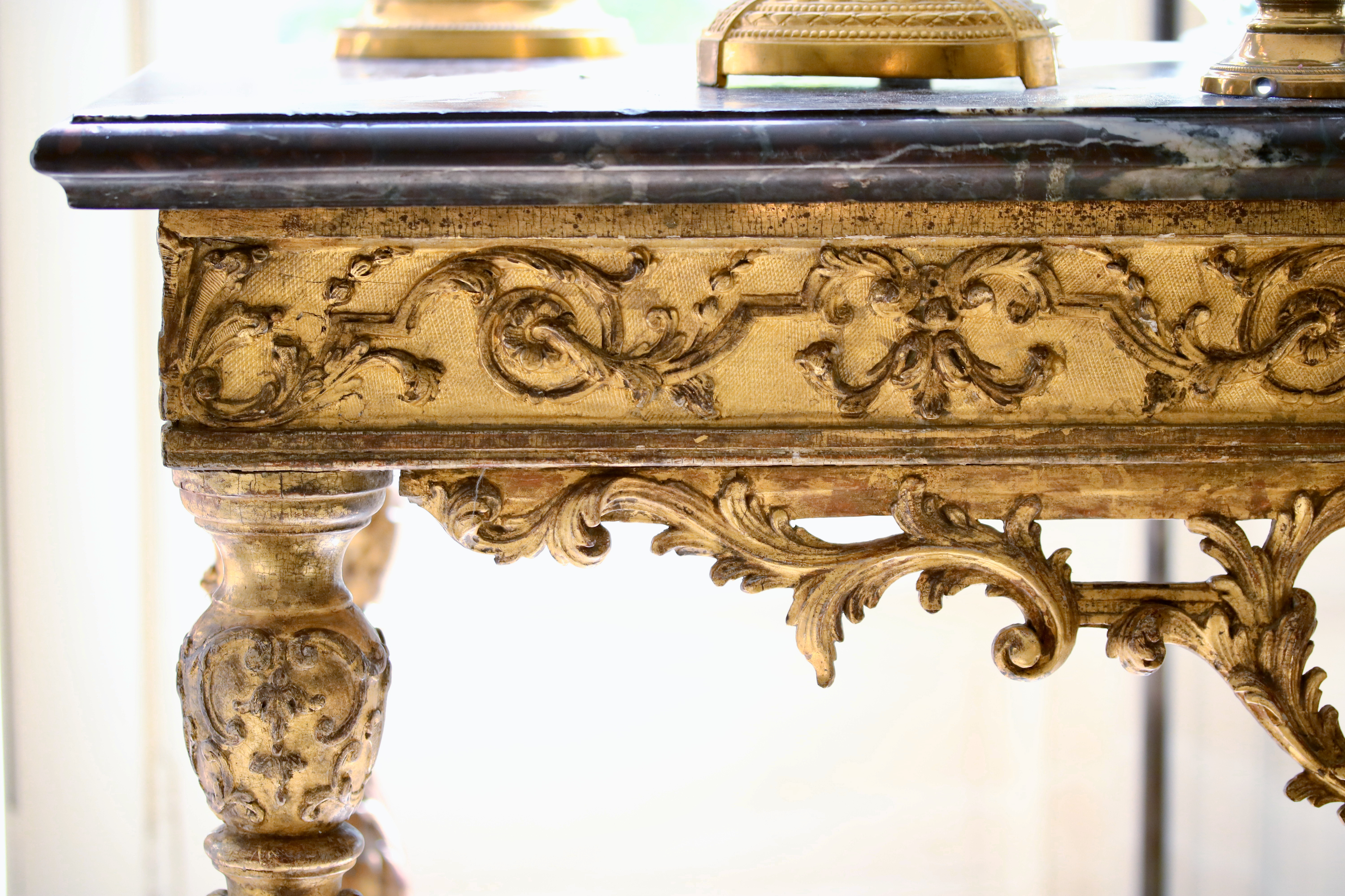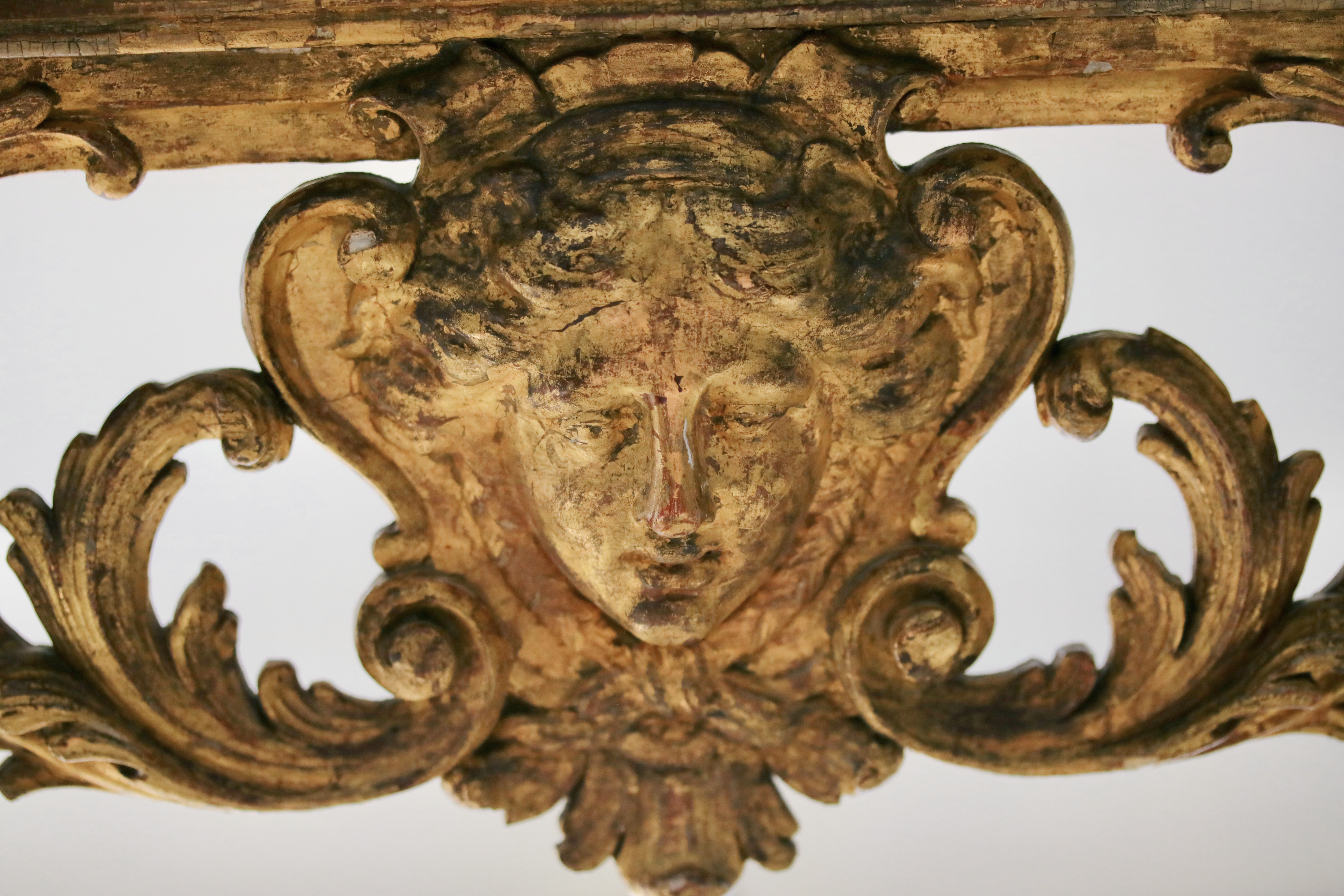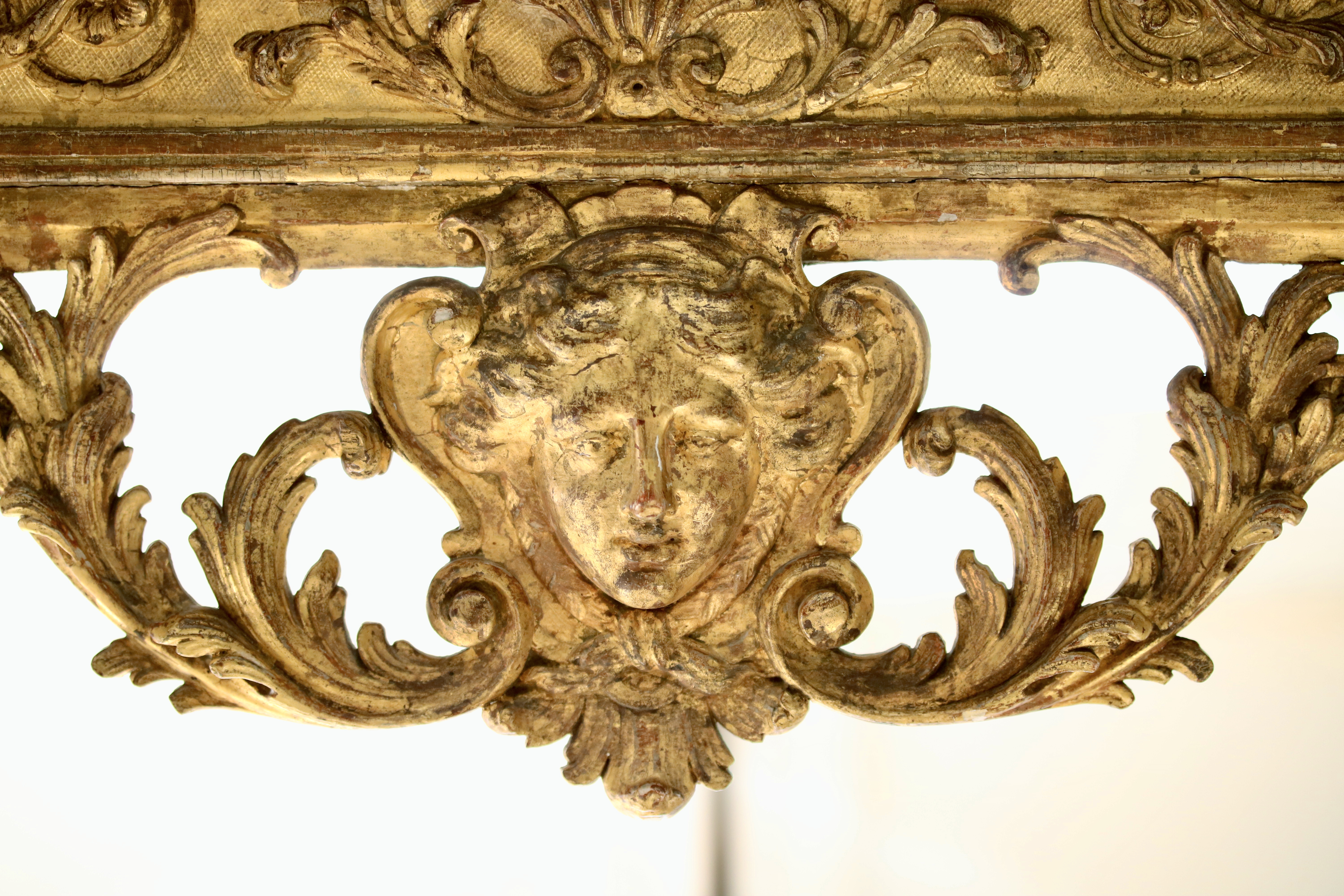 Rare et fine console en bois doré reposant sur quatre pieds réunis par une entretoise en X moulurée et sculptée de feuillages où au centre est placé un bouquet de feuilles. Le piétement est richement sculpté et est composé de colonnes feuillagées soutenant la ceinture. La ceinture est ornée de motifs à la Bérain et présente un tablier en façade et pour chacun des côtés. Le tablier central est orné d’un masque de femme aux tresses nouées. La console est surmontée par un dessus de marbre Campan mouluré. Epoque Louis XIV Restaurations d’usage H. 78 x L. 112 x P. 60 cm