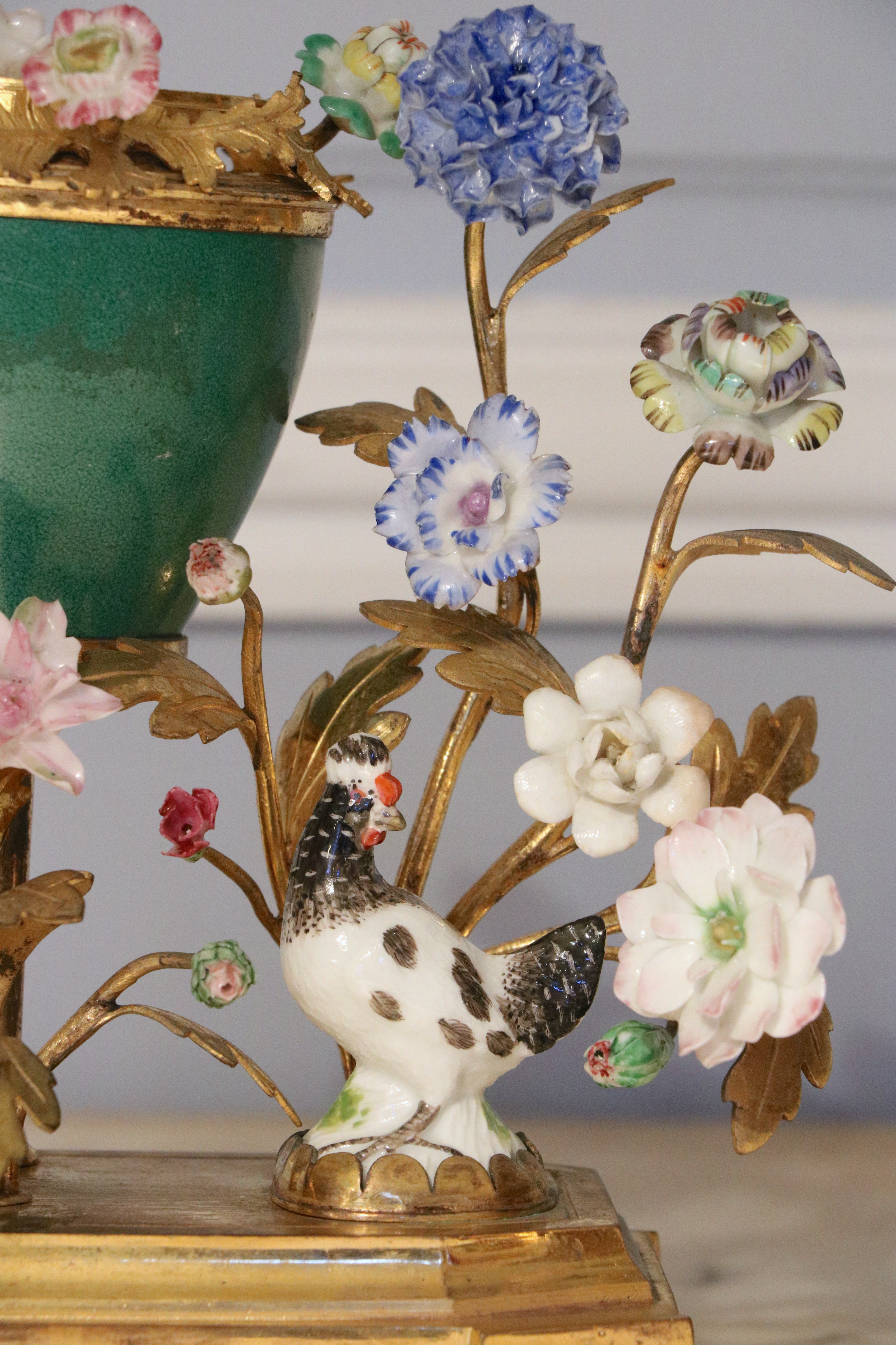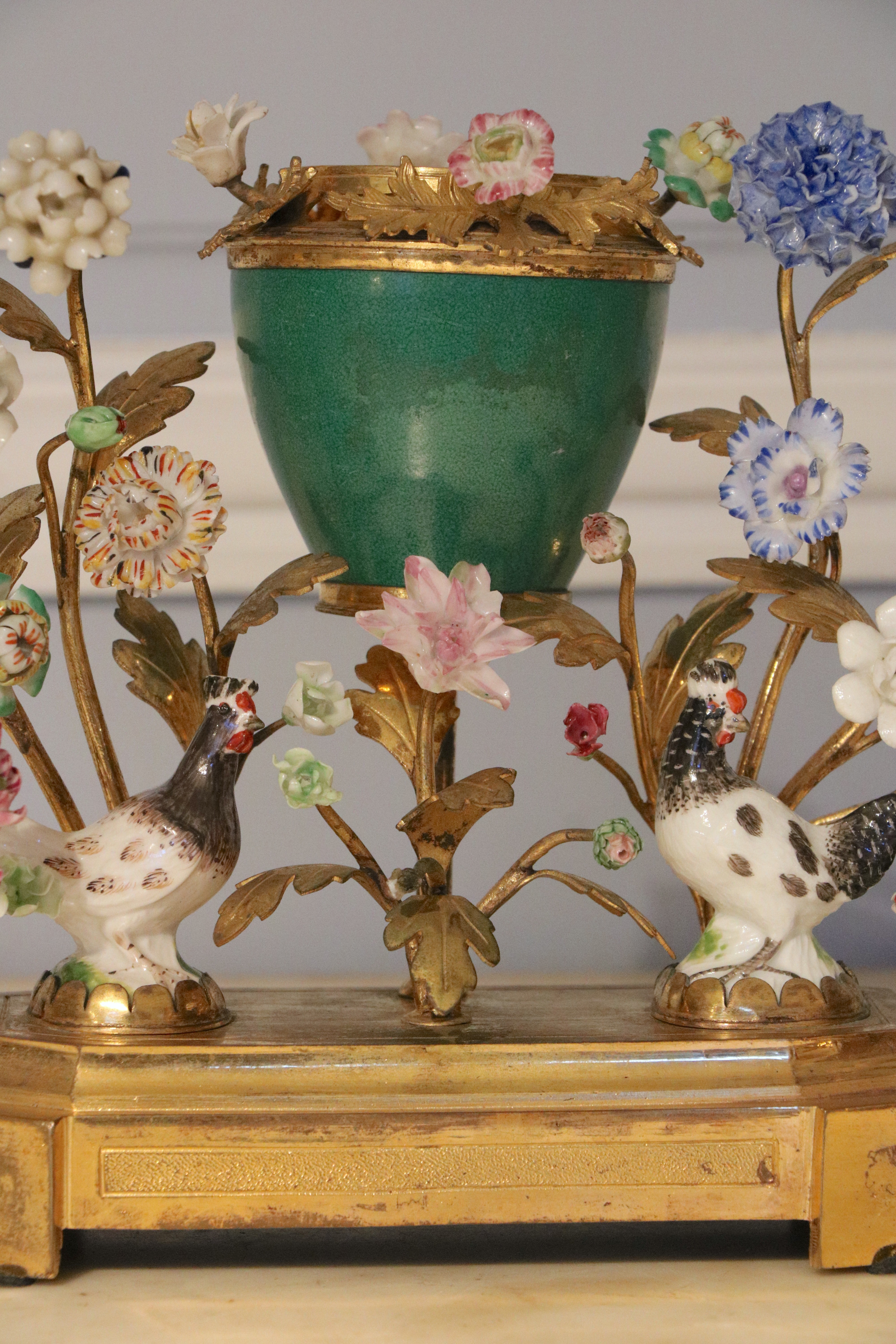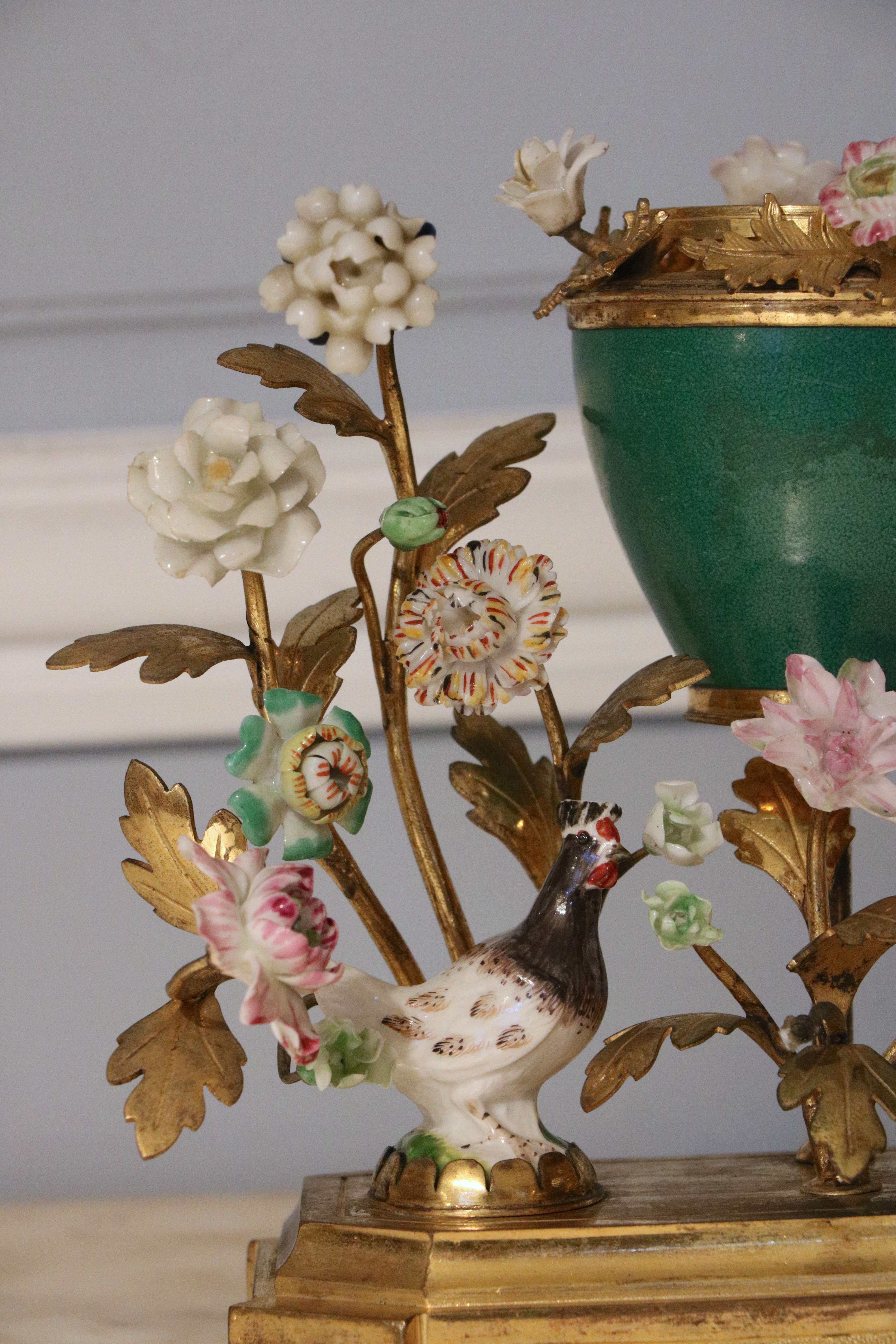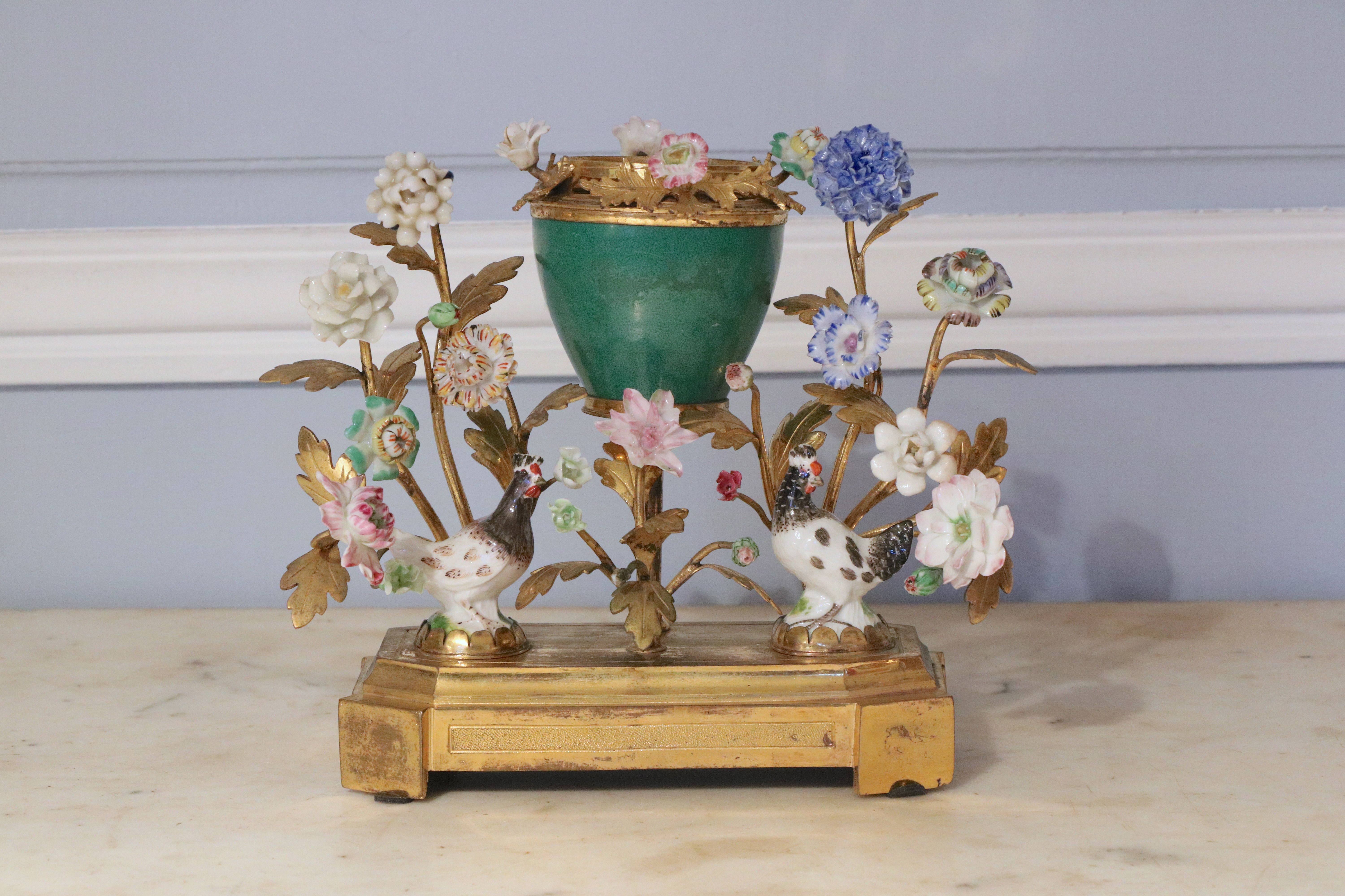 Pot pourri en bronze doré et ciselé, porcelaine de Chine craquelée, les fleurs en porcelaine émaillée polychrome. Epoque Louis XVI Attribué à la Manufacture de Meissen, travail de la fin du XVIIIème siècle Etat d'usage : couvercle manquant, petits manques à la tête d'un coq et sur certaines pétales. H. 16,5 x L.16 x P. 7 cm