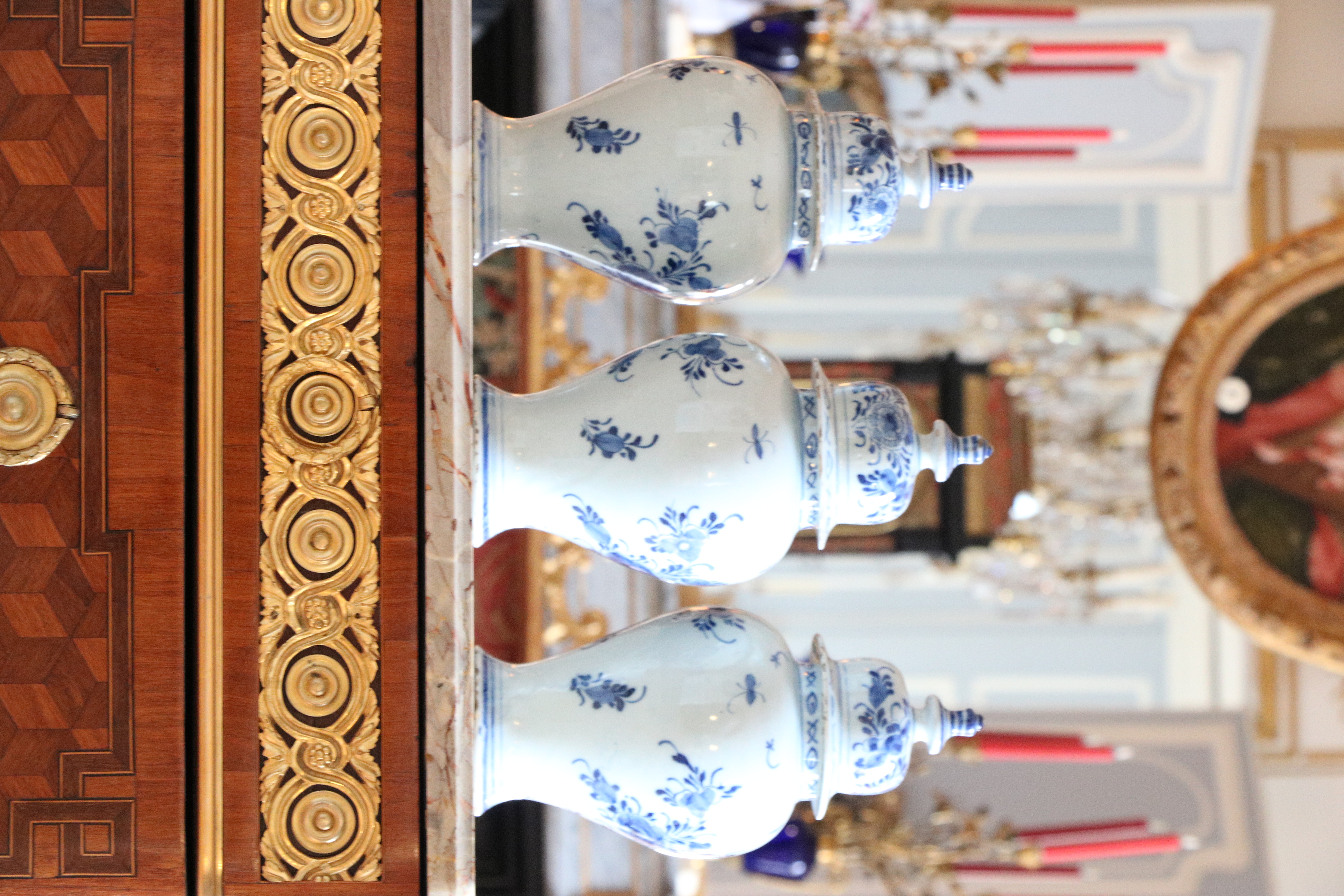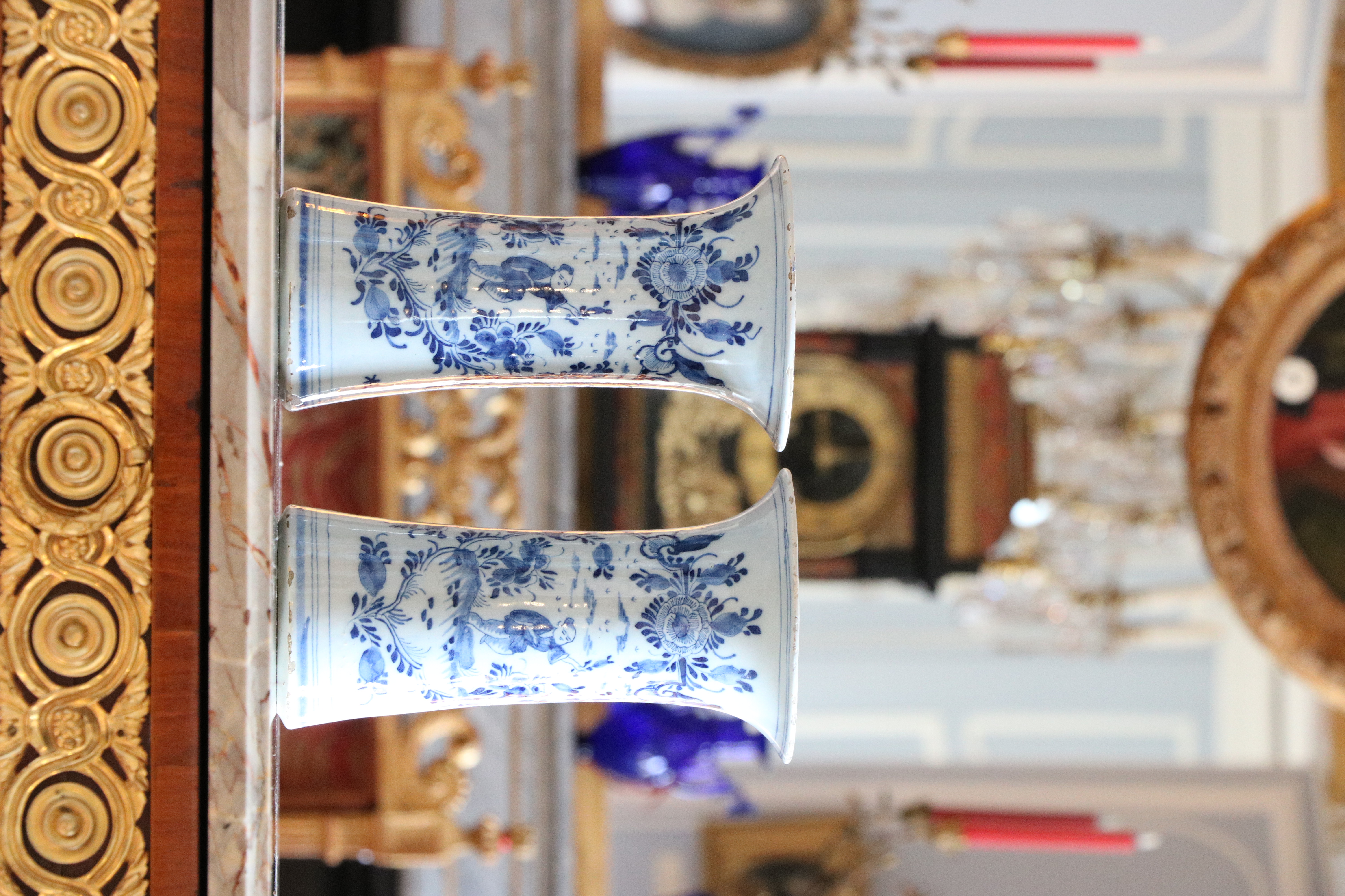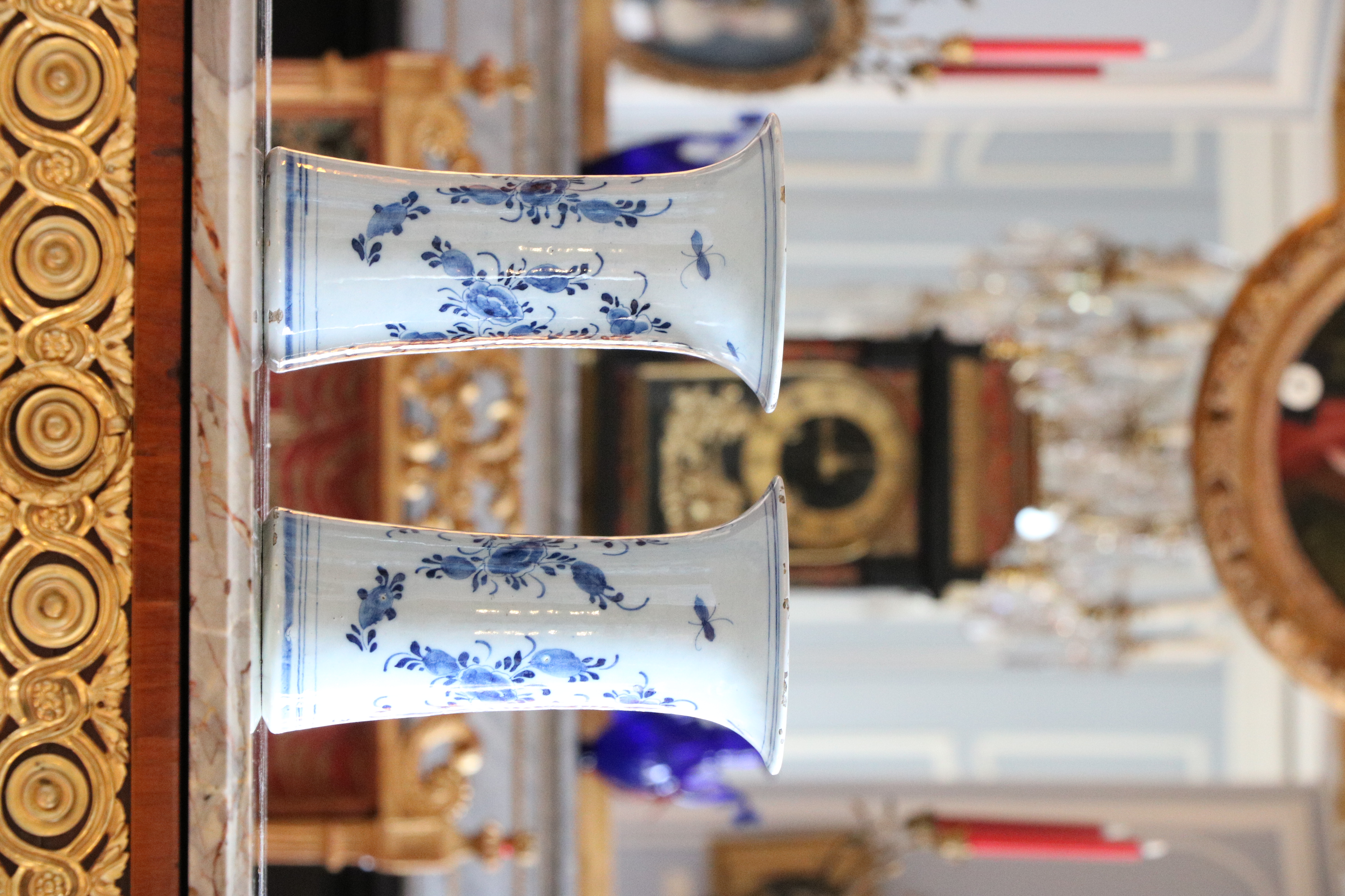 Trois potiches et deux vases rouleaux en faïence à décor bleu et blanc de fleurs et de paysage chinoisant. Les scènes représentent un jeune homme chinois, une branche à la main, dans une riche et très large cartouche soigneusement fleurie. XVIIIème Etat d'usage Haut. : 29,5 cm et 22,5 cm