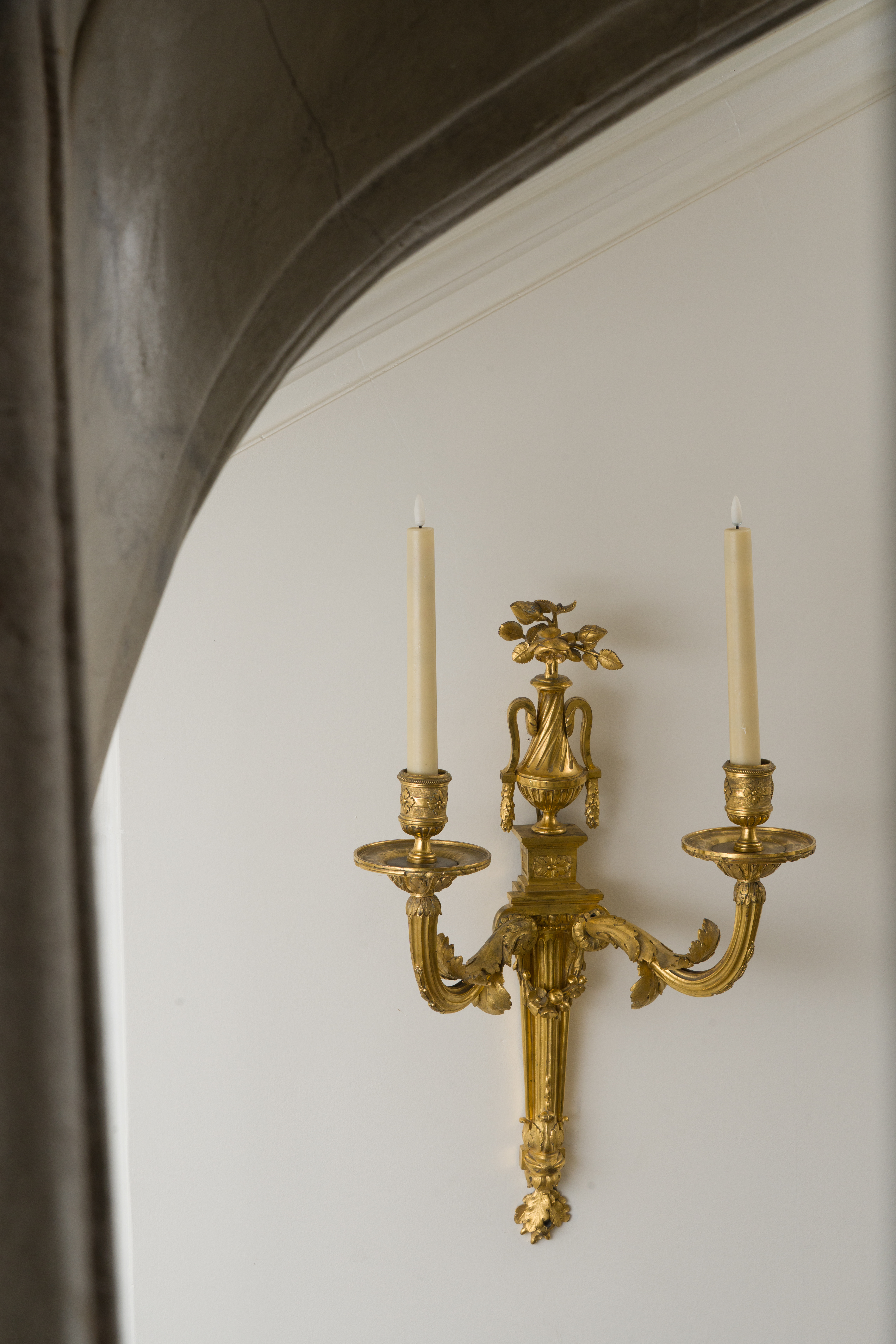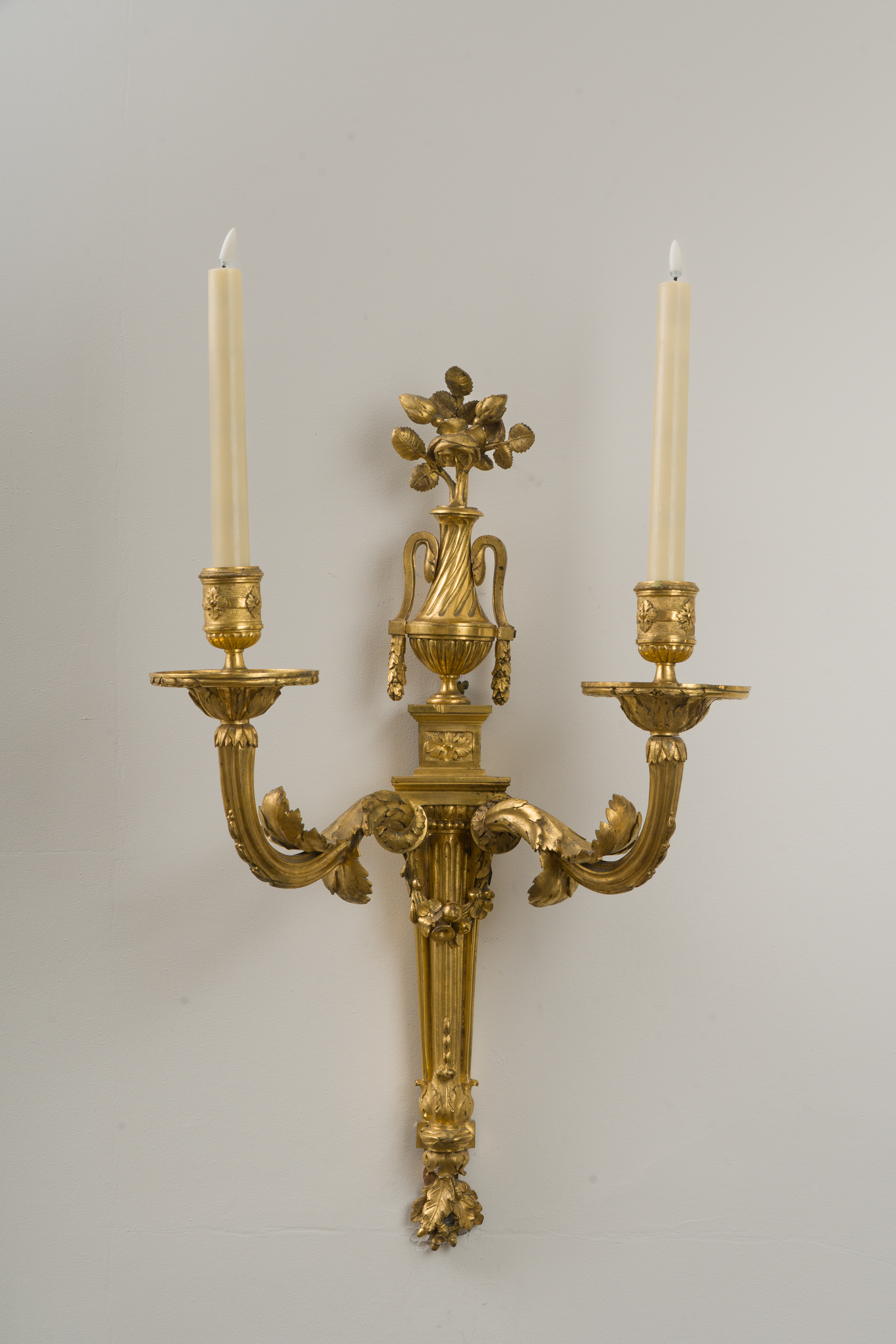 Paire de bras de lumière en bronze ciselé et doré de l'époque de Louis XVI, à deux branches feuillagées retenant une guirlande de fruits et fleurs, et issues d'un fût cannelé surmonté d'un vase fleuri à cannelures torses, l'amortissement orné de feuilles de chêne. Le binet comme la bobèche sont soigneusement décorés de fleurs, de cables, de godrons et d’une frise de fleurs. Les deux bras de lumière cannelés sont gainés de feuilles d’acanthe qui s’ouvrent harmonieusement sur la retombée du bras et sont resserrées par une bague sous la bobèche. Une petite guirlande de lauriers apparait sur le dessous du bras et sur le pourtour de la bobèche. Epoque Louis XVI Etat d’usage Hauteur : 55 cm Largeur : 36 cm Profondeur : 20 cm.