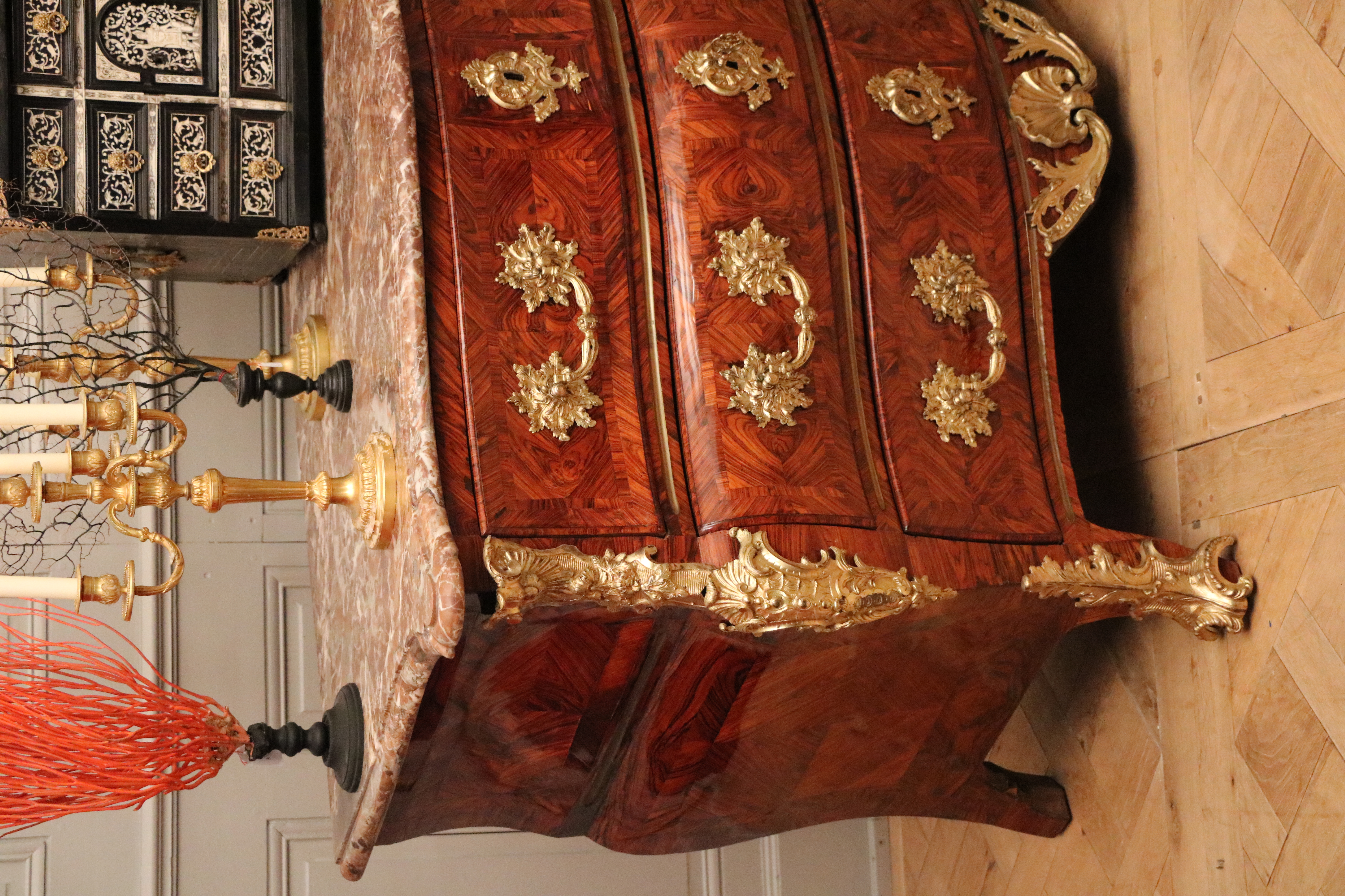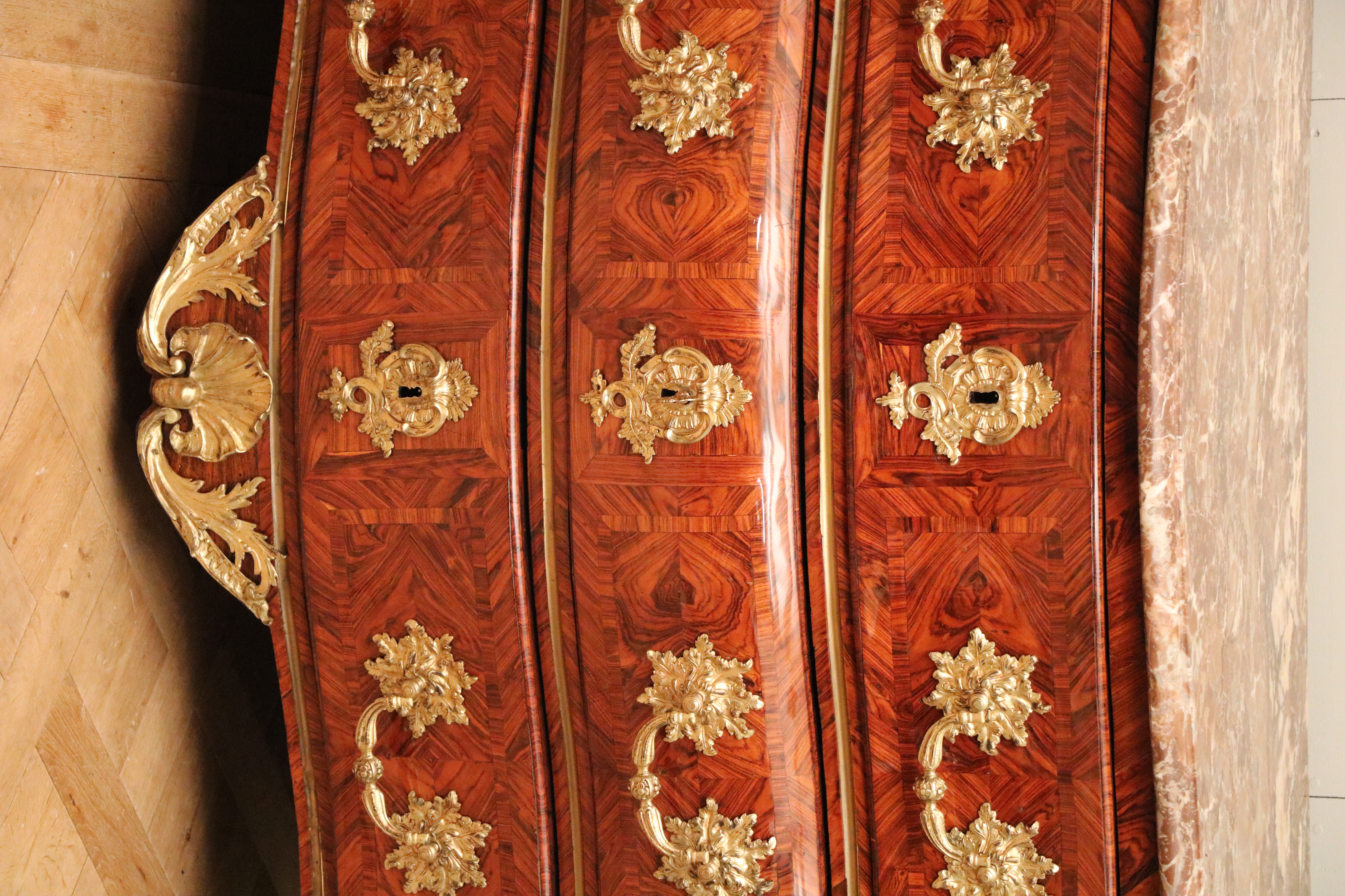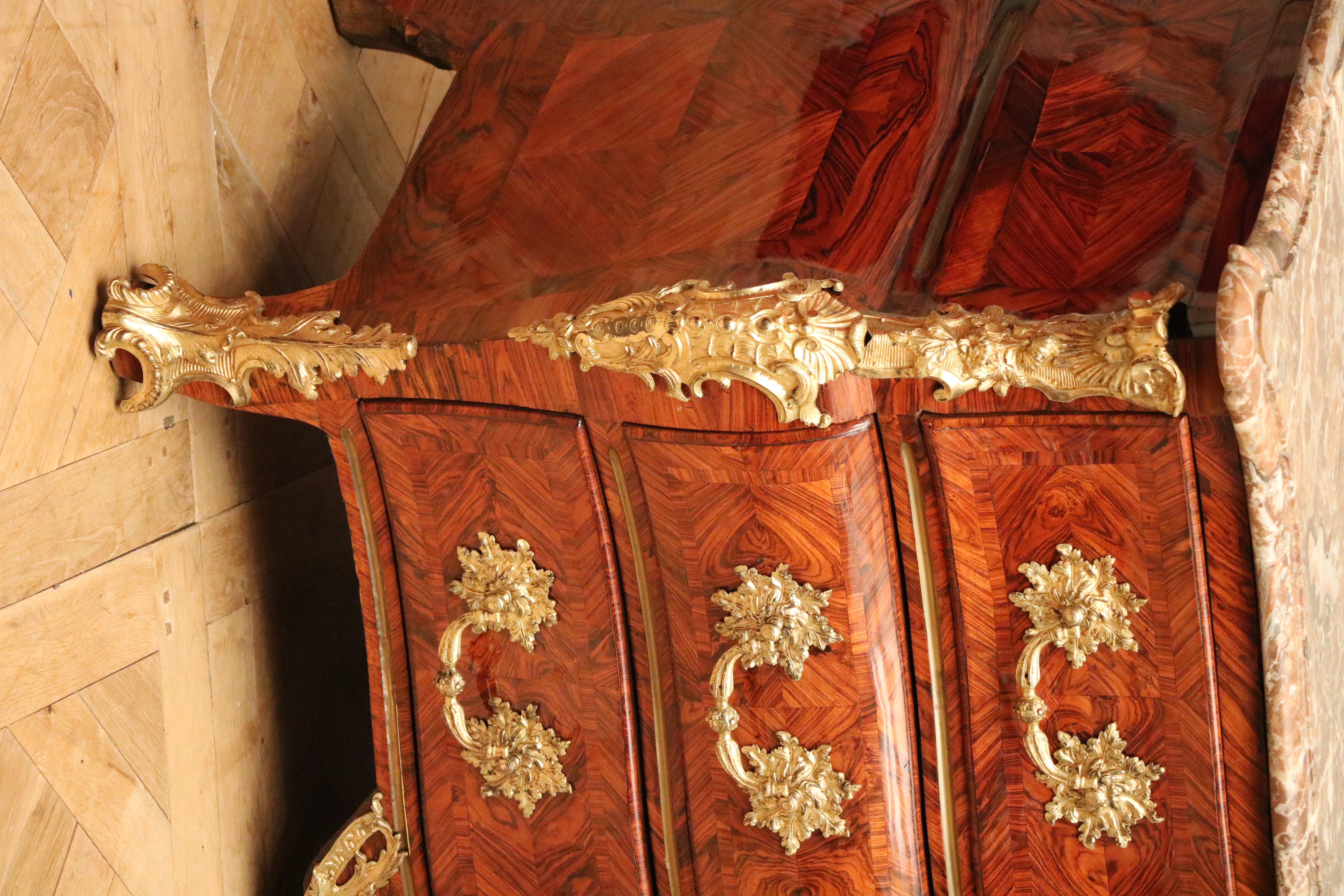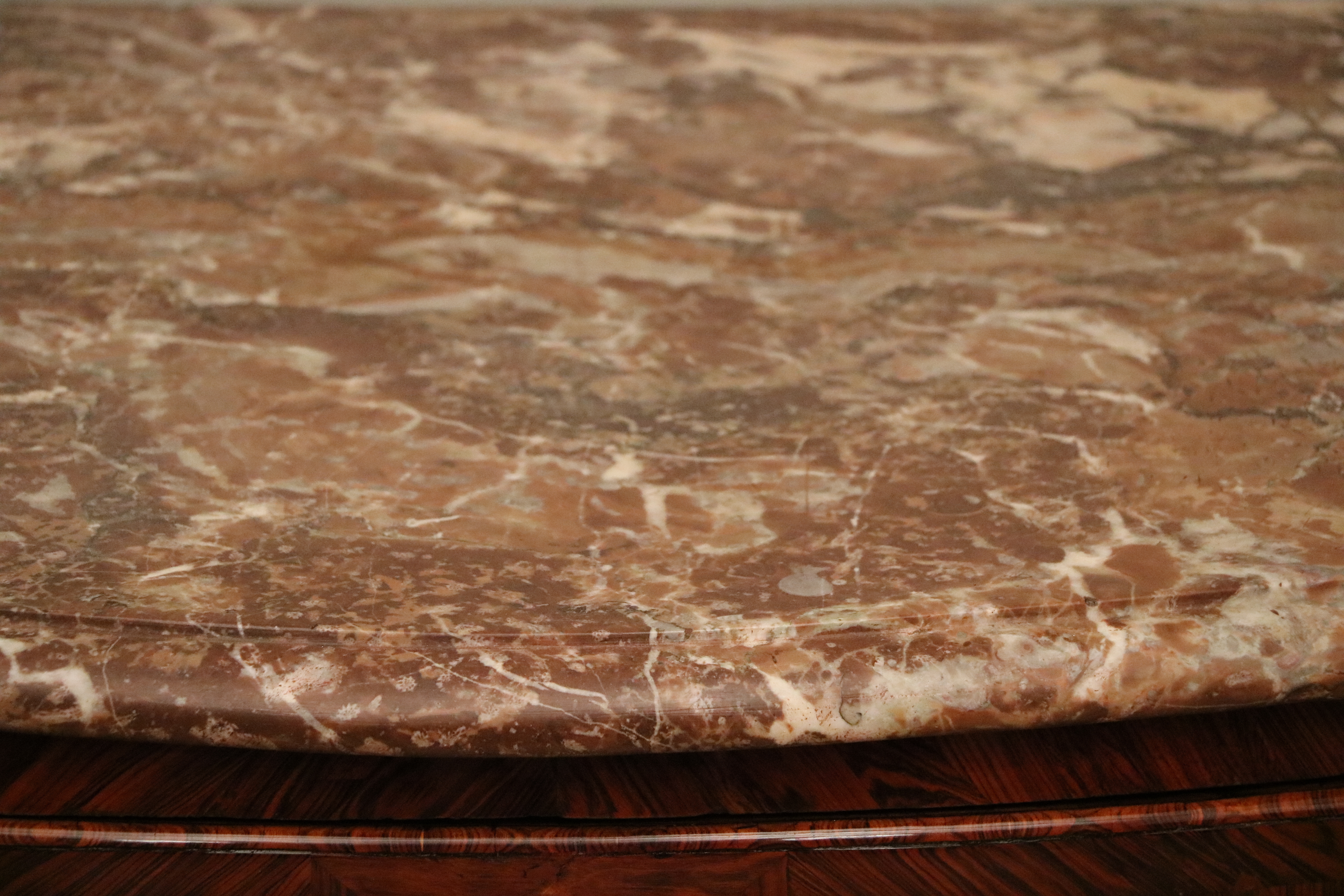Commode tombeau d'époque Louis XV en placage de bois de violette ouvrant en façade par trois tiroirs sur trois rangs séparés de traverses apparentes agrémentées d'un filet de laiton. Cette commode présente un très beau galbe dans les deux plans en façade, les cotés eux mêmes galbés dans les deux plans, un filet de laiton séparant le panneau haut du panneau bas. La marqueterie présente un décor de réserves et de filets encadrant un frisage en bois de violette posé en « ailes de papillon », les cotés présentant le même décor. Les traverses des tiroirs incrustées d'un filet de laiton. Cette commode présente une très belle ornementation de bronzes vernis or et ciselés, poignées tombantes, tablier, chutes, sabots, entrées de serrures. Dessus de marbre rouge de Rance belge, marbre très utilisé dans le mobilier et les cheminées au XVII ème et XVIII ème; marbre très présent au Château de Versailles. Cette commode est montée sur sapin, caisse et façades de tiroirs, l'ensemble des fonds et cotés de tiroirs sont en noyer. Elle est dans un excellent état général Dimensions; largeur : 138 cm, profondeur : 68 cm; hauteur 92 cm Epoque début Louis XV