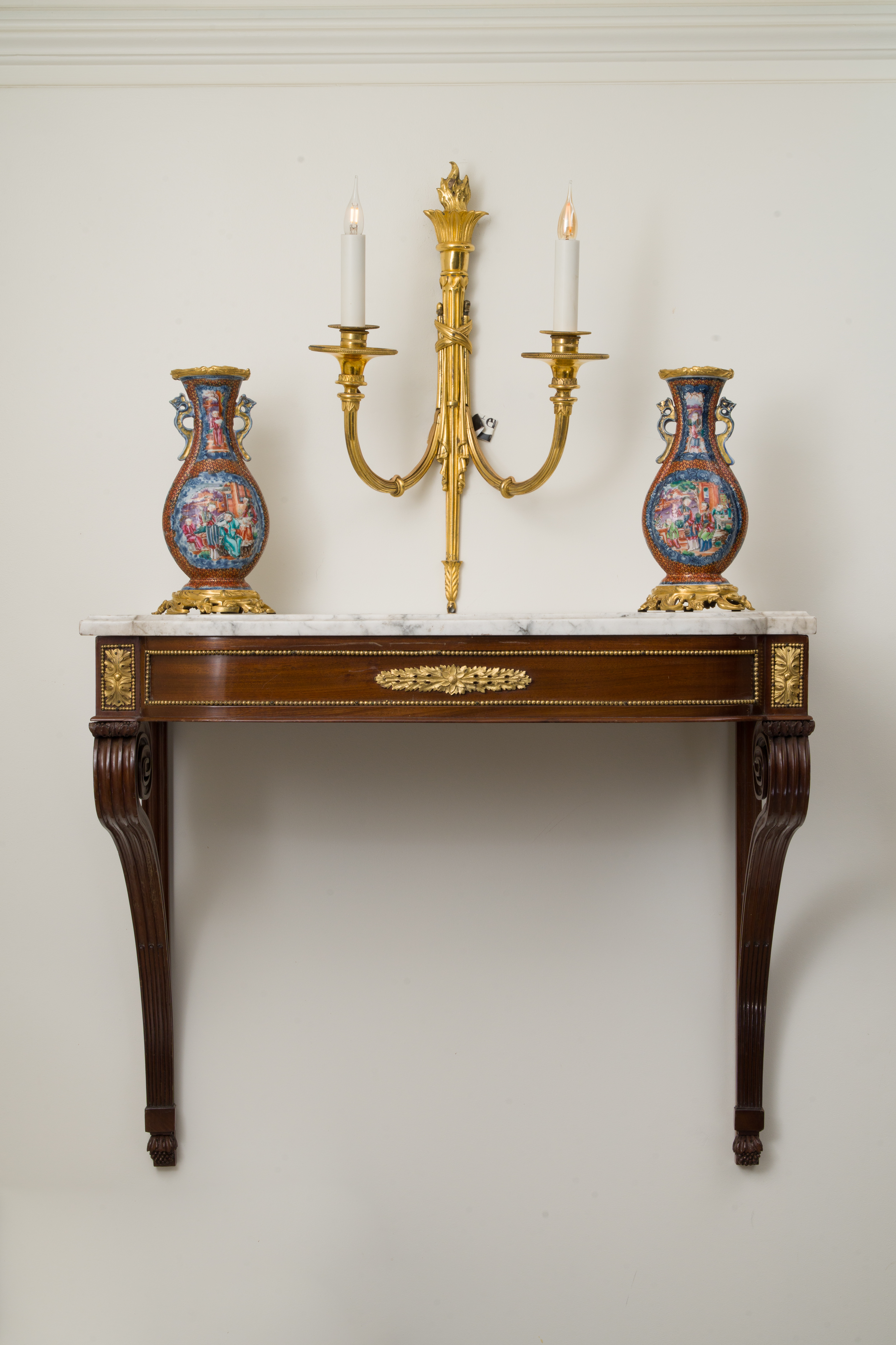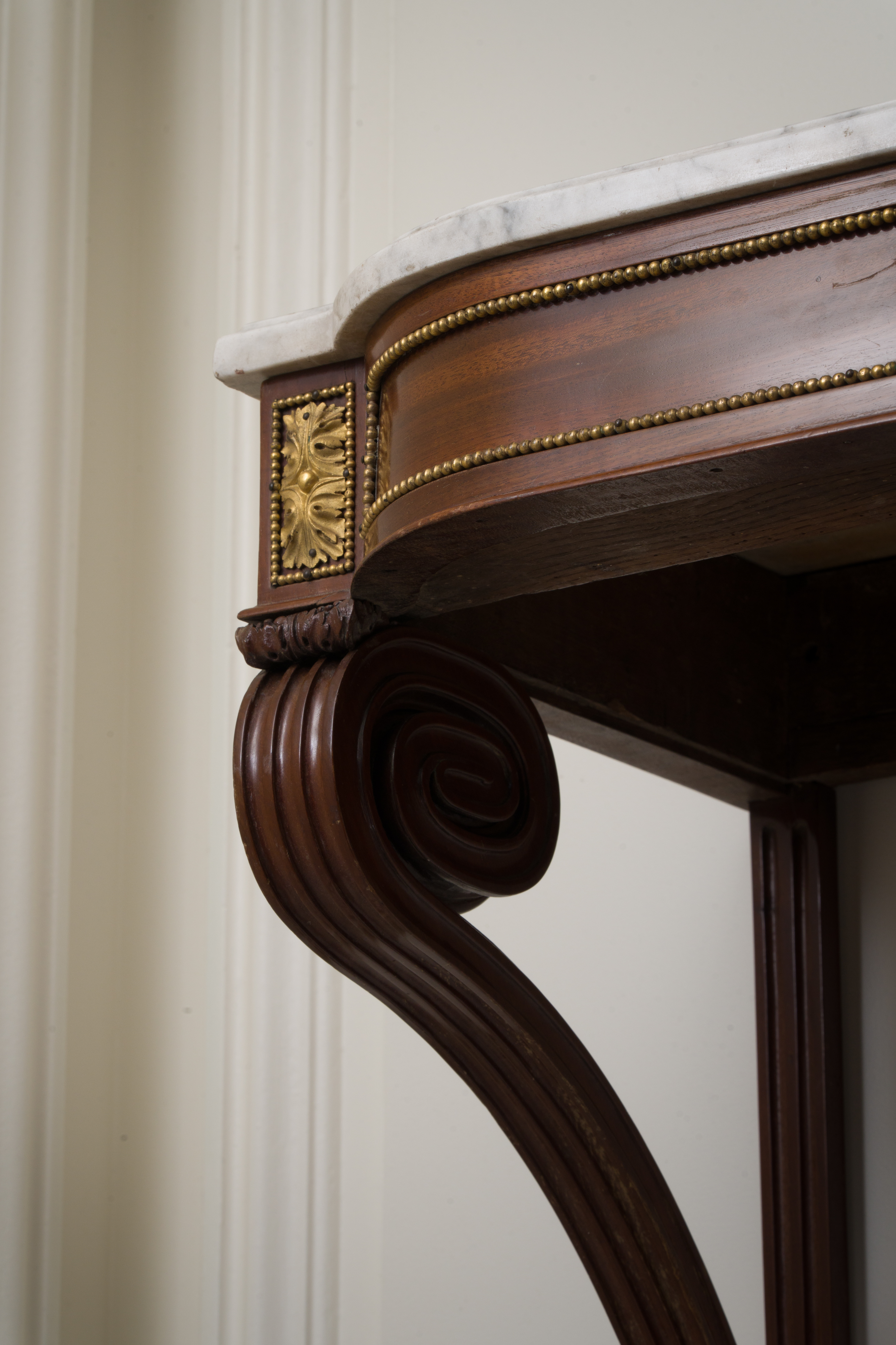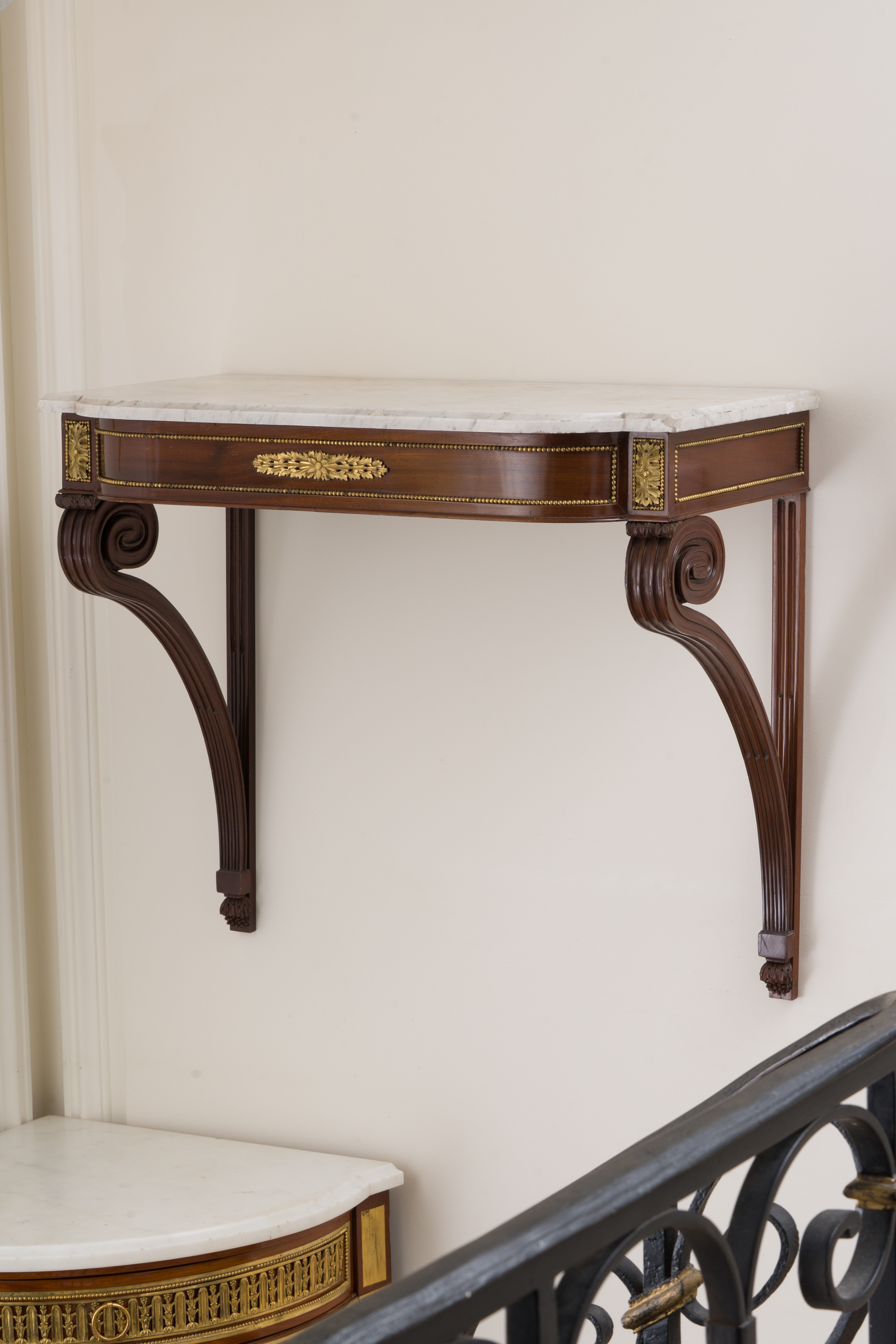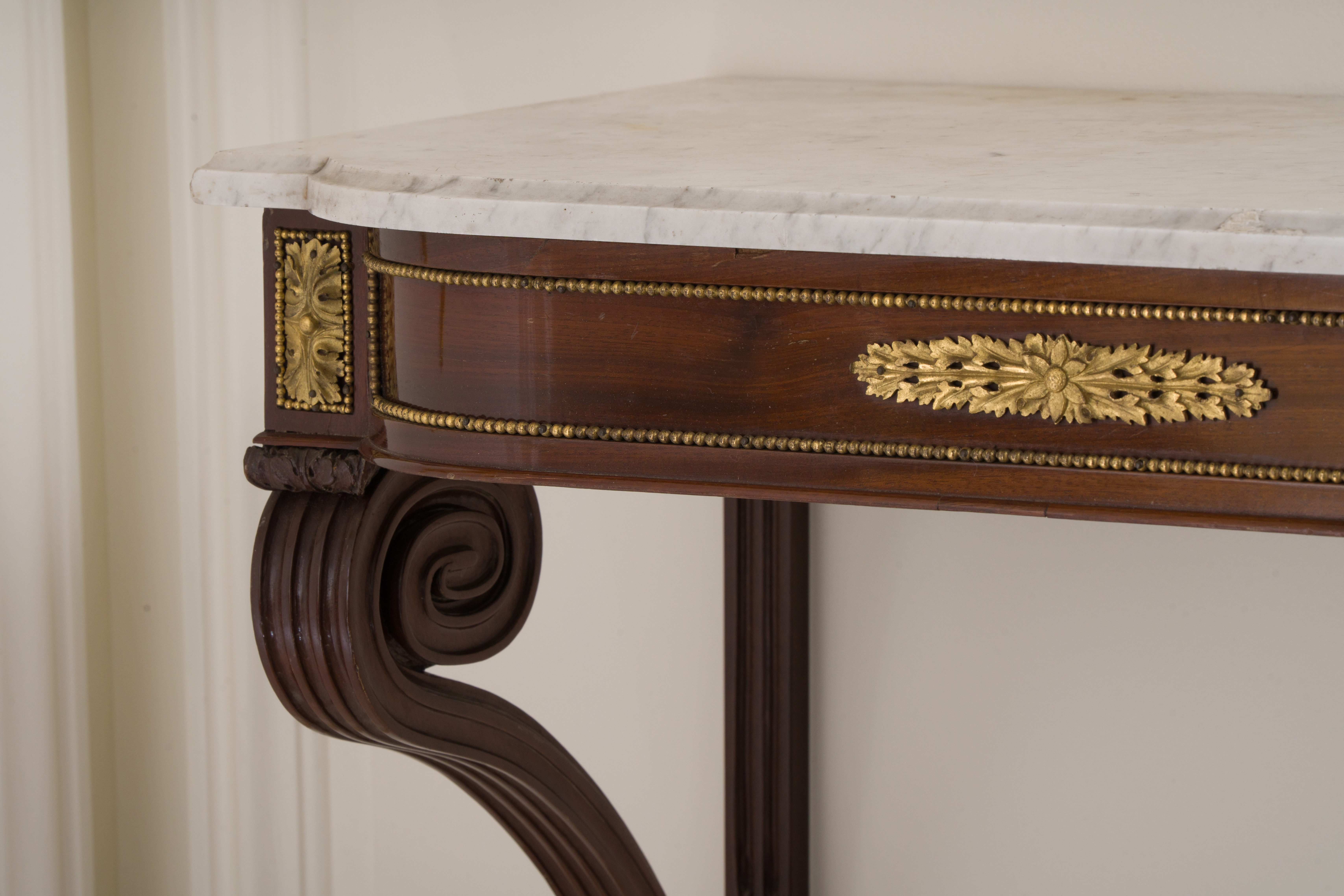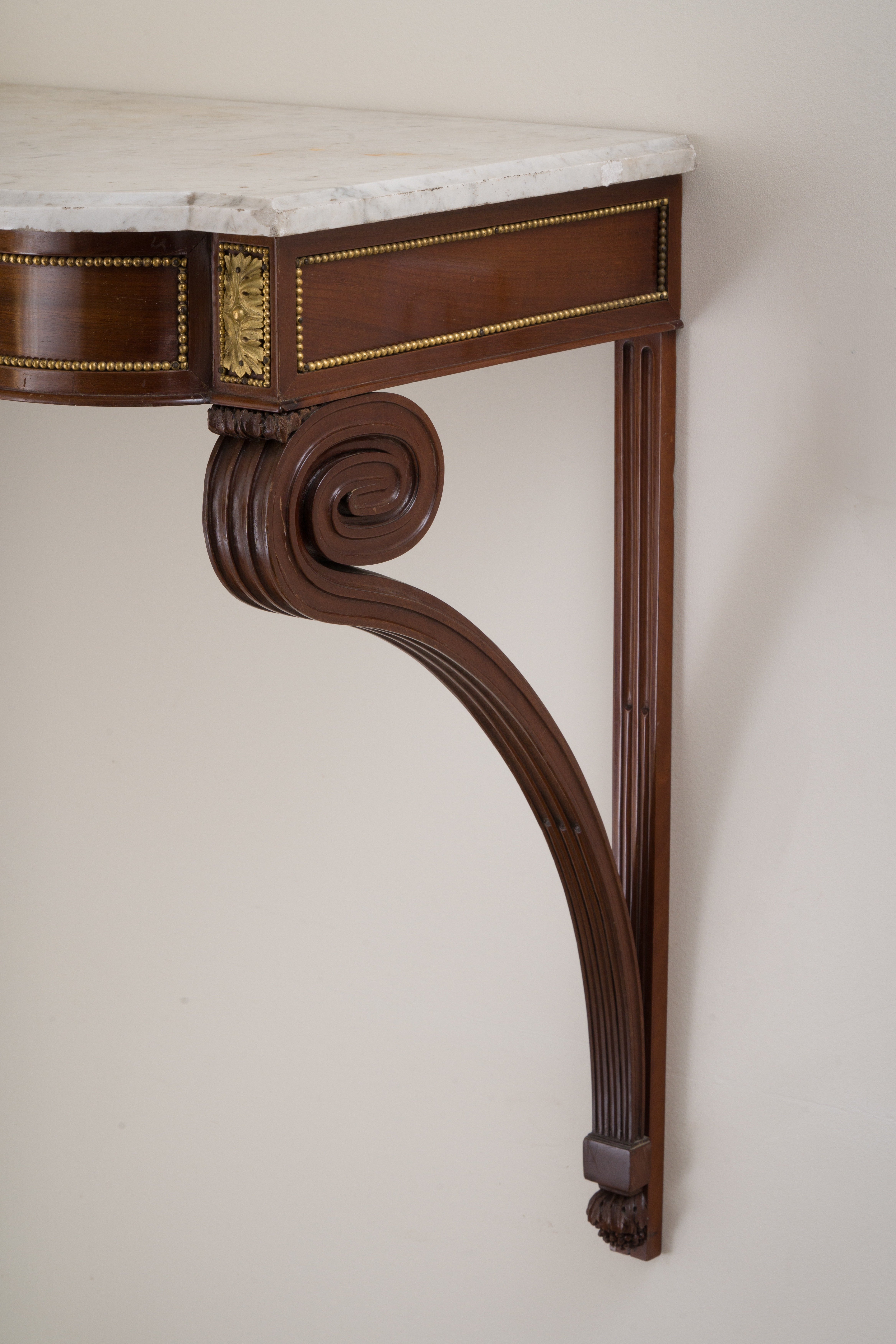 Paire de consoles en acajou et placage d'acajou à façade mouvementée et arrondie. Elles reposent sur des montants cannelés et rudentés terminés en spirales. Des bronzes feuillagés et dorés, finement ciselés, sont encadrés par des frises de perles. Estampillée CASPAR SCHNEIDER, ébéniste reçu maître le 15 mars 1786, et porte la marque JME. Dessus de marbre de carrare blanc. Notre paire de consoles porte aussi la marque du château de Saint-CLoud. Epoque Louis XVI. H. 64 L. 75 P. 39 cm Restauration prévue.