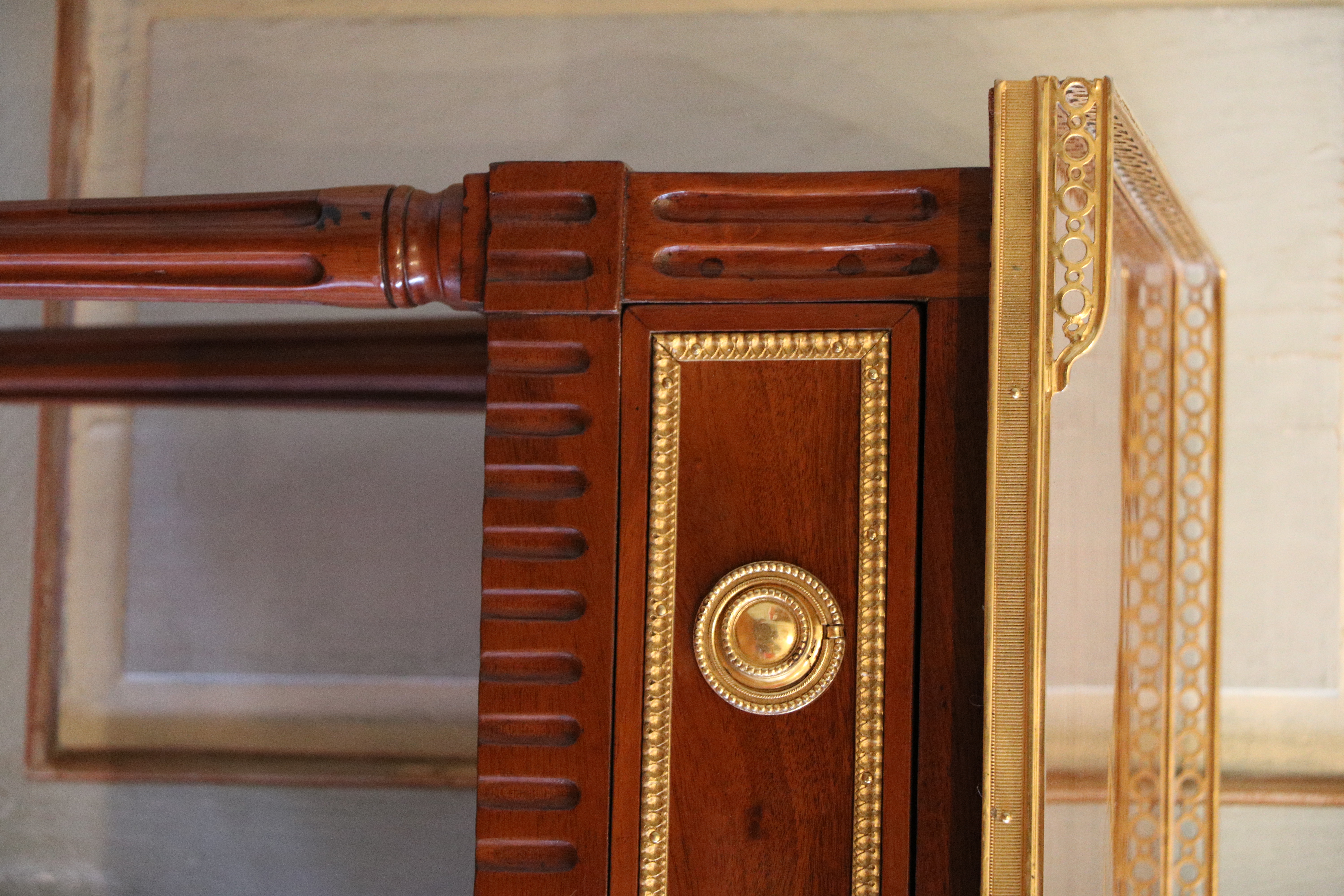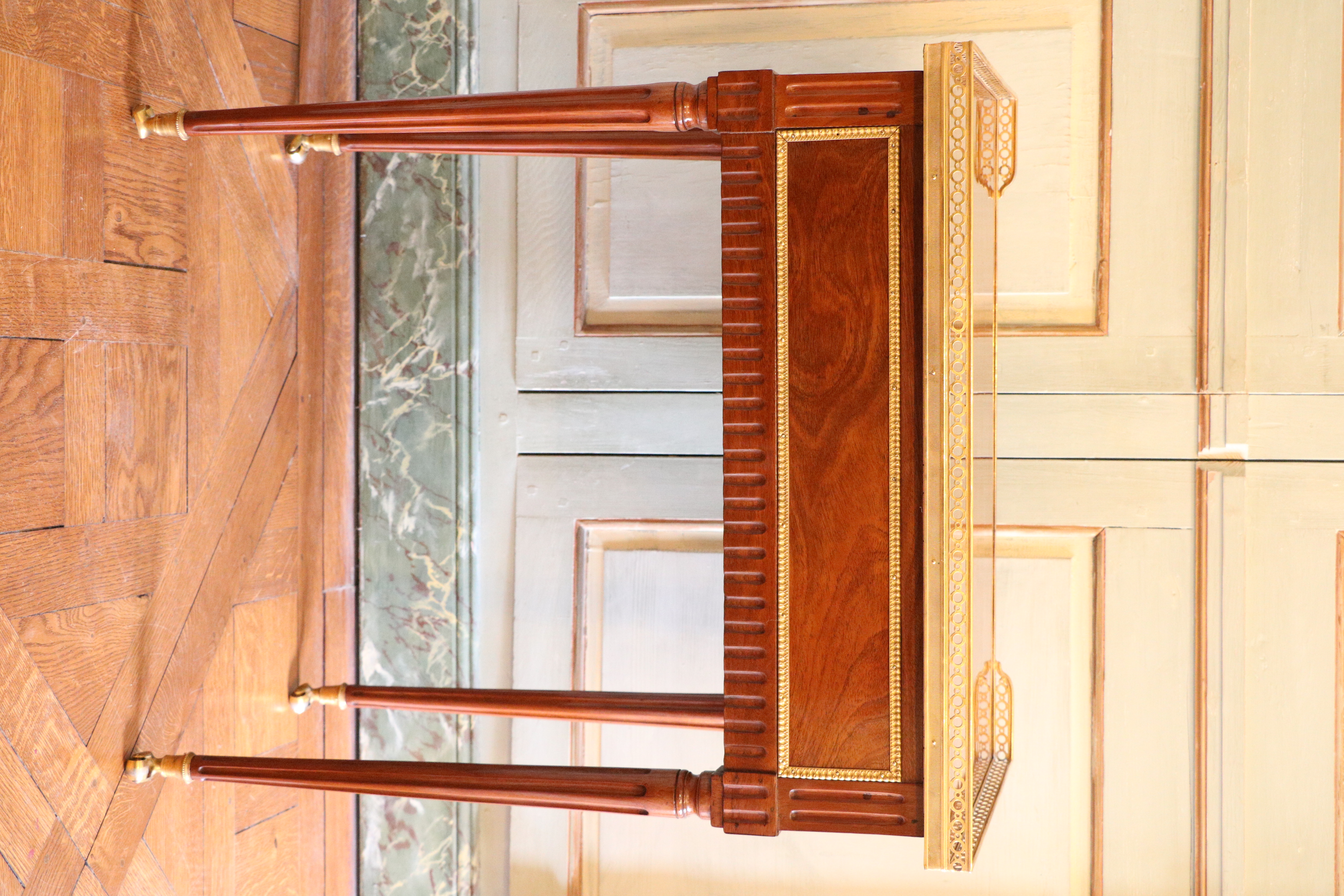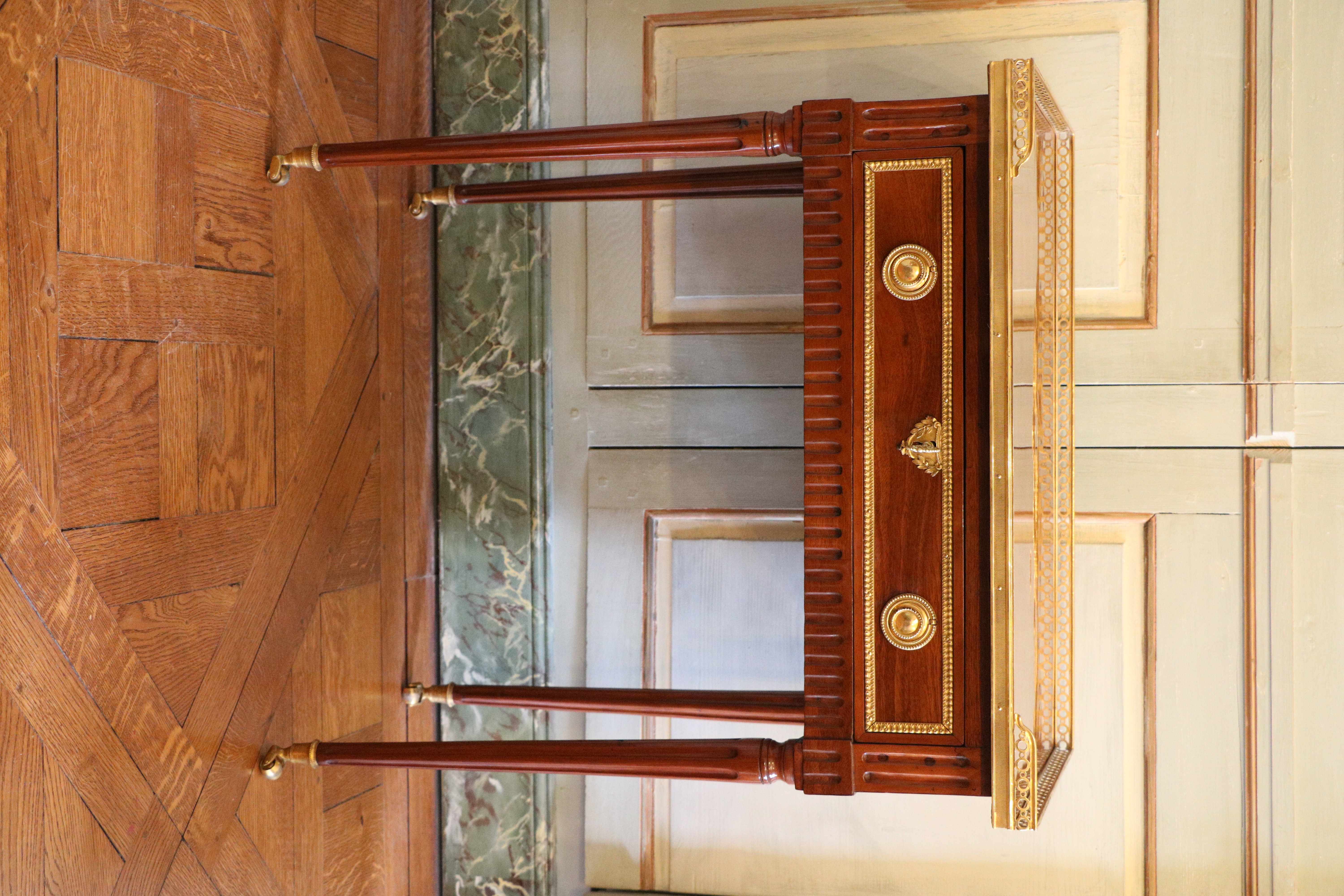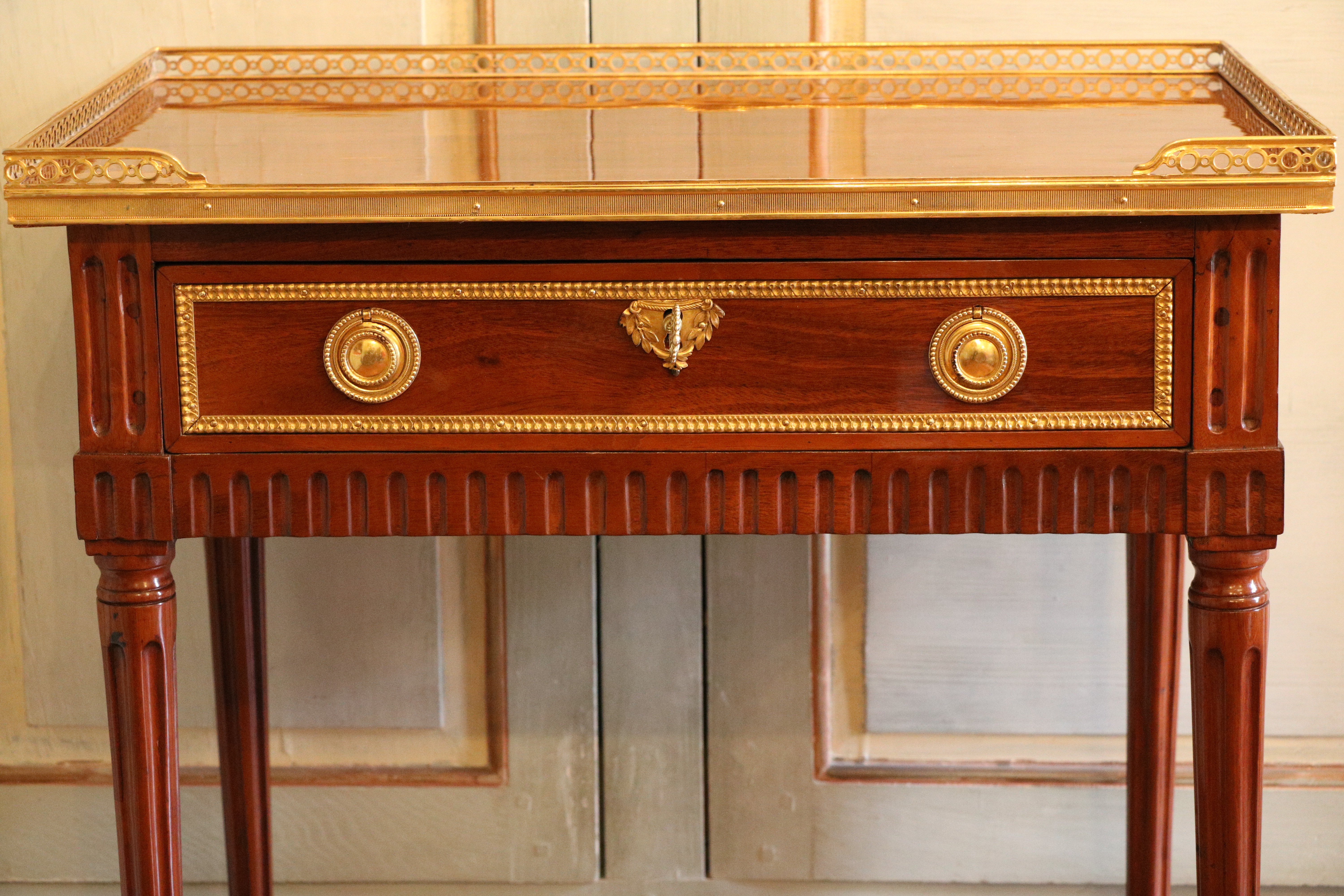 Table en acajou et bronze doré, ouvrant par un tiroir dotés de deux poignées rondes et perlées. Le tiroir comme ses côtés sont encadrés d’une frises de perles en bronze doré. En dessous, et sur les dés de raccordement, une succession de cannelures. La galerie constituée d’une frise de cabochons ajourés s’efface sur le devant du meuble. Les pieds cannelés se resserrent sur des sabots en bronze doré sur roulettes. Epoque Louis XVI Etat d'usage H. 76 x L. 67 x P. 45 cm